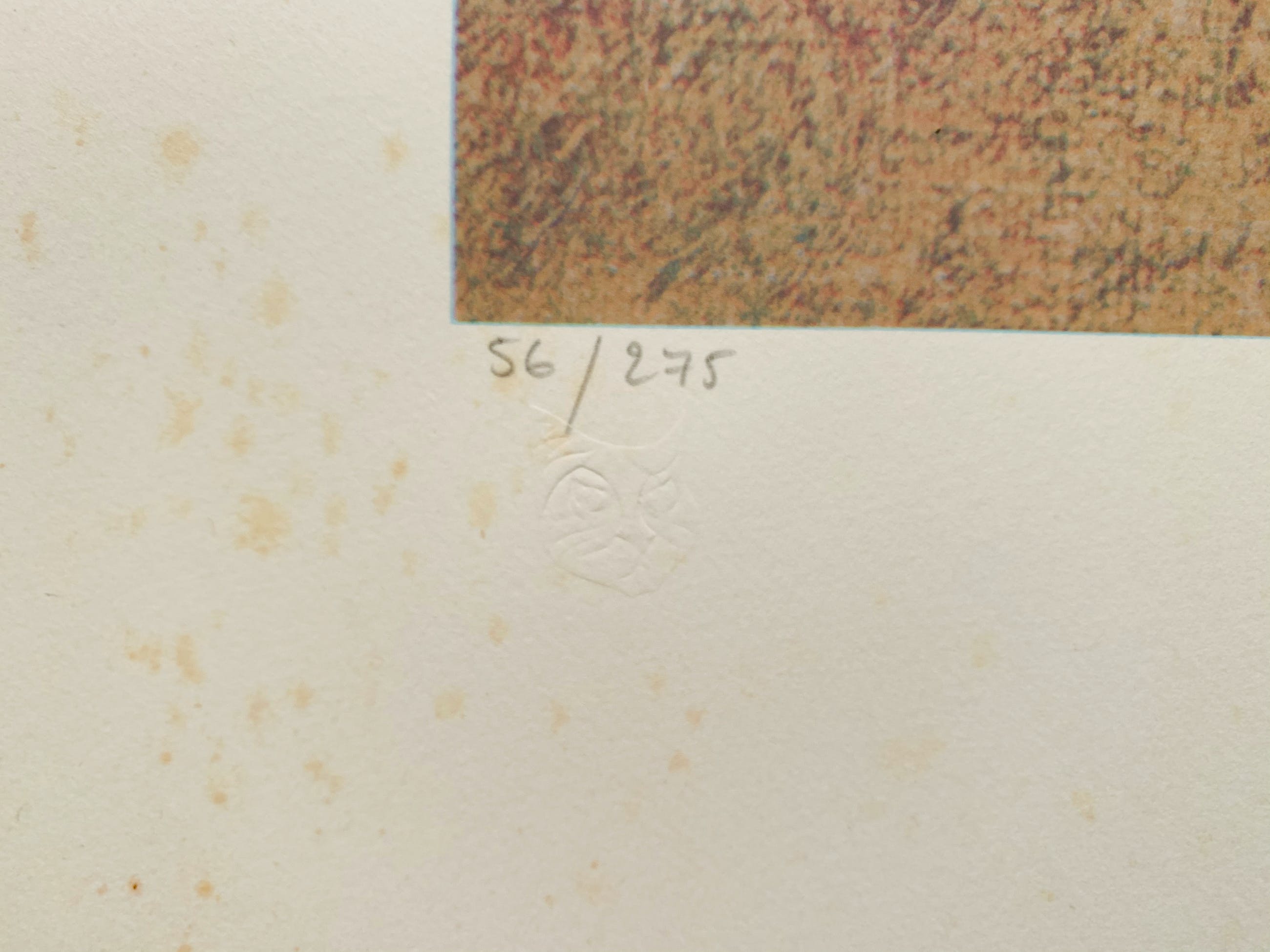 Conditie: ets goed. Vlekjes op vel zie foto's. Afmeting afbeelding: 60 x 46 cm. Editie: 56/275. Nummers op de foto's kunnen afwijken. Papiersoort: BFK Rives. Nooit ingelijst. Wordt verzekerd verzonden in een stevige kartonnen koker.