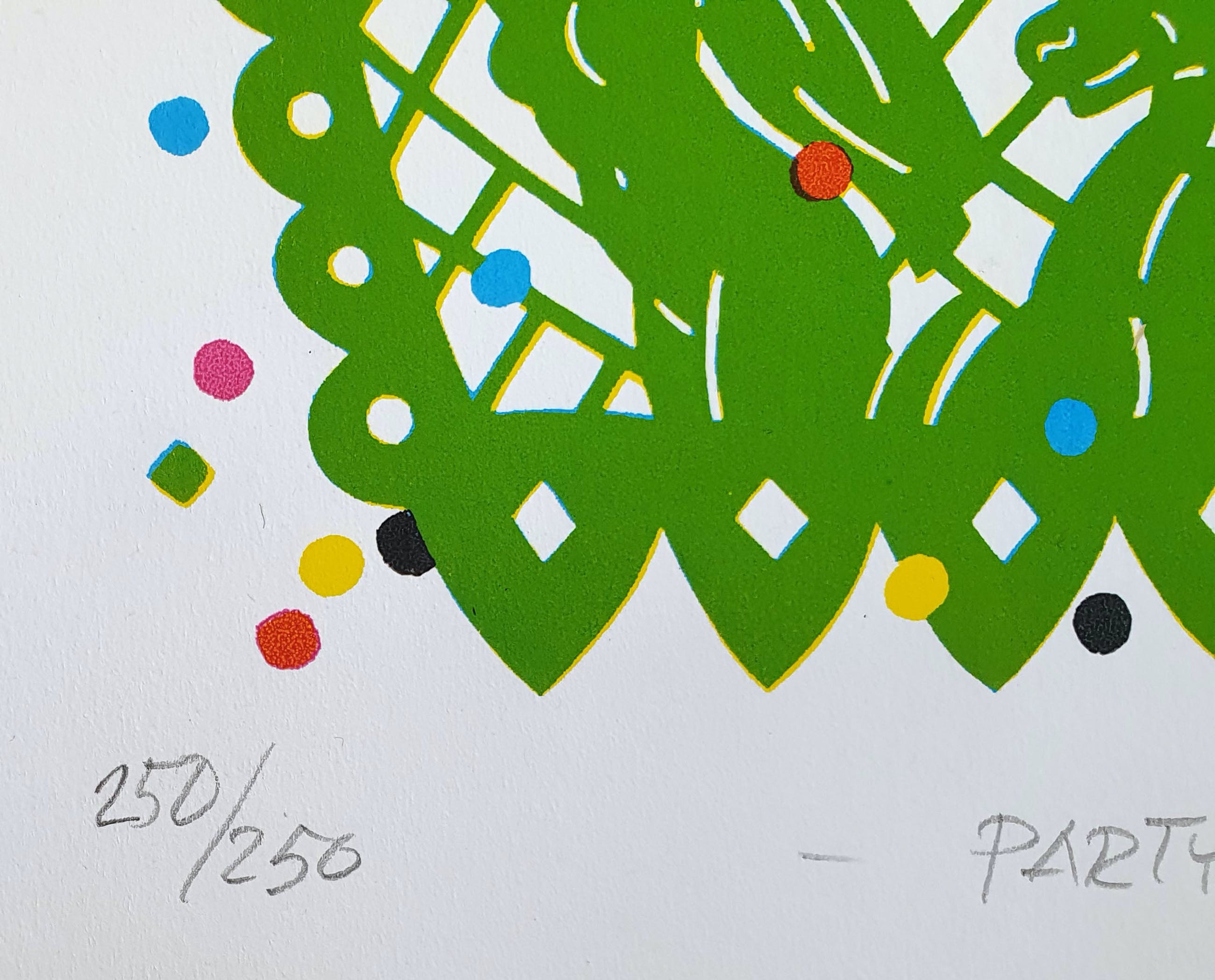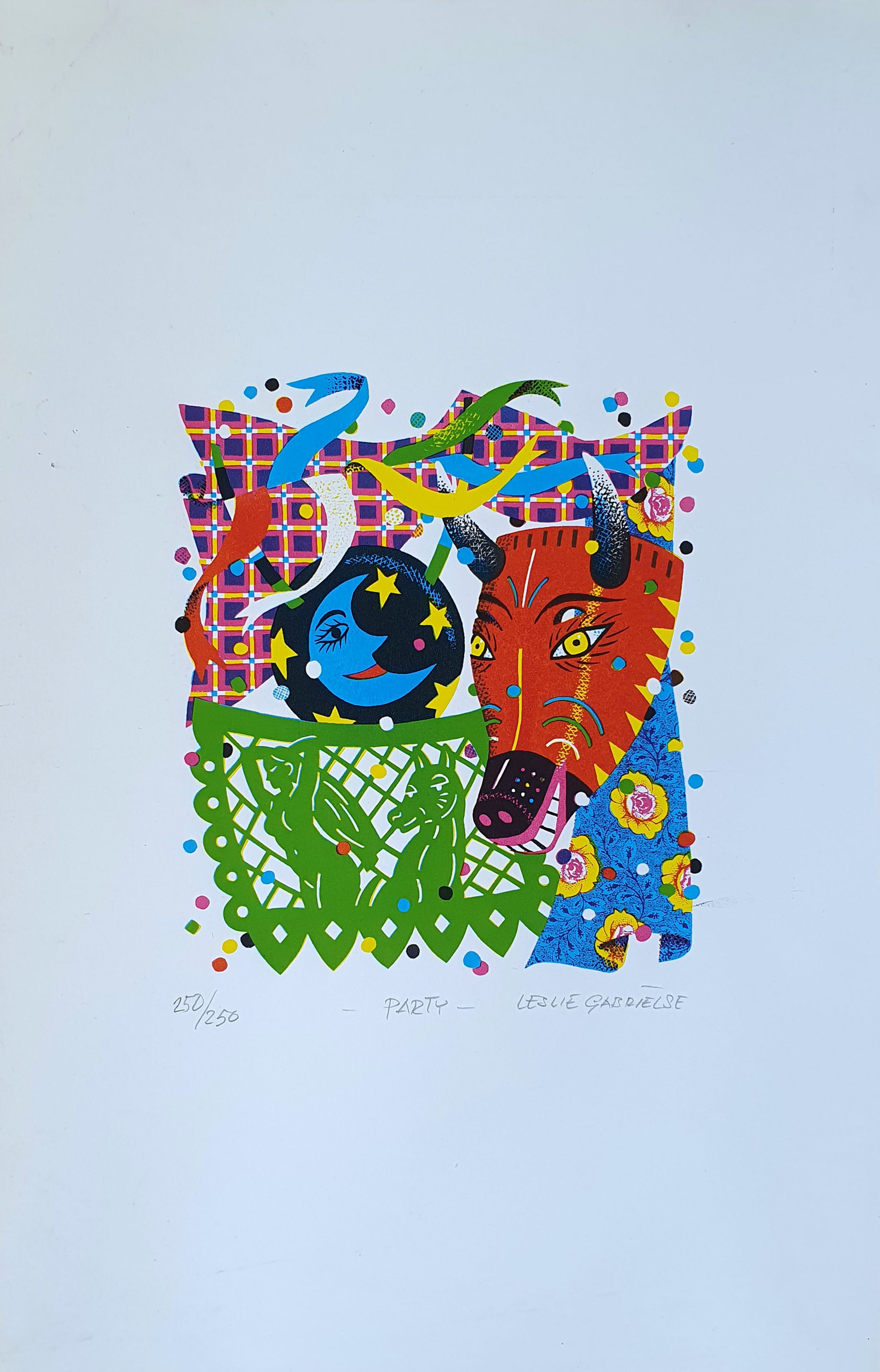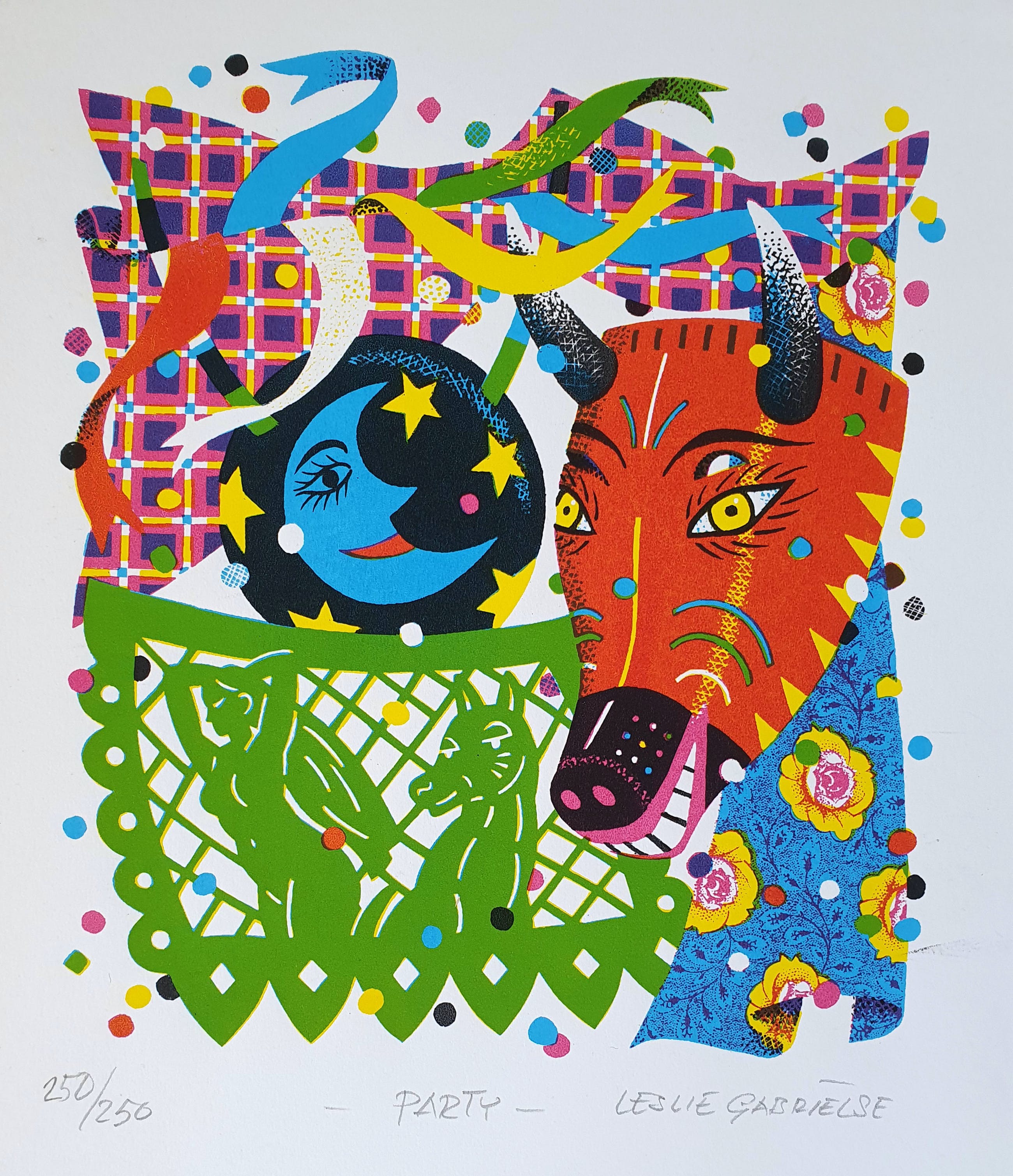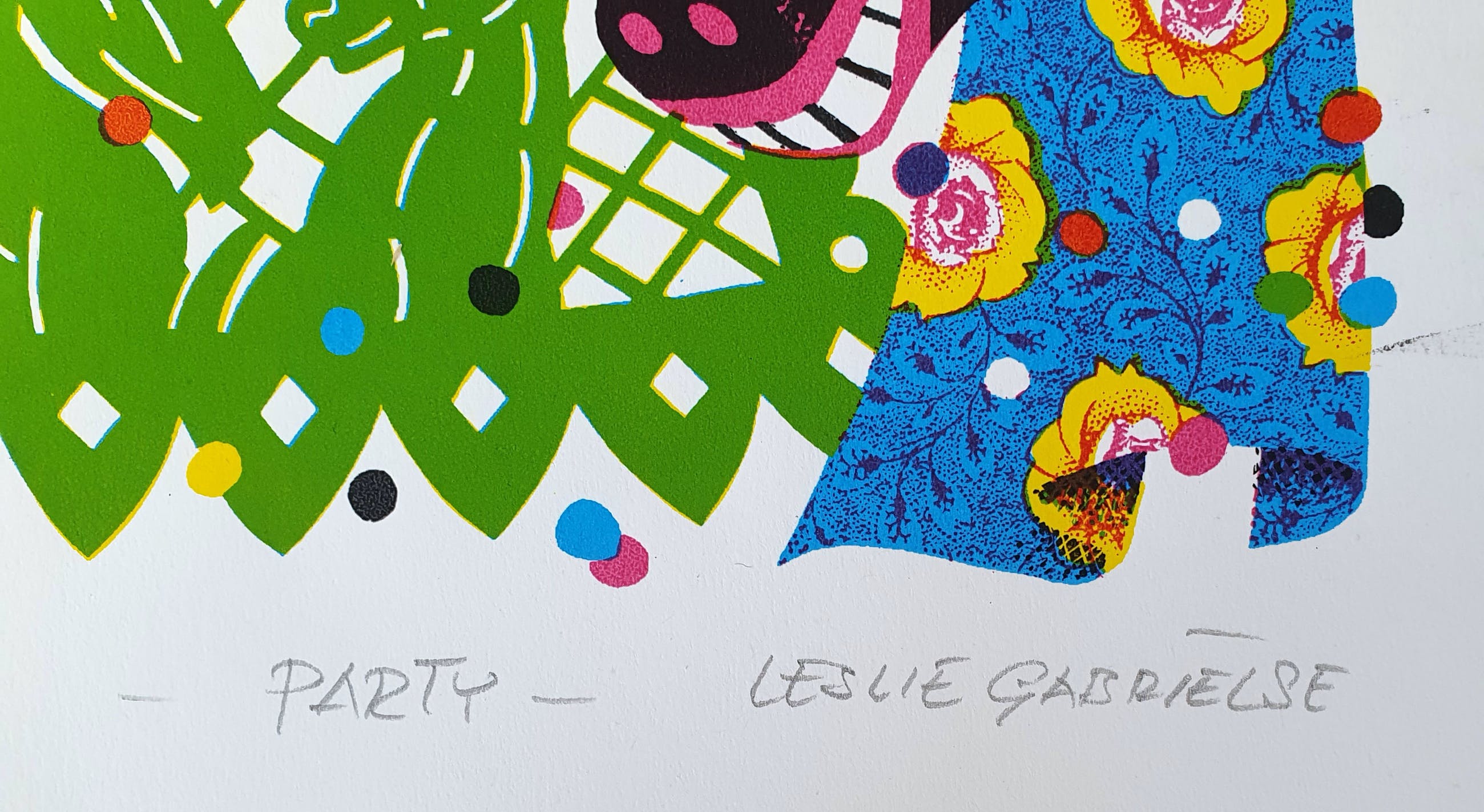 Zeefdruk uit van Leslie Gabrielse met de titel: 'Party'. Het werk is rechtsonder met de hand gesigneerd door de kunstenaar.