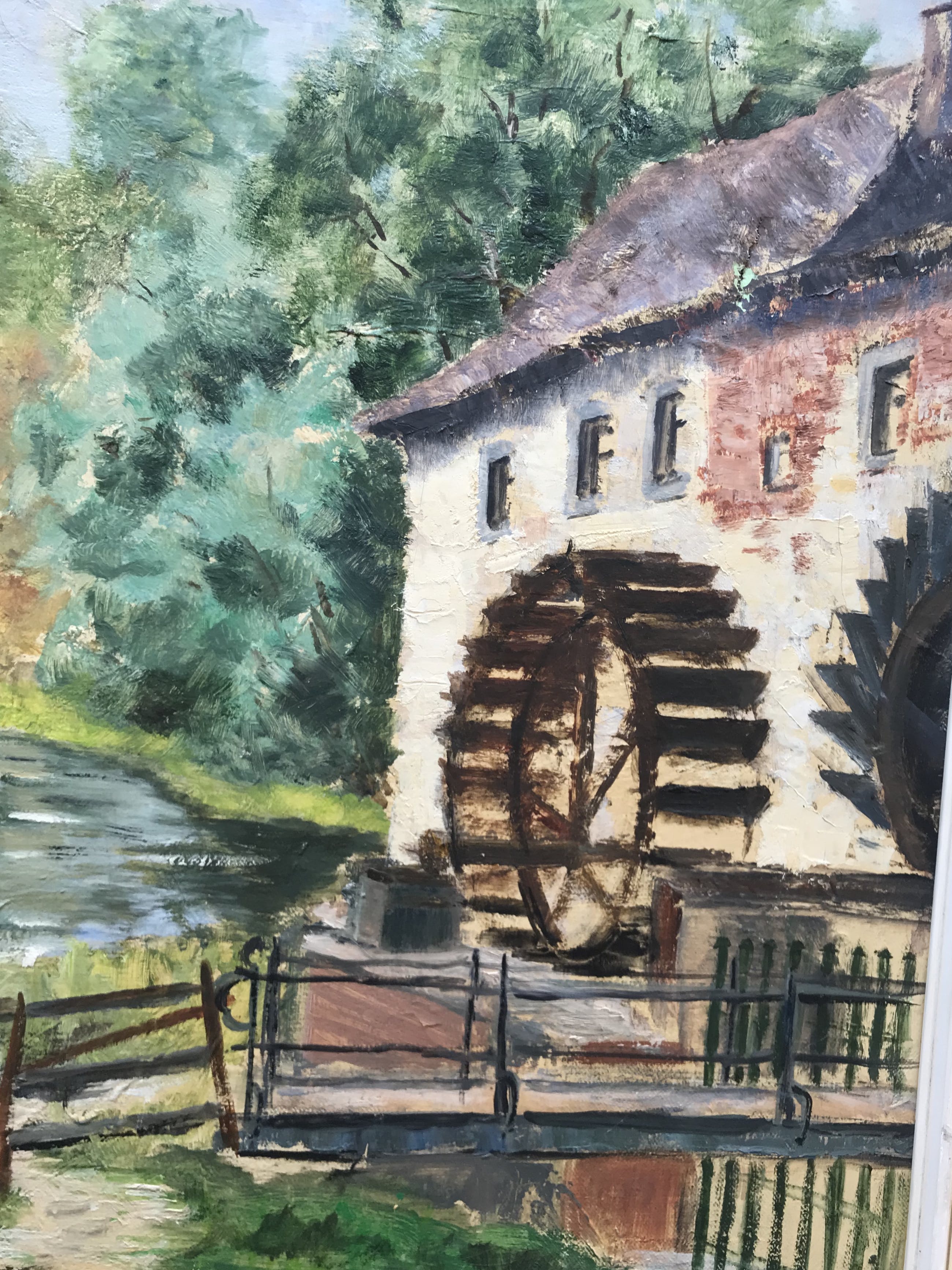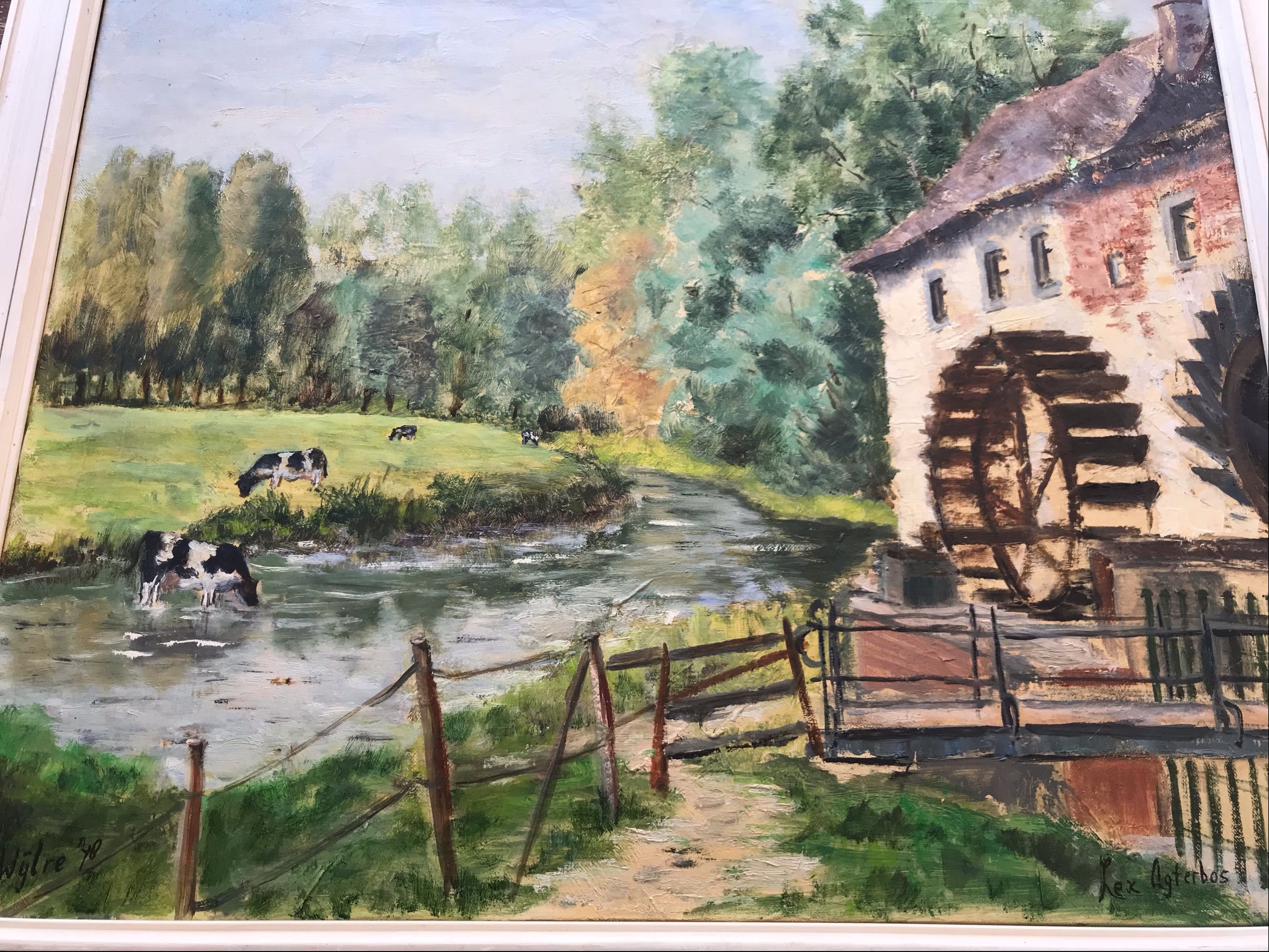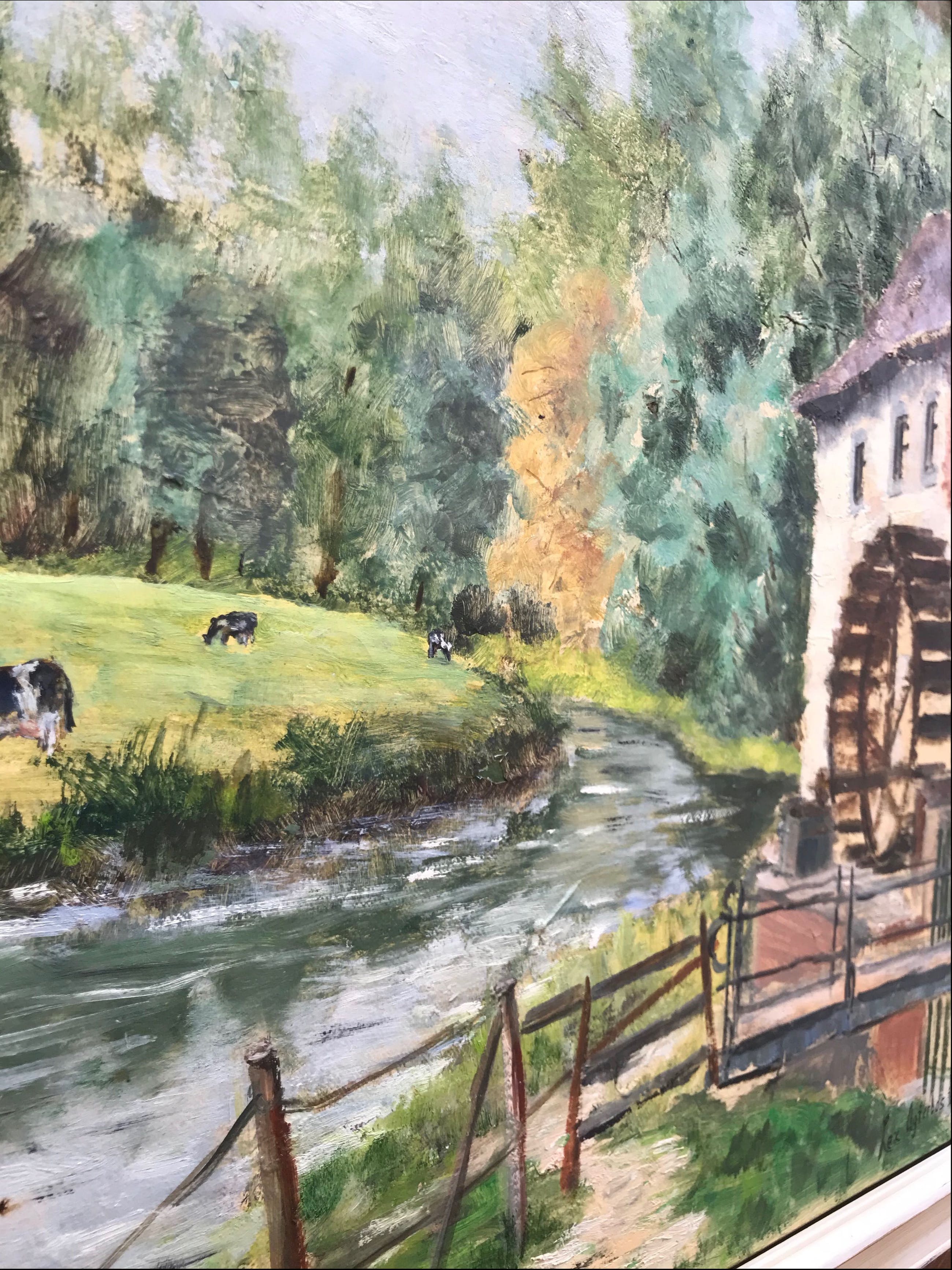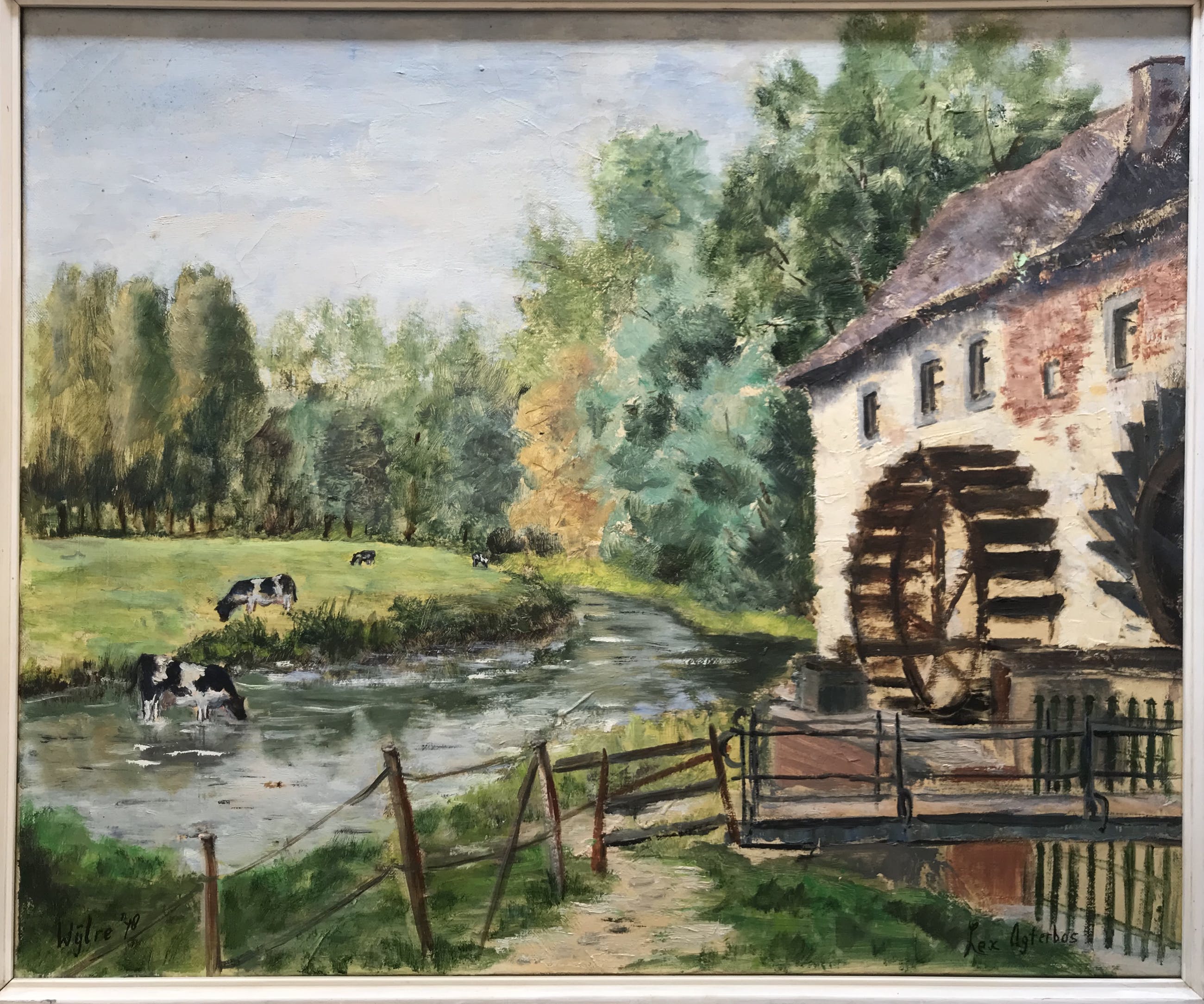 Olieverf schilderij op doek van Hermina Thea "Lex" Agterbos (1933-2018), de watermolen van Wijlre (Zuid-Limburg, Nederland)