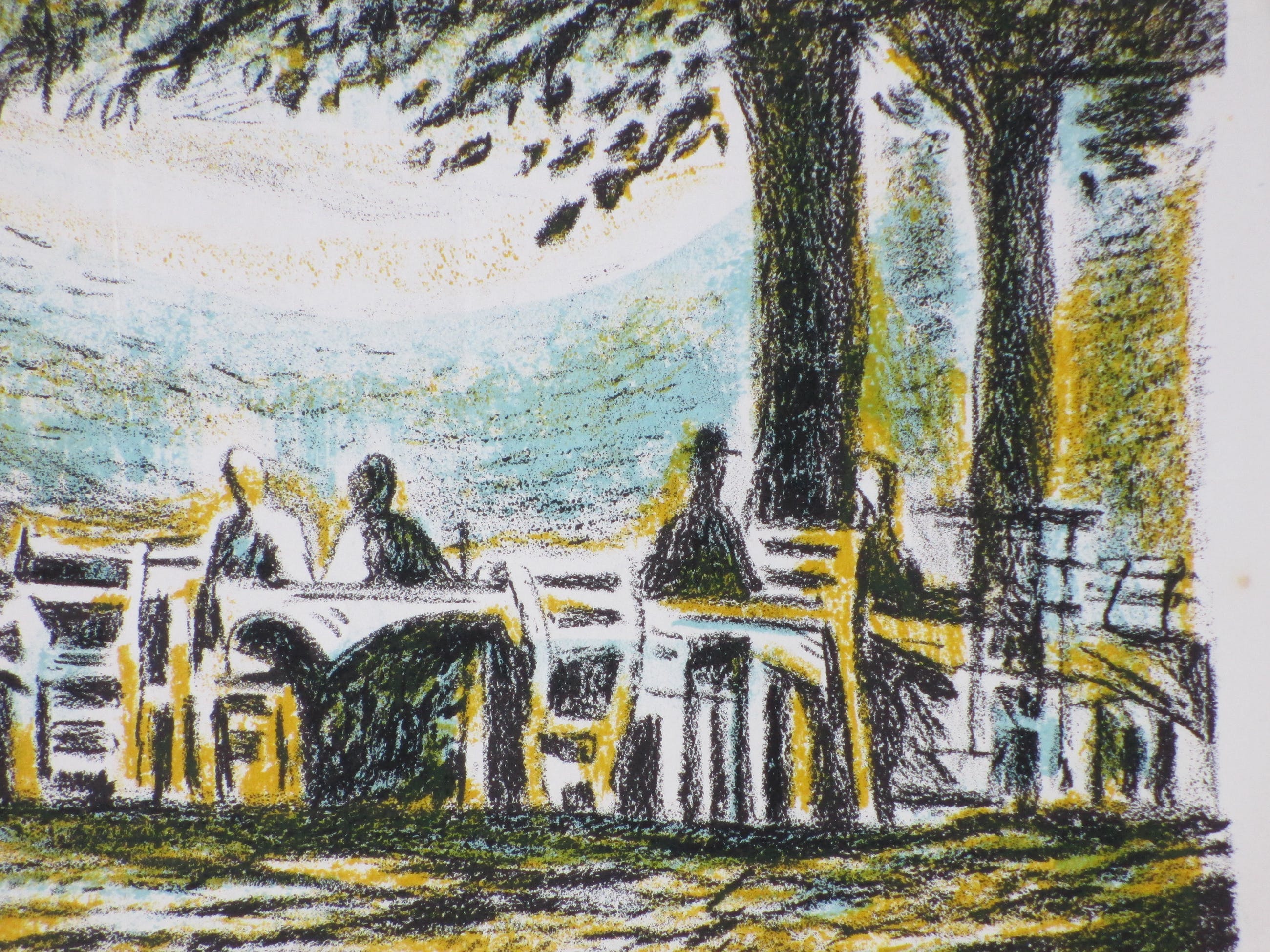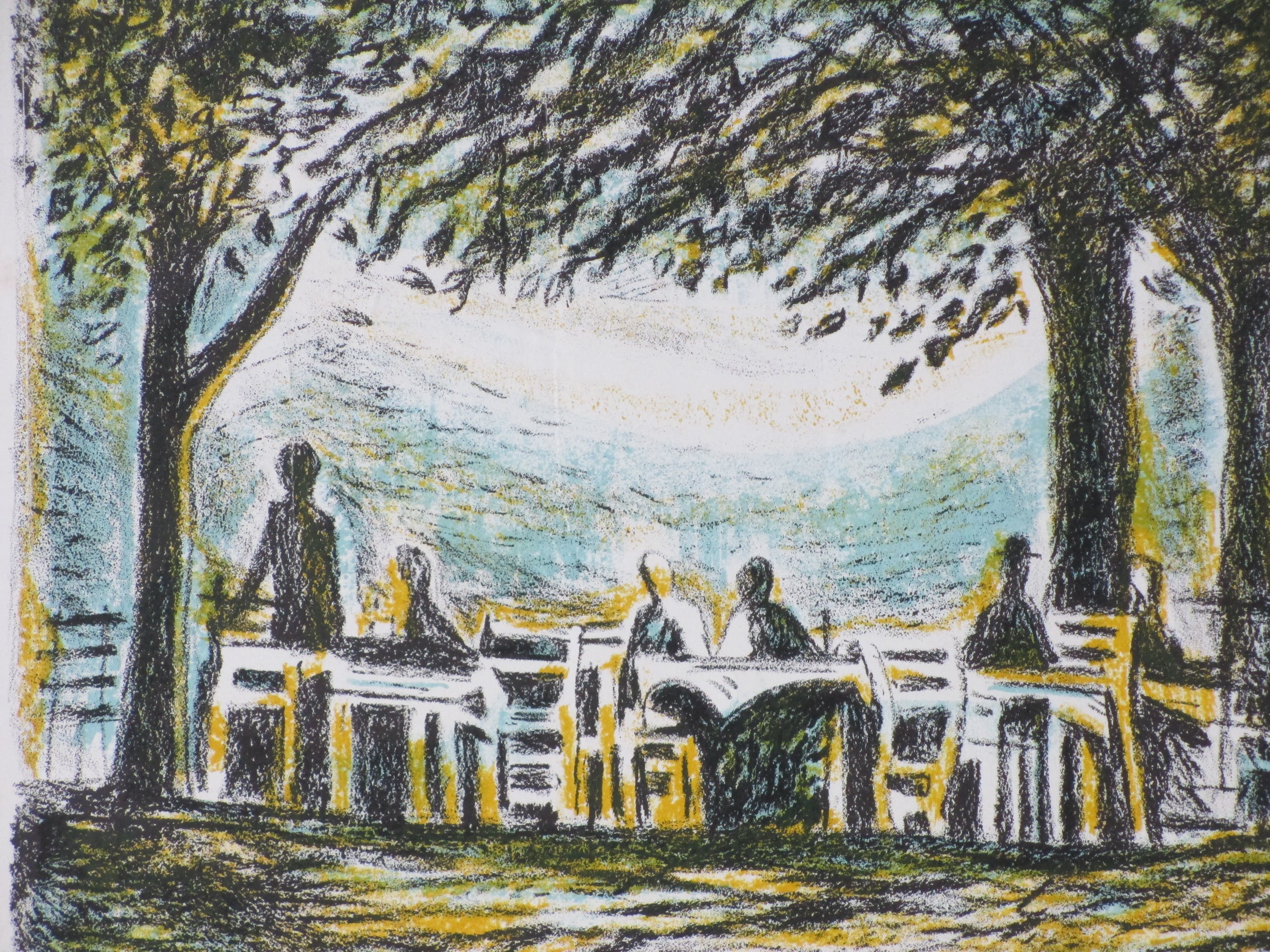 Kleurenlitho door Lex Metz Voorstelling van figuren op een zonnig terras Losbladig, beeldmaat 26x30, bladmaat 35x50 Gesigneerd in potlood r.o.: 'Lex Metz' Tevens gemonogrammeerd r.o. in de druk: 'LM' Authenticiteit volledig gegarandeerd