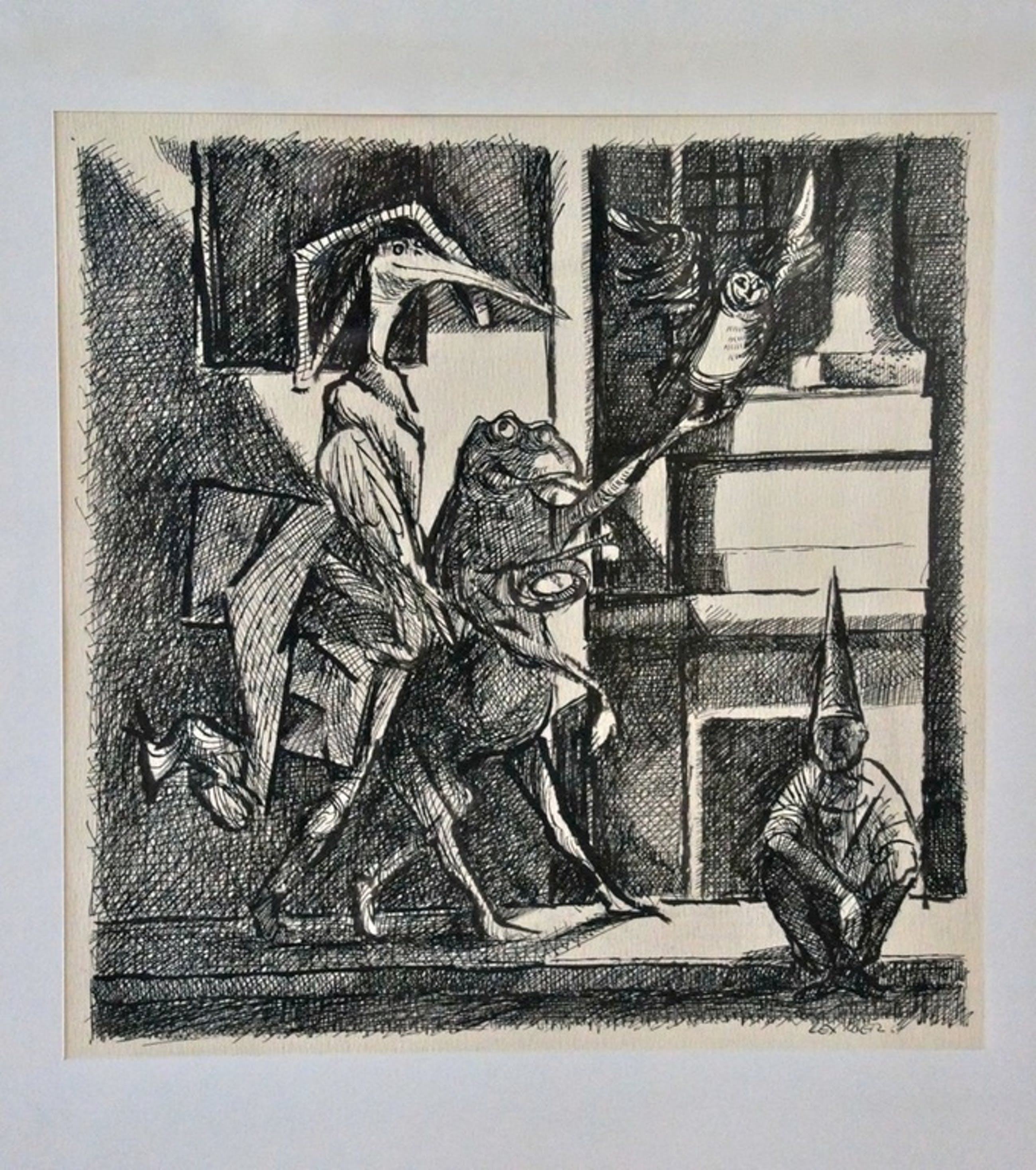 Originele inkt tekening, gesigneerd 64 . Authentiek ingelijst in houten zilverkleurige lijst, maat lijst 68x53.