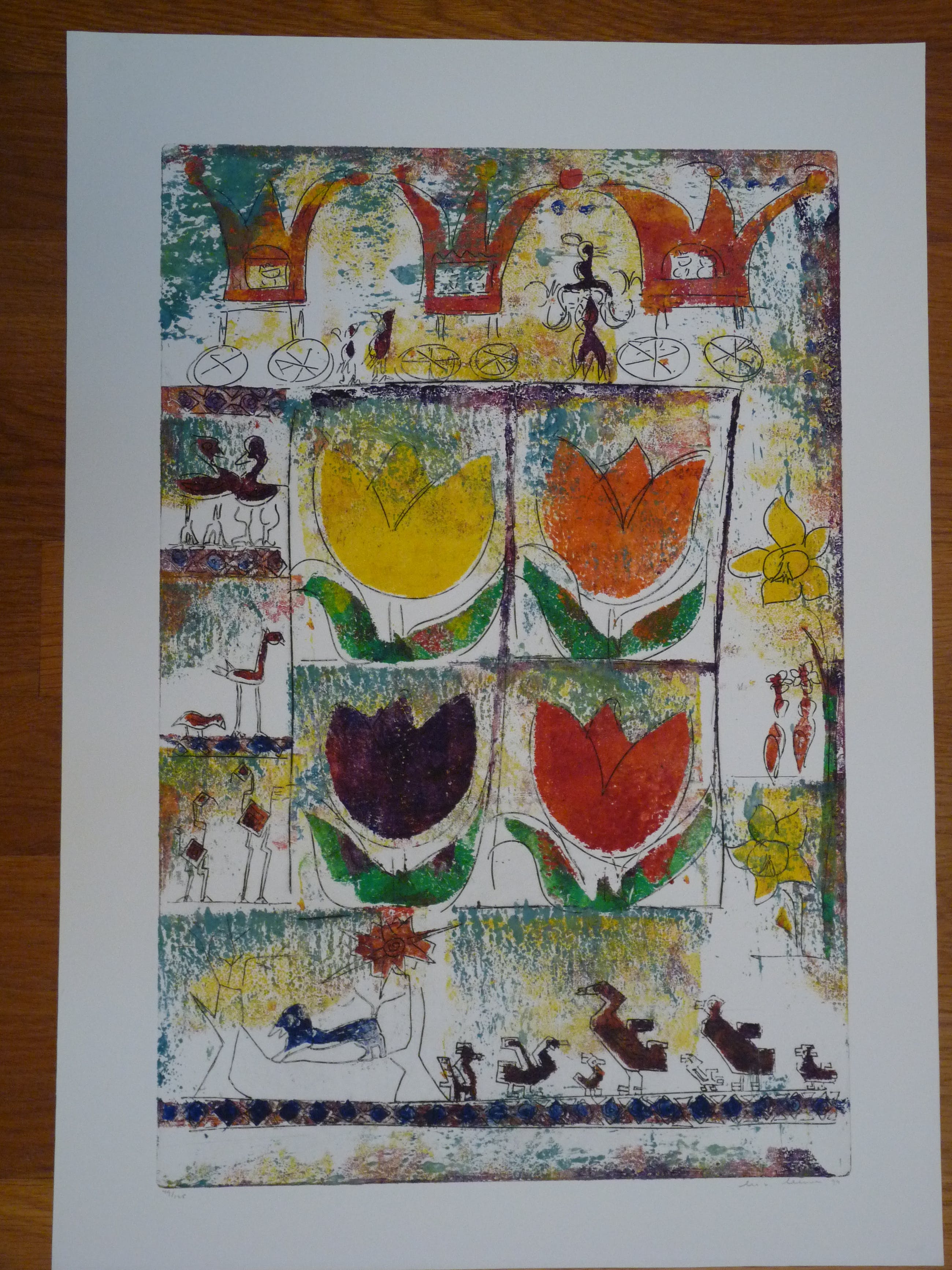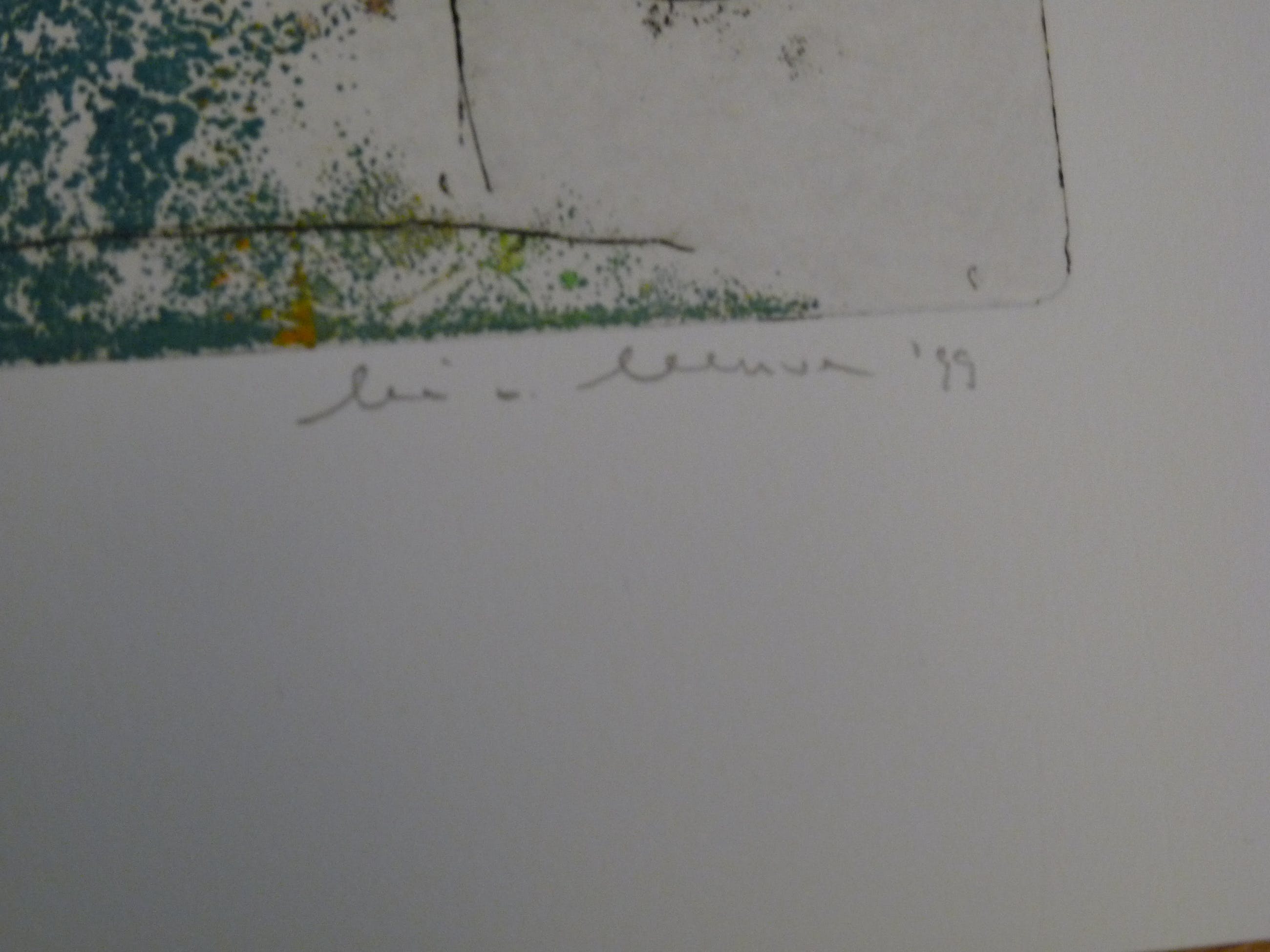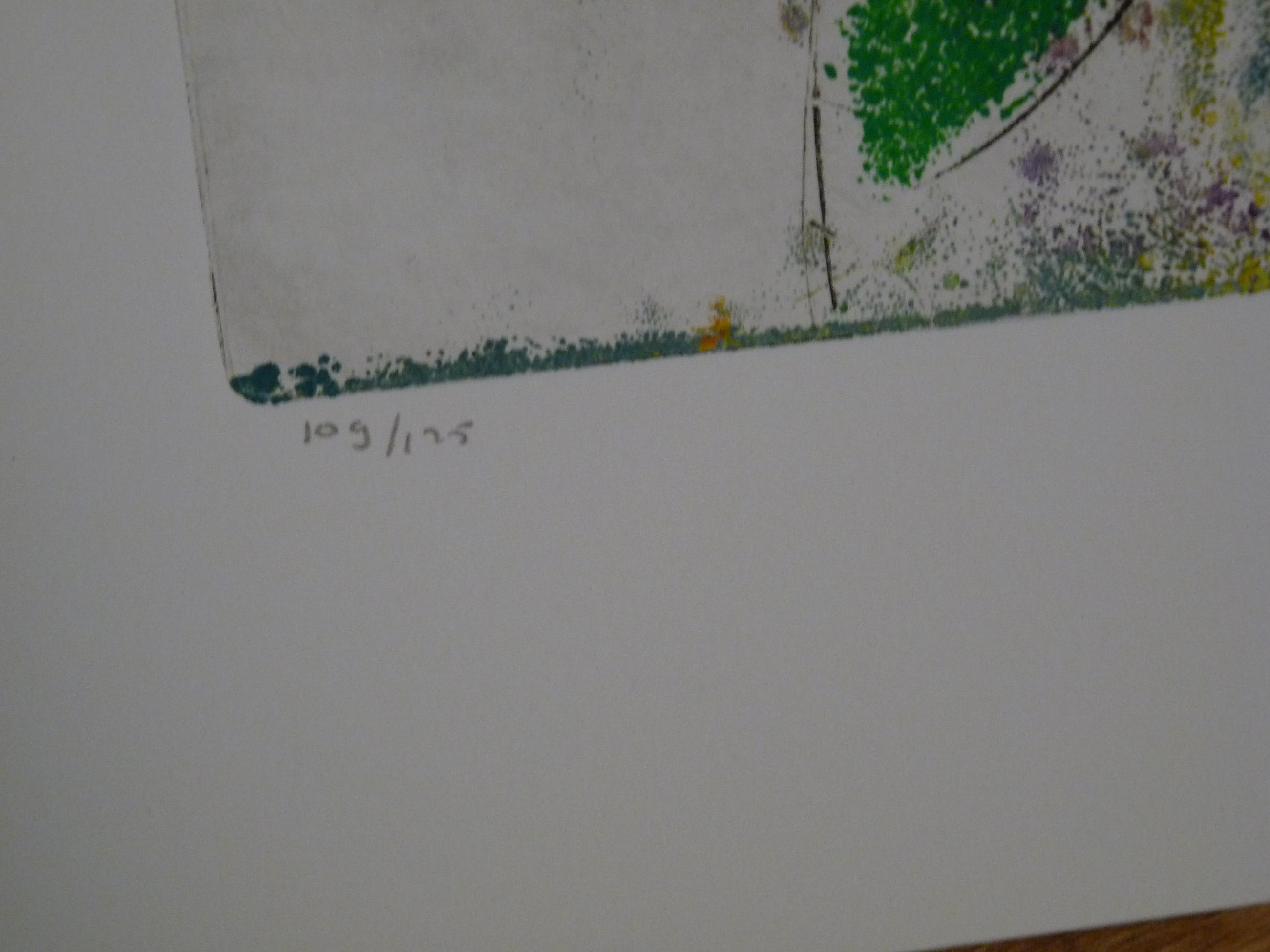 Twee verschillende fraaie kleurrijke etsen uit 1999. Allebei uit een oplage van 125. De ene is nummer 49, de ander 109. Afmetingen van beide bladen en afbeeldingen zijn gelijk. Blad 71 x 50,5 cm. Afbeelding 60 x 39,5 cm.