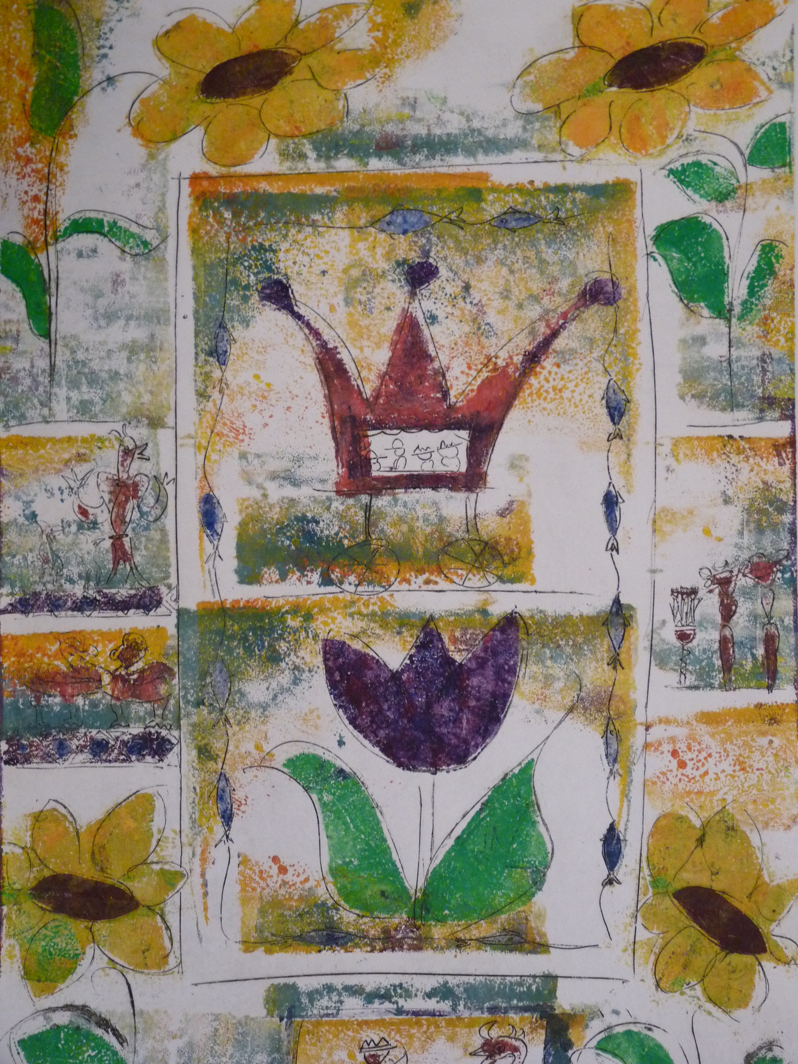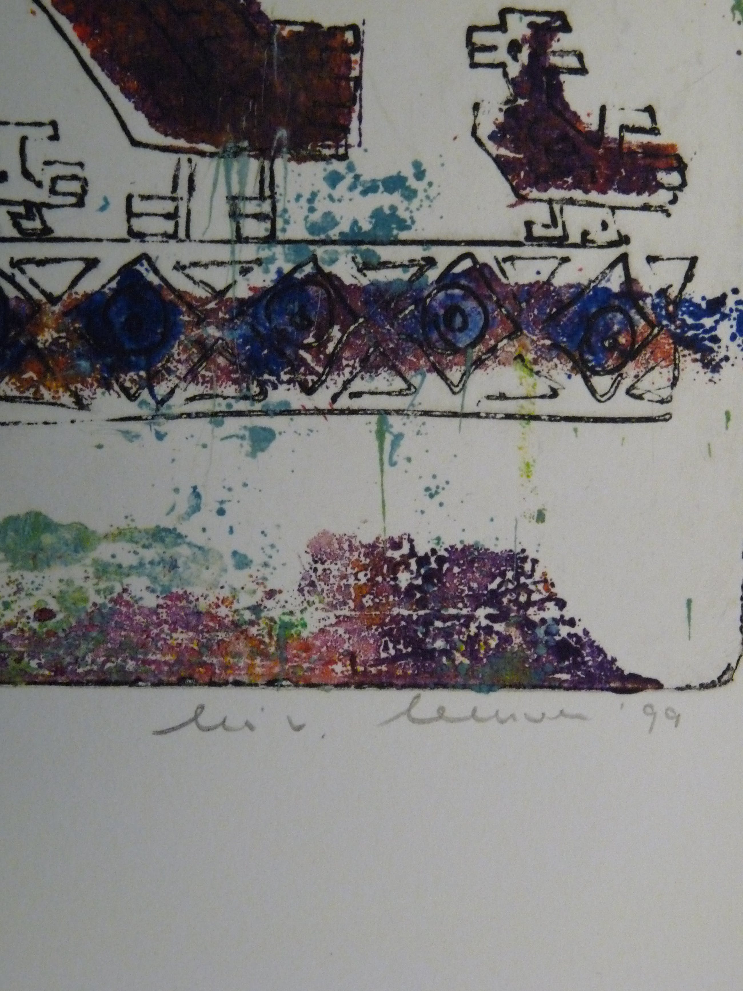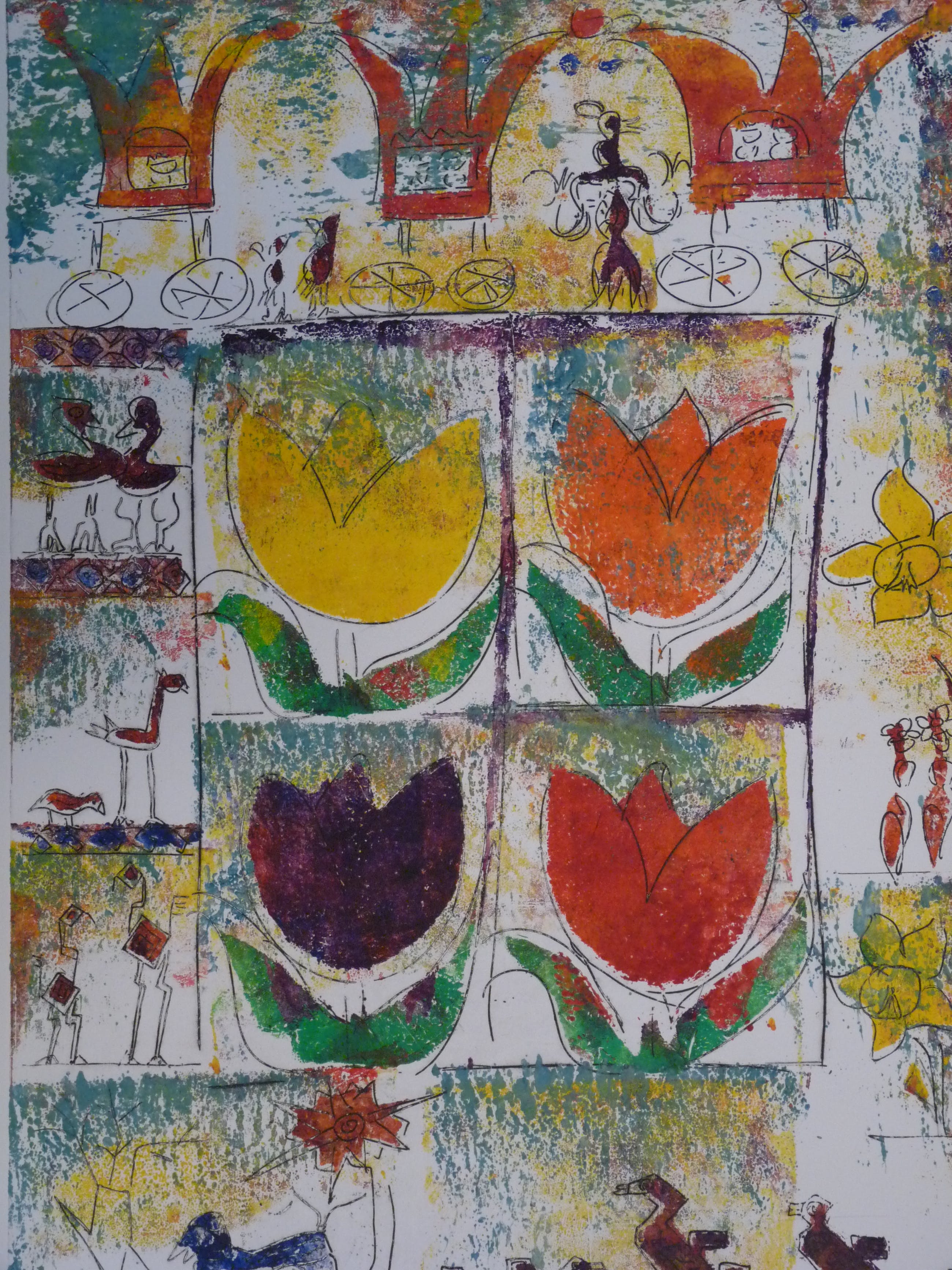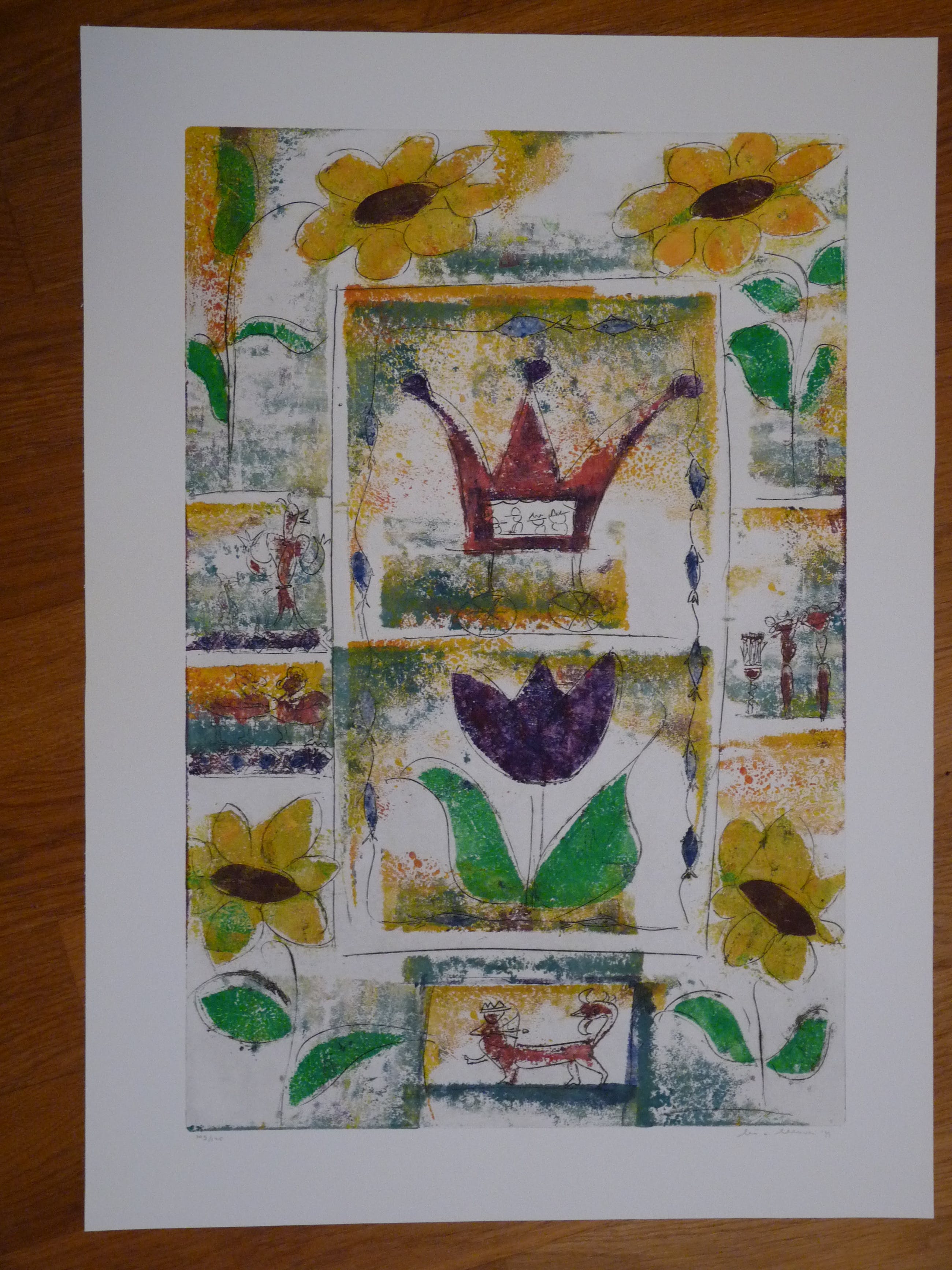 Twee verschillende fraaie kleurrijke etsen uit 1999. Allebei uit een oplage van 125. De ene is nummer 49, de ander 109. Afmetingen van beide bladen en afbeeldingen zijn gelijk. Blad 71 x 50,5 cm. Afbeelding 60 x 39,5 cm.