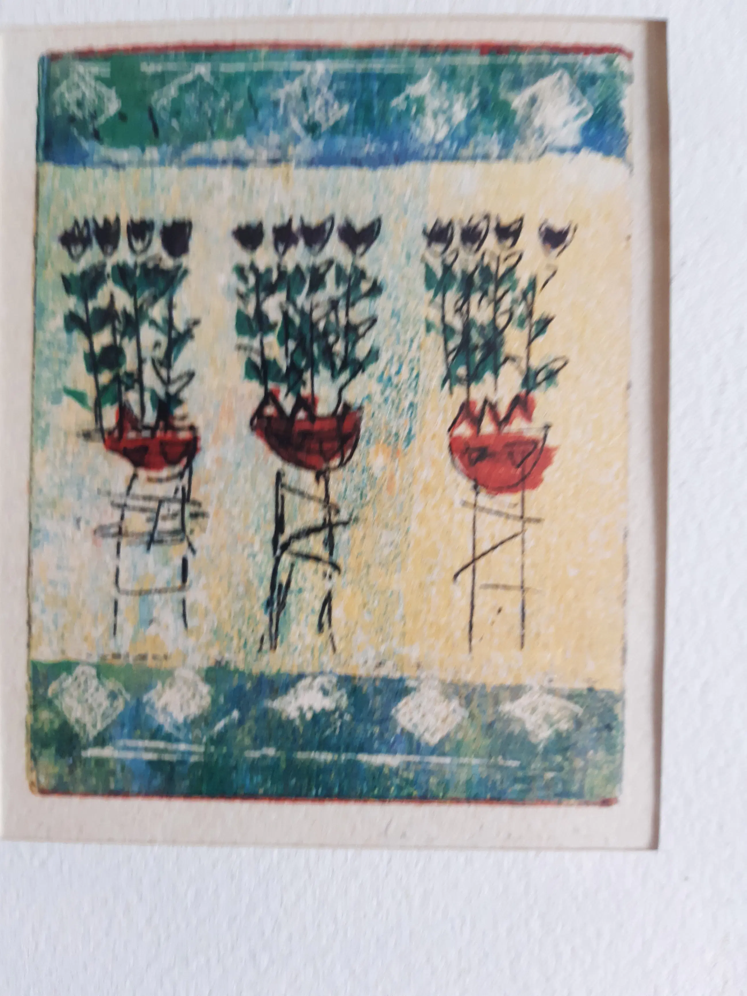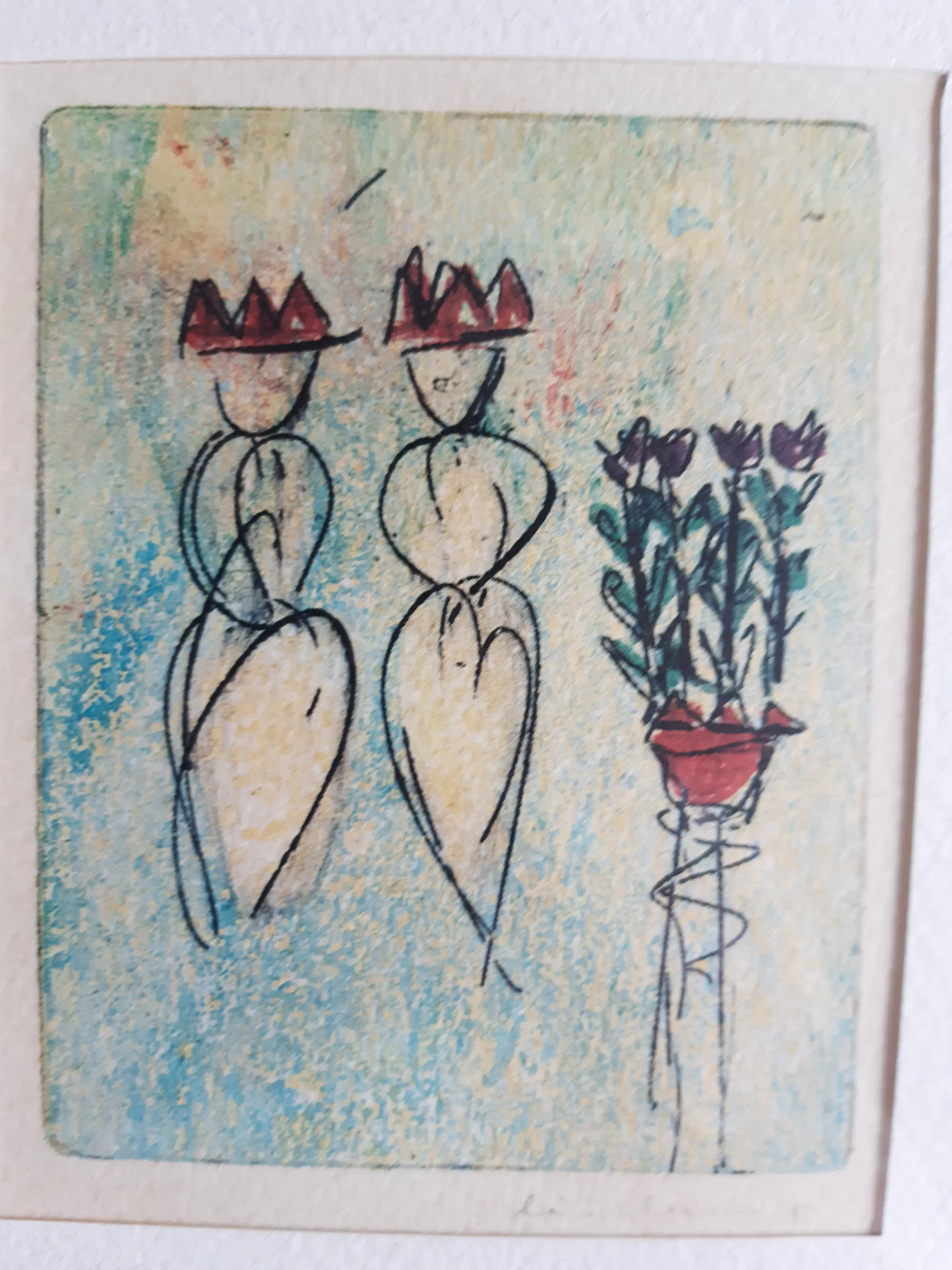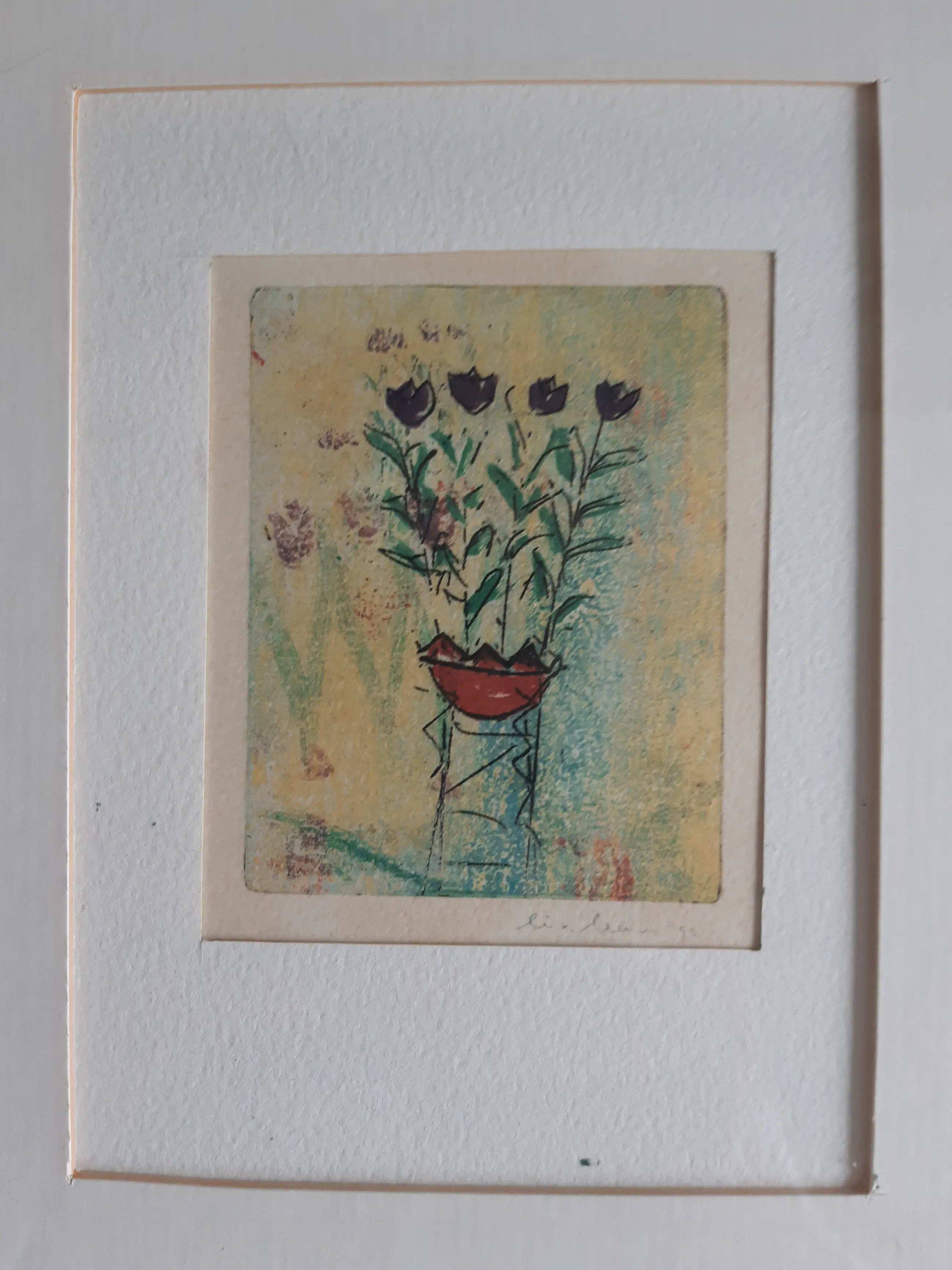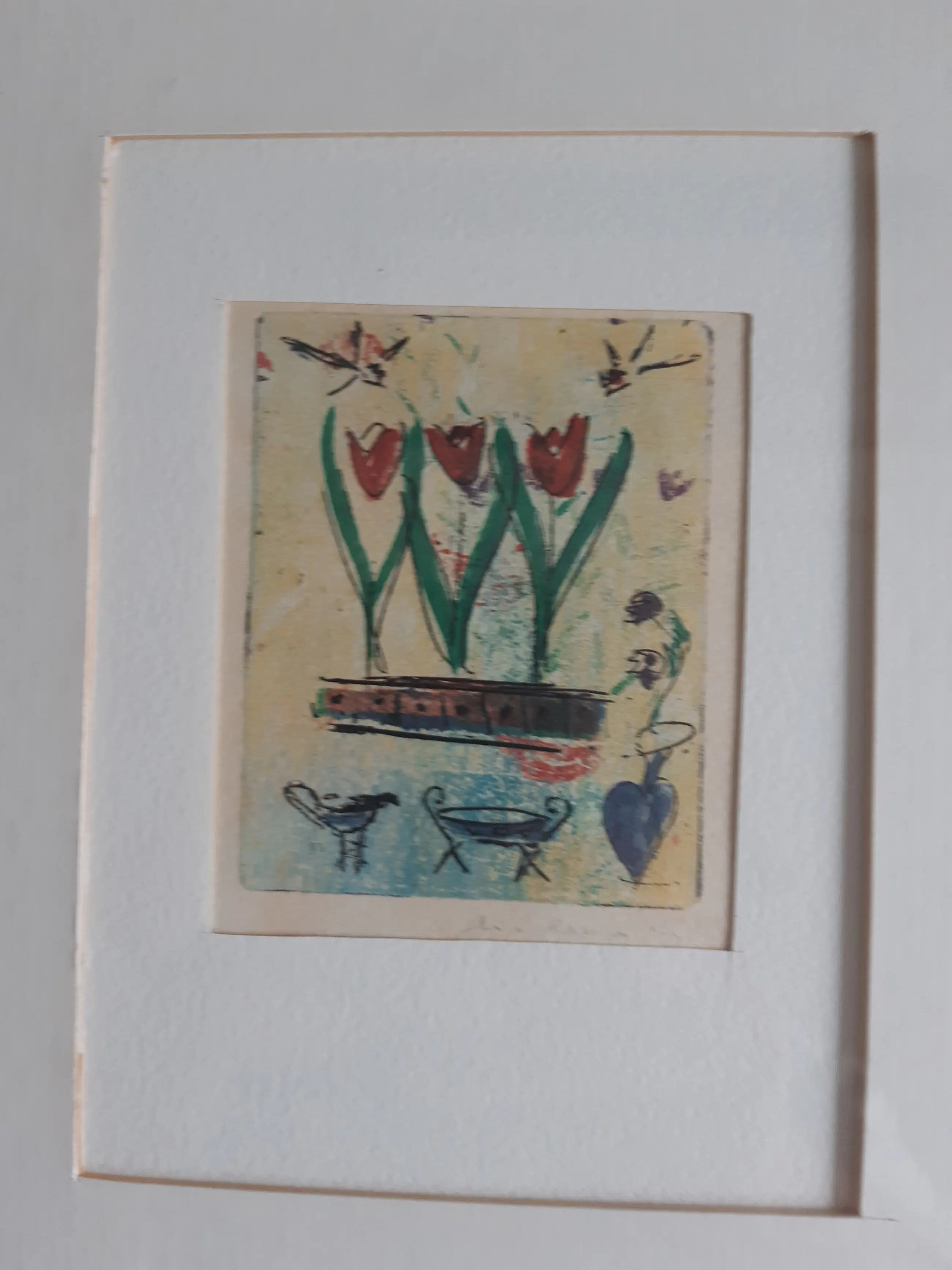 Lia van Leeuwen - vier kleine etsen van tulpen en figuurtjes
