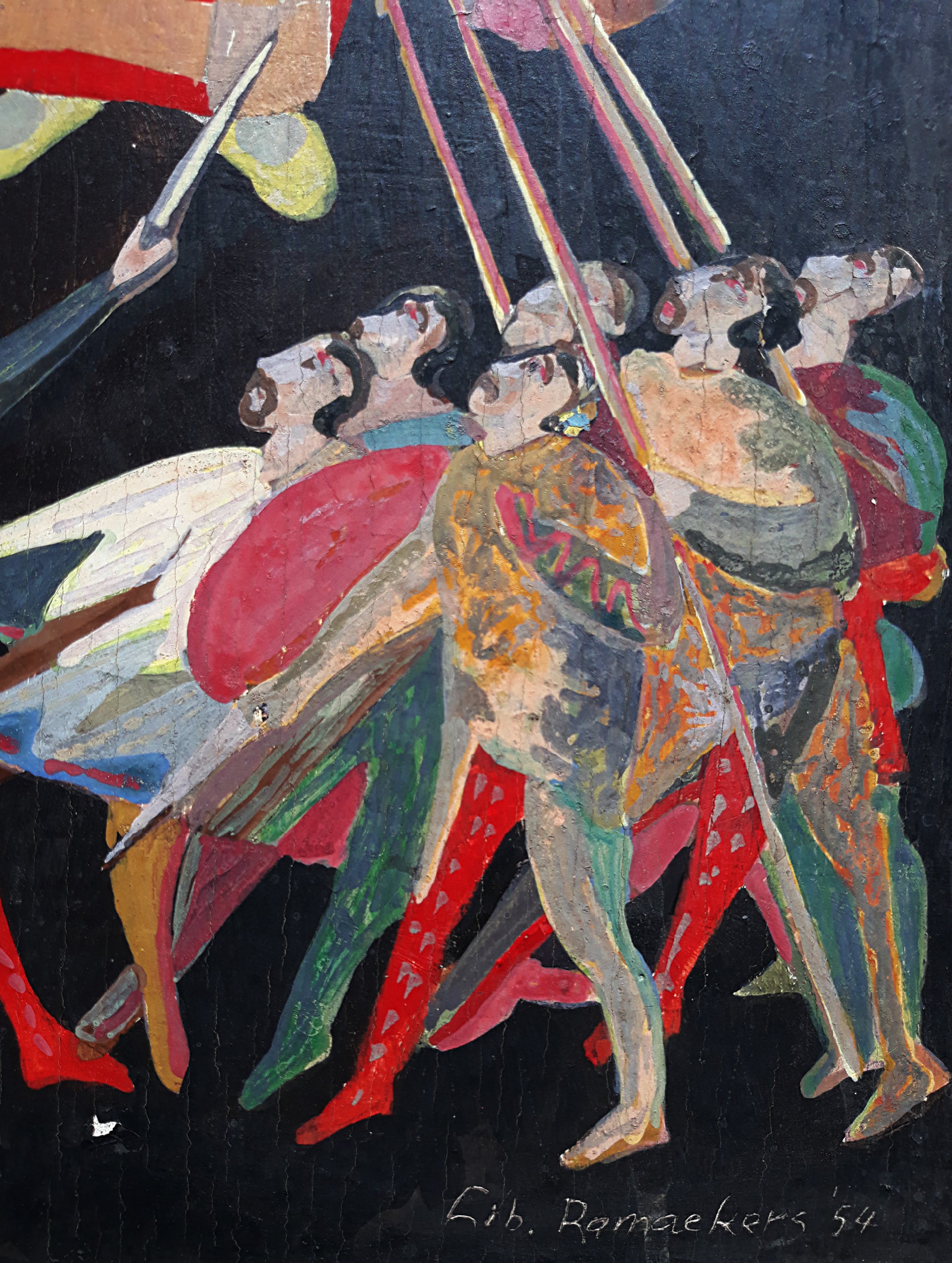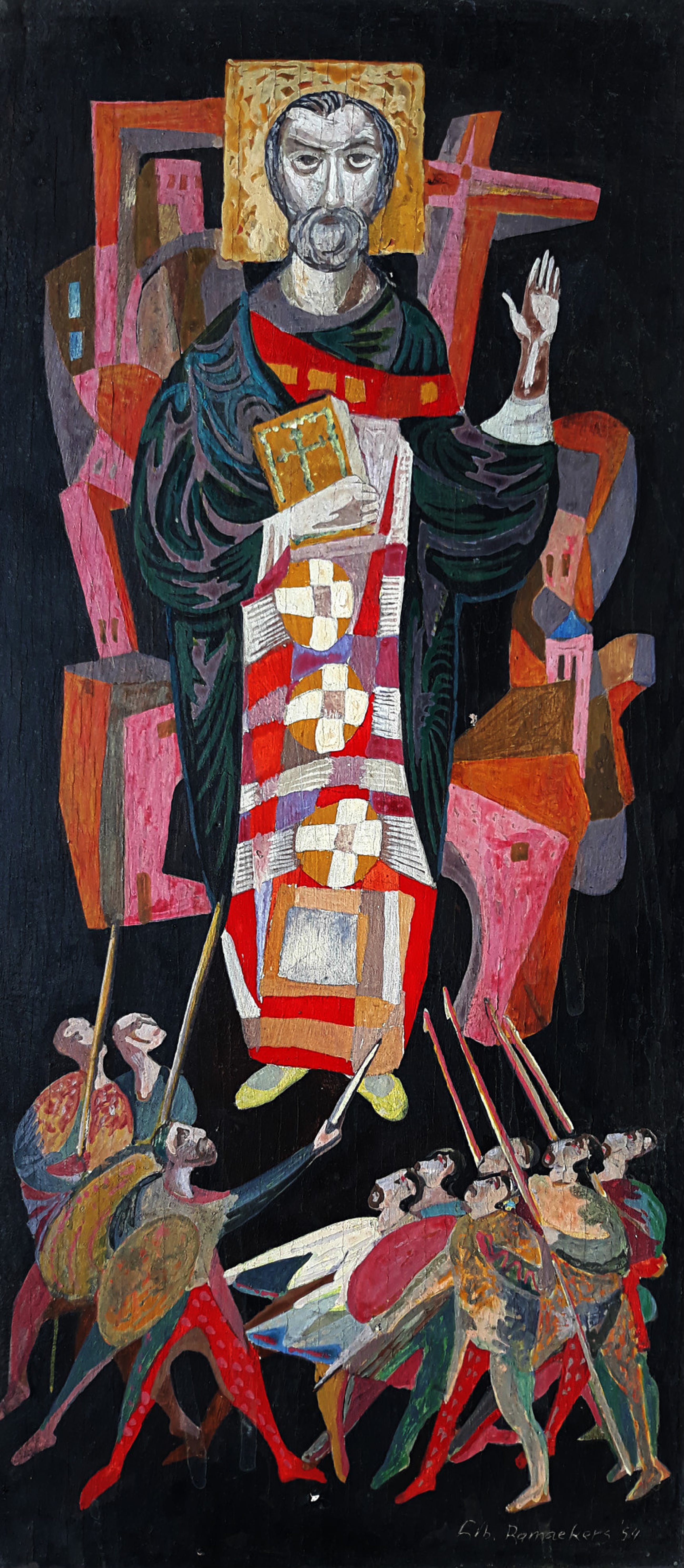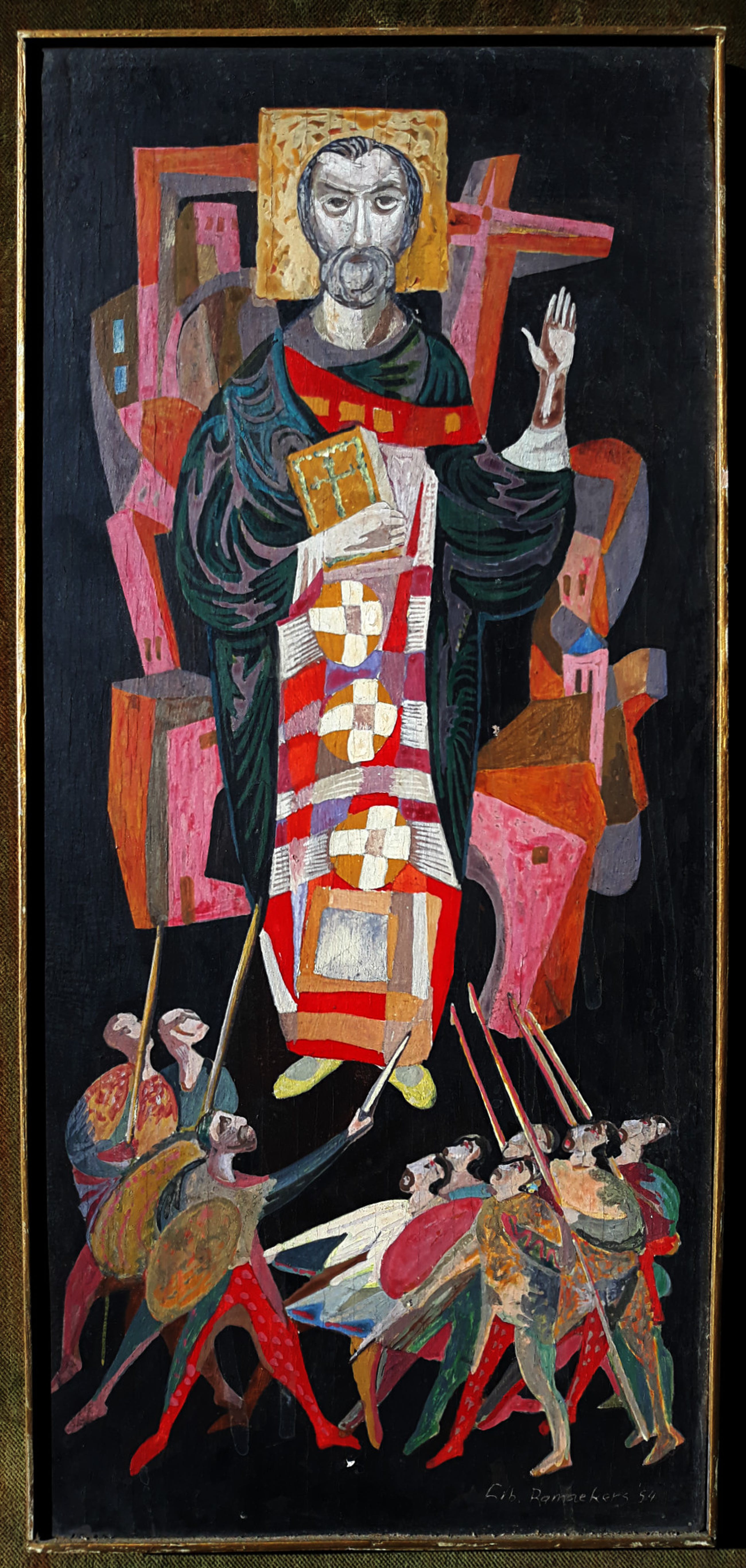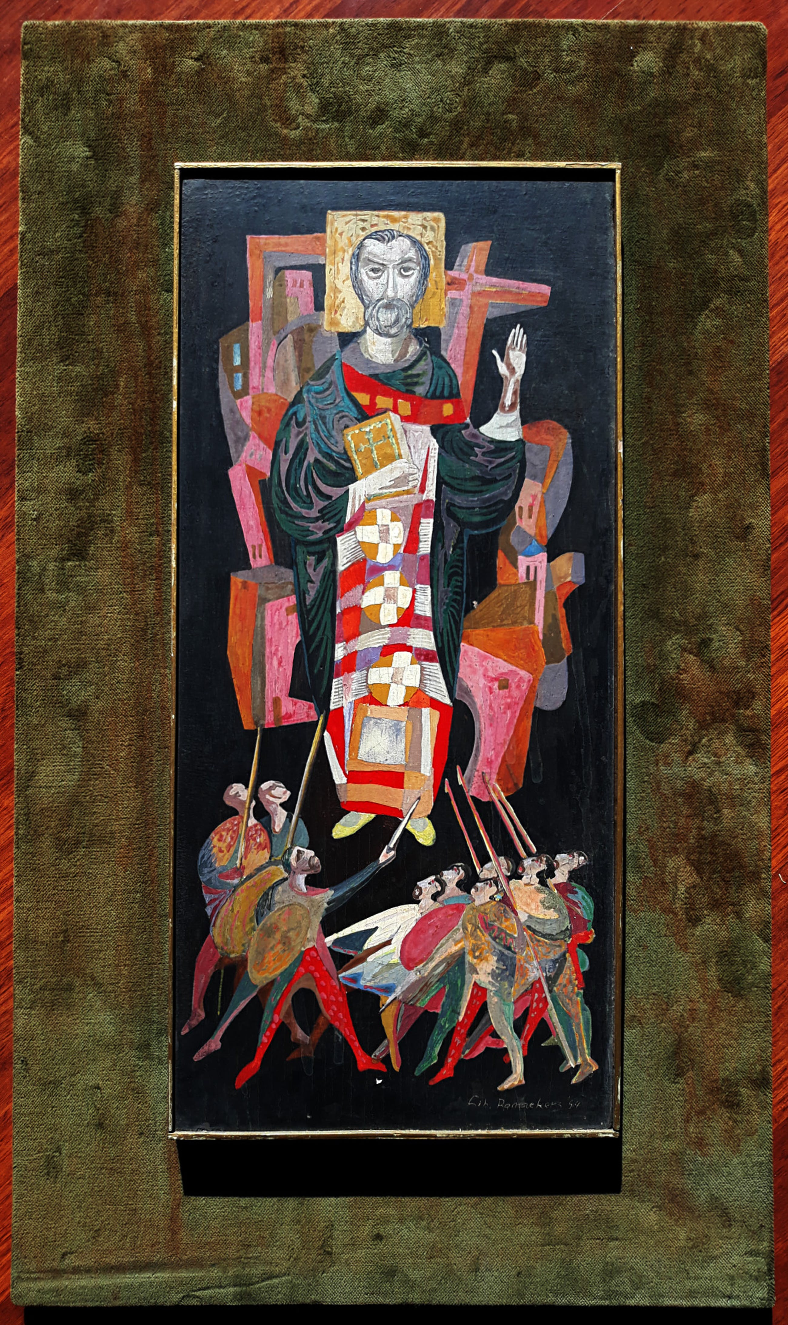Karakteristiek, religieuze voorstelling van de Maastrichtenaar Libert Ramaekers. Olieverf op paneel, gesigneerd en gedateerd (’54) rechtsonder. In dunne, koperkleurige lijst en het geheel gemonteerd op een met fluweel beklede ondergrond. Alles in goede conditie; waarschijnlijk door de draad van het houten paneel is er sprake van nauwelijks zichtbare craquelure. Er mist ook een puntje verf midden onderaan.