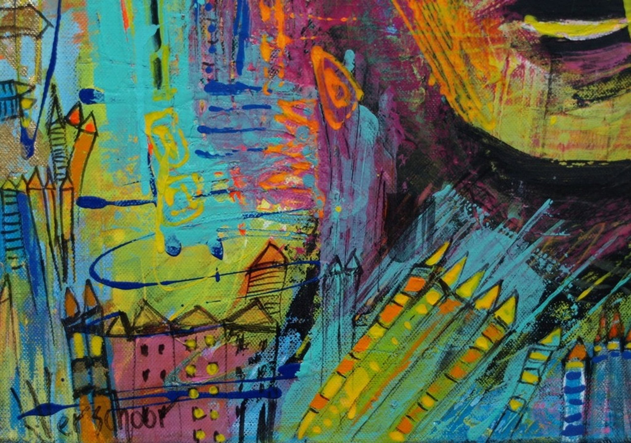Techniek: gemengde techniek op doek; een combinatie van olieverf, acrylverf, gouache en inkt