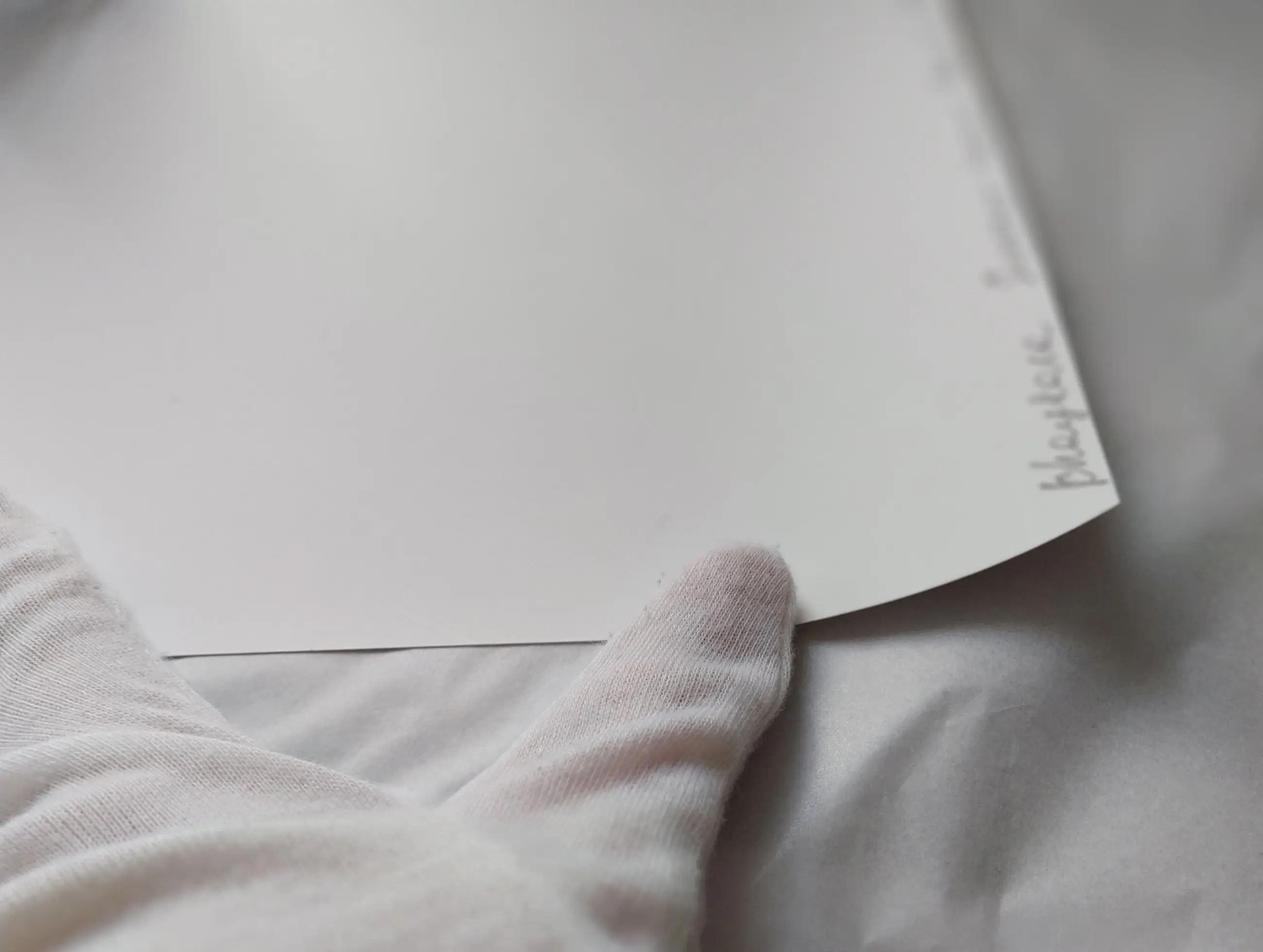 Het papier heeft een afwerking die tussen glanzend en mat in ligt. 310 g/m2.