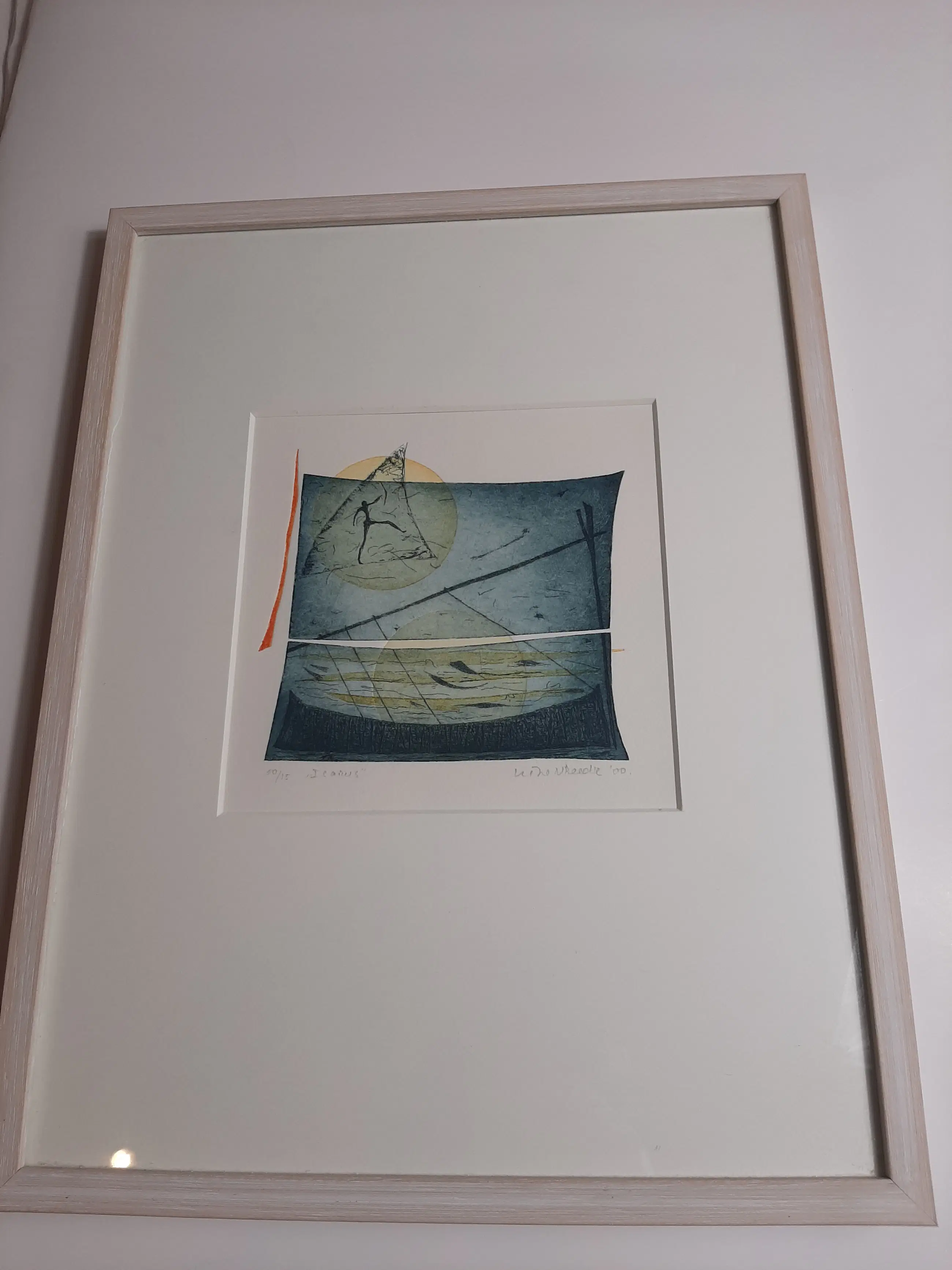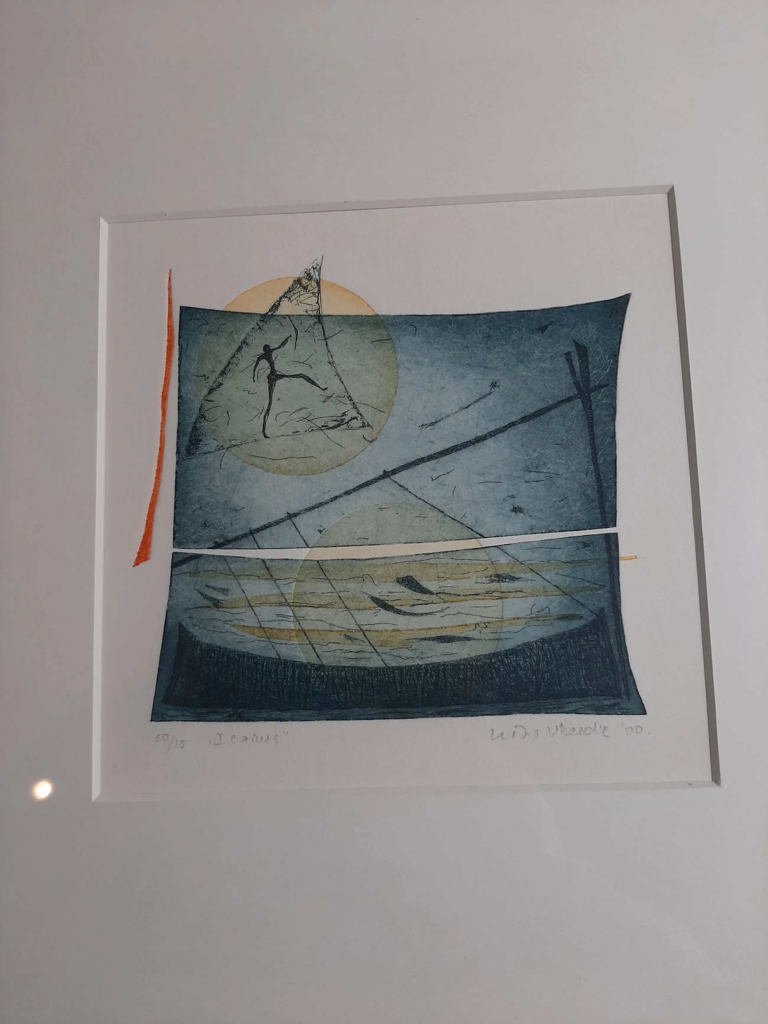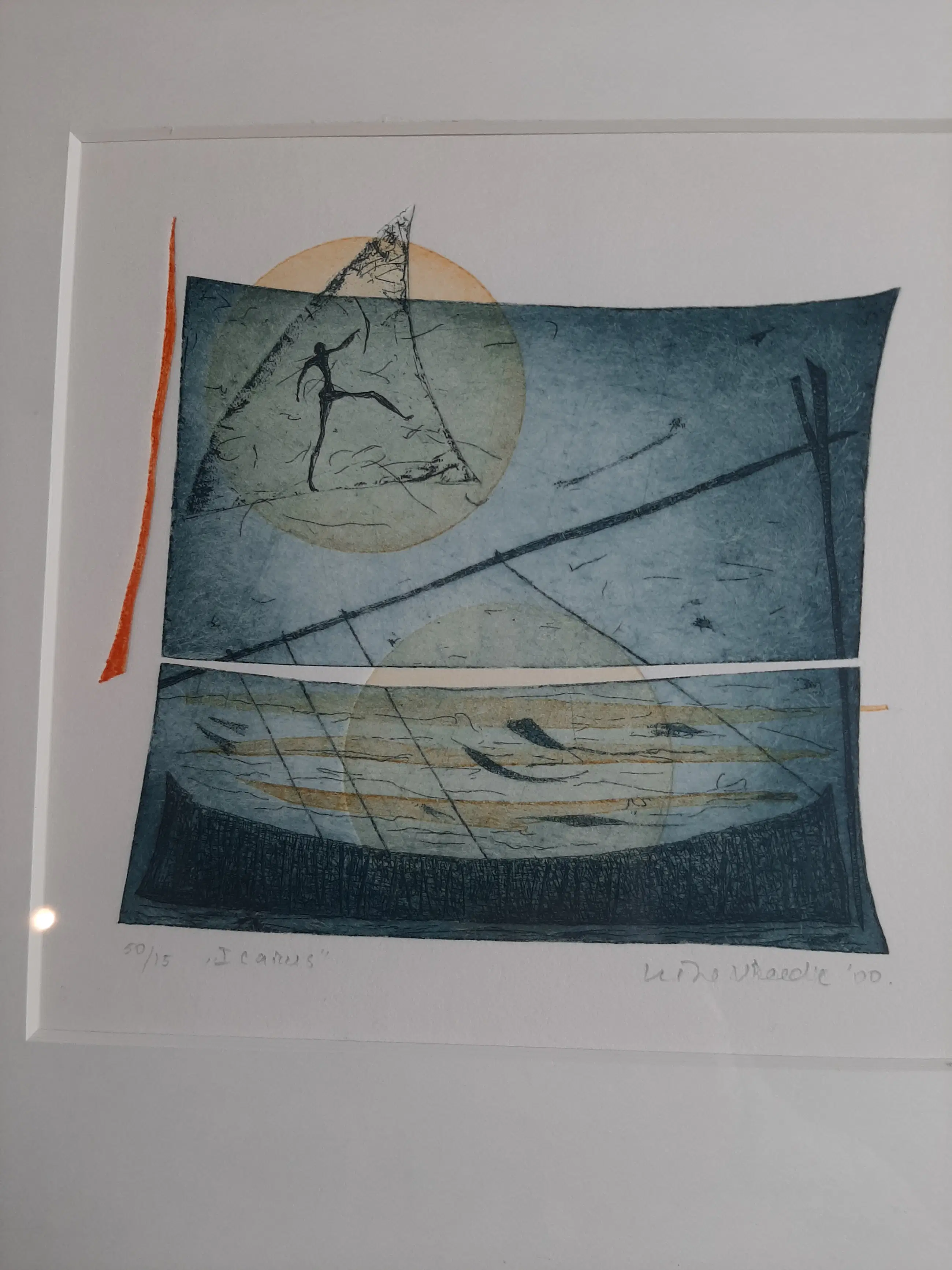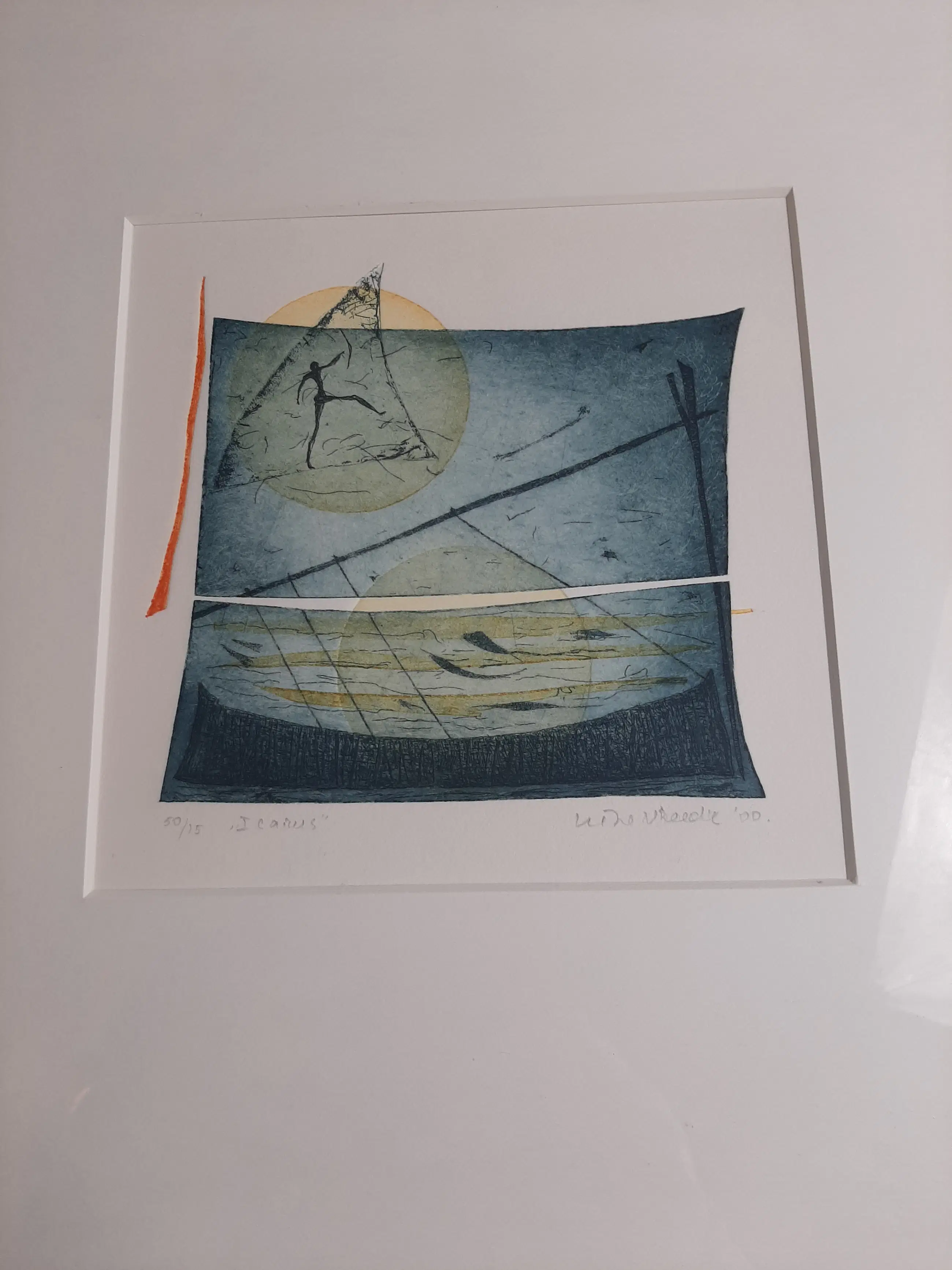 Ets van Lieke Vreede uit 2000. Titel: Icarus. Nummer: 15/50. Afmetingen werk : H. 17 x B.17 cm. Afmetingen Lijst : H. 42 x B. 32 cm. Het werk is rechtsonder, met potlood, gesigneerd door de kunstenaar.
