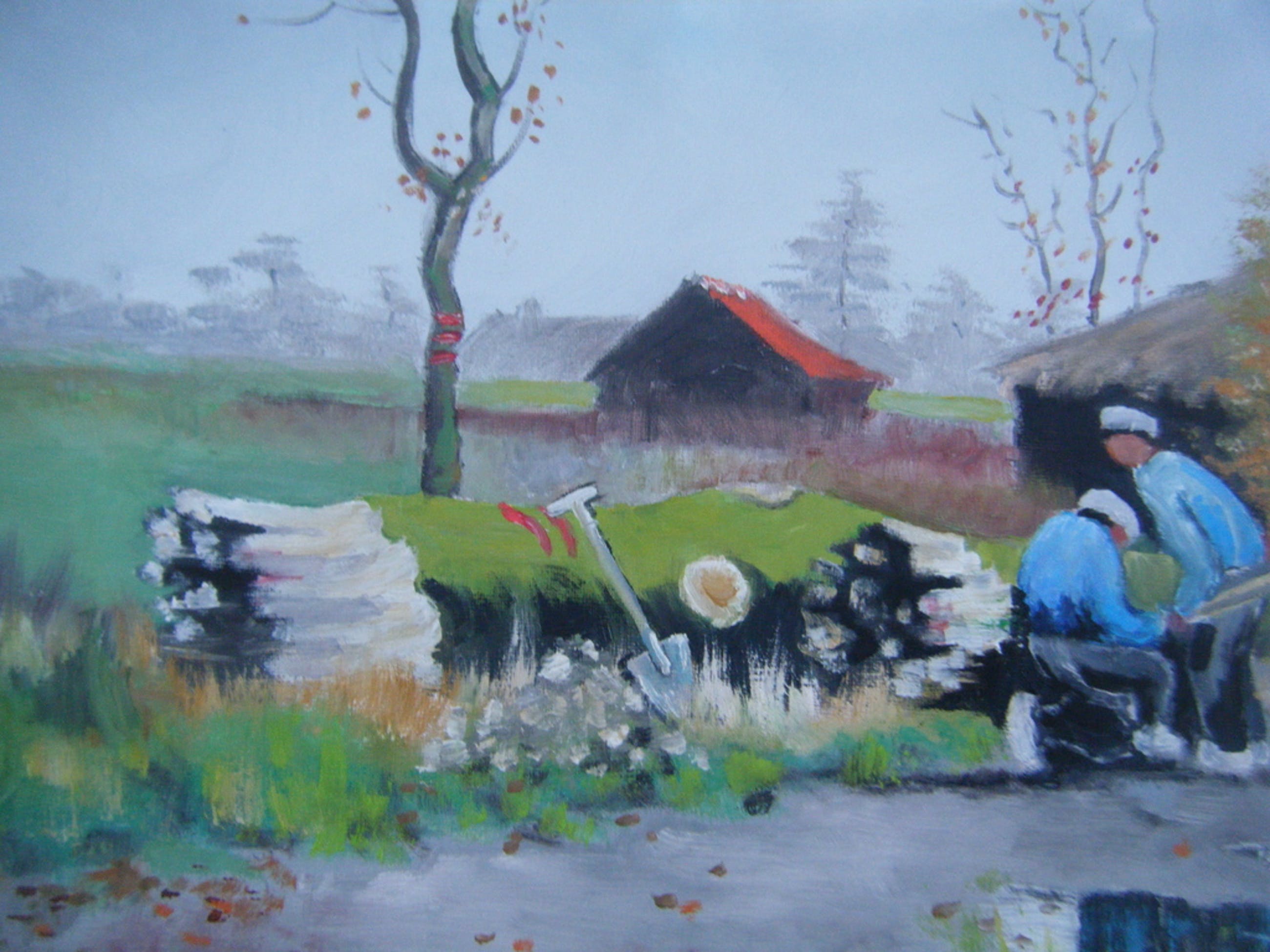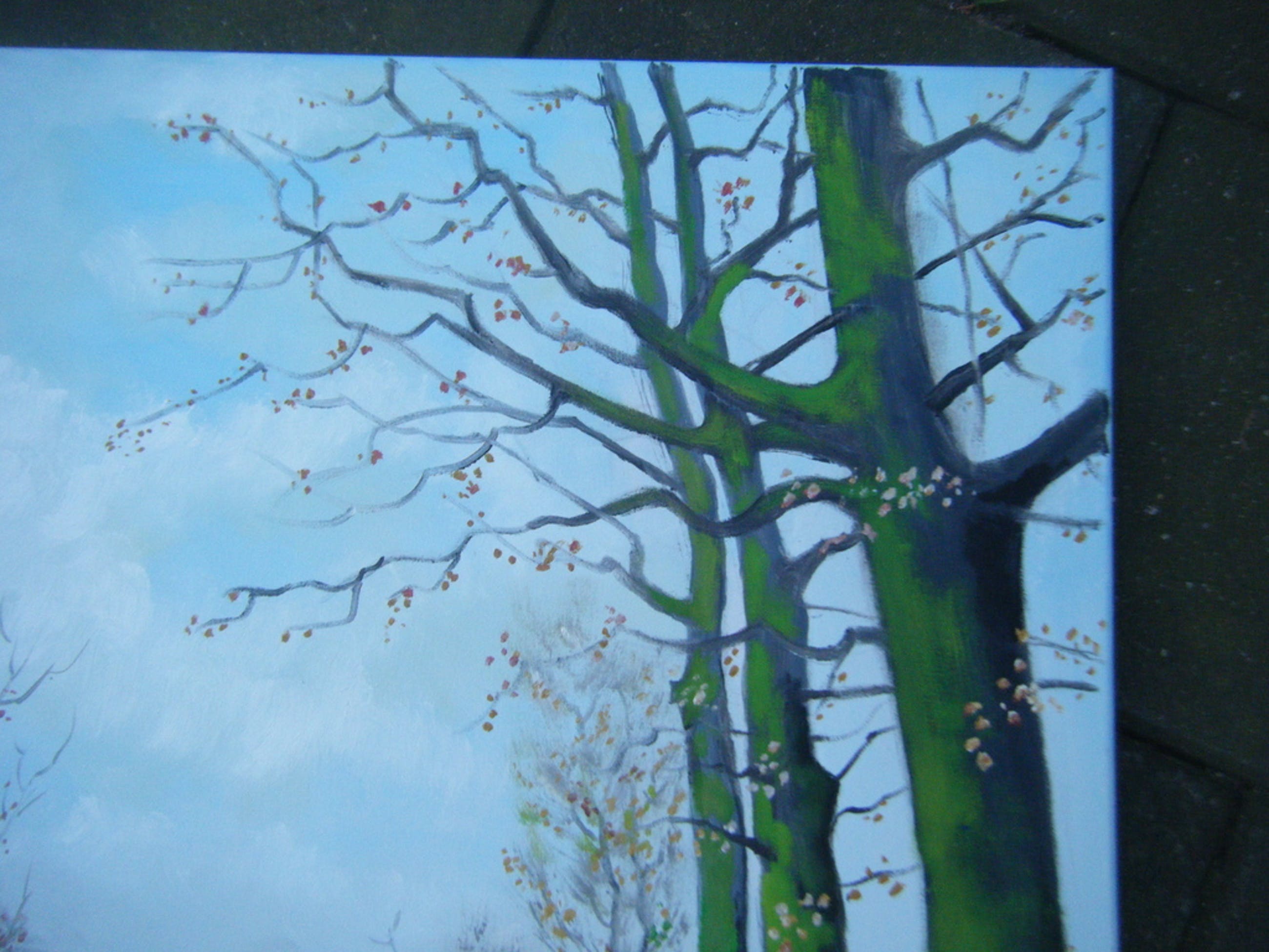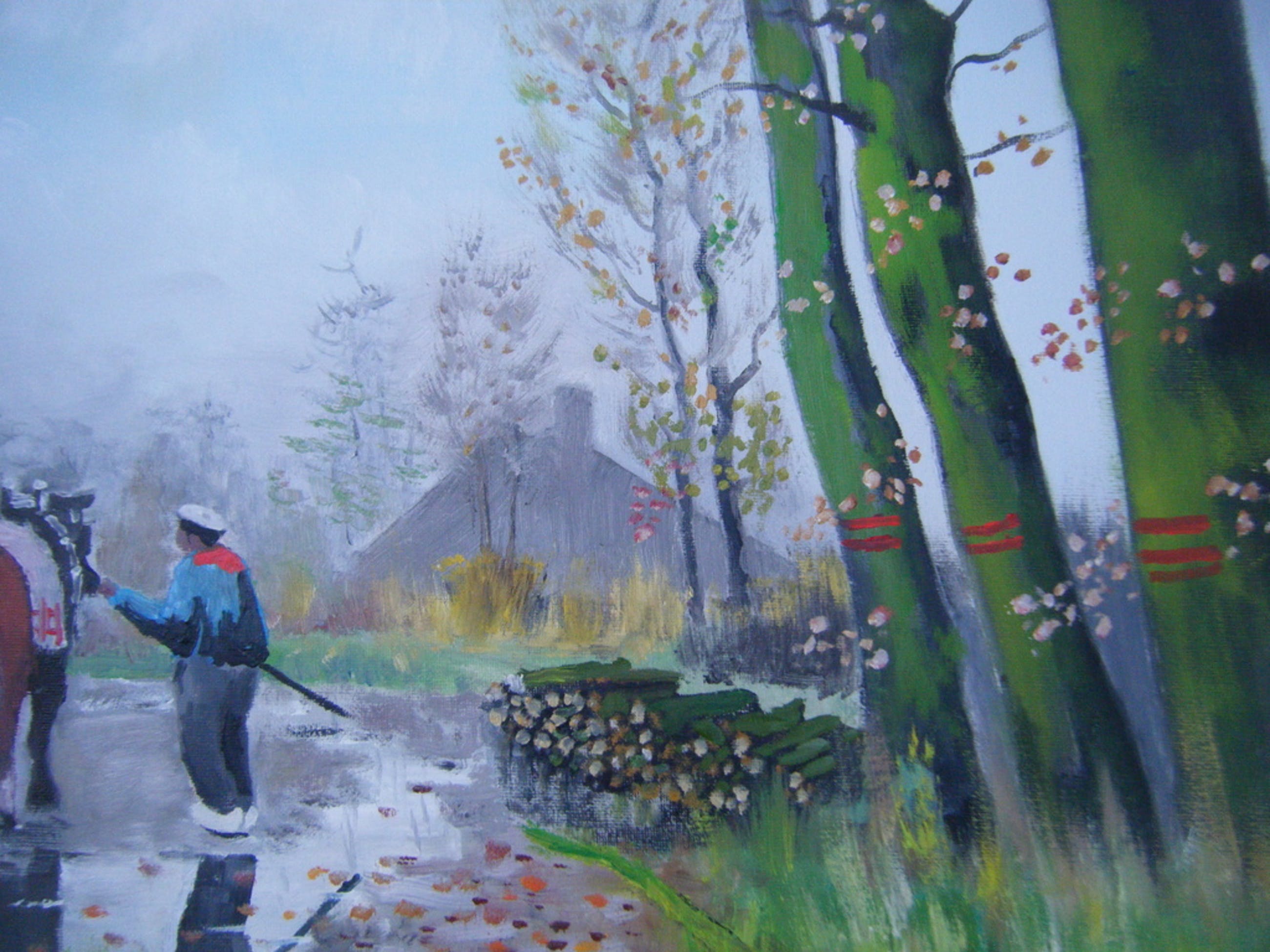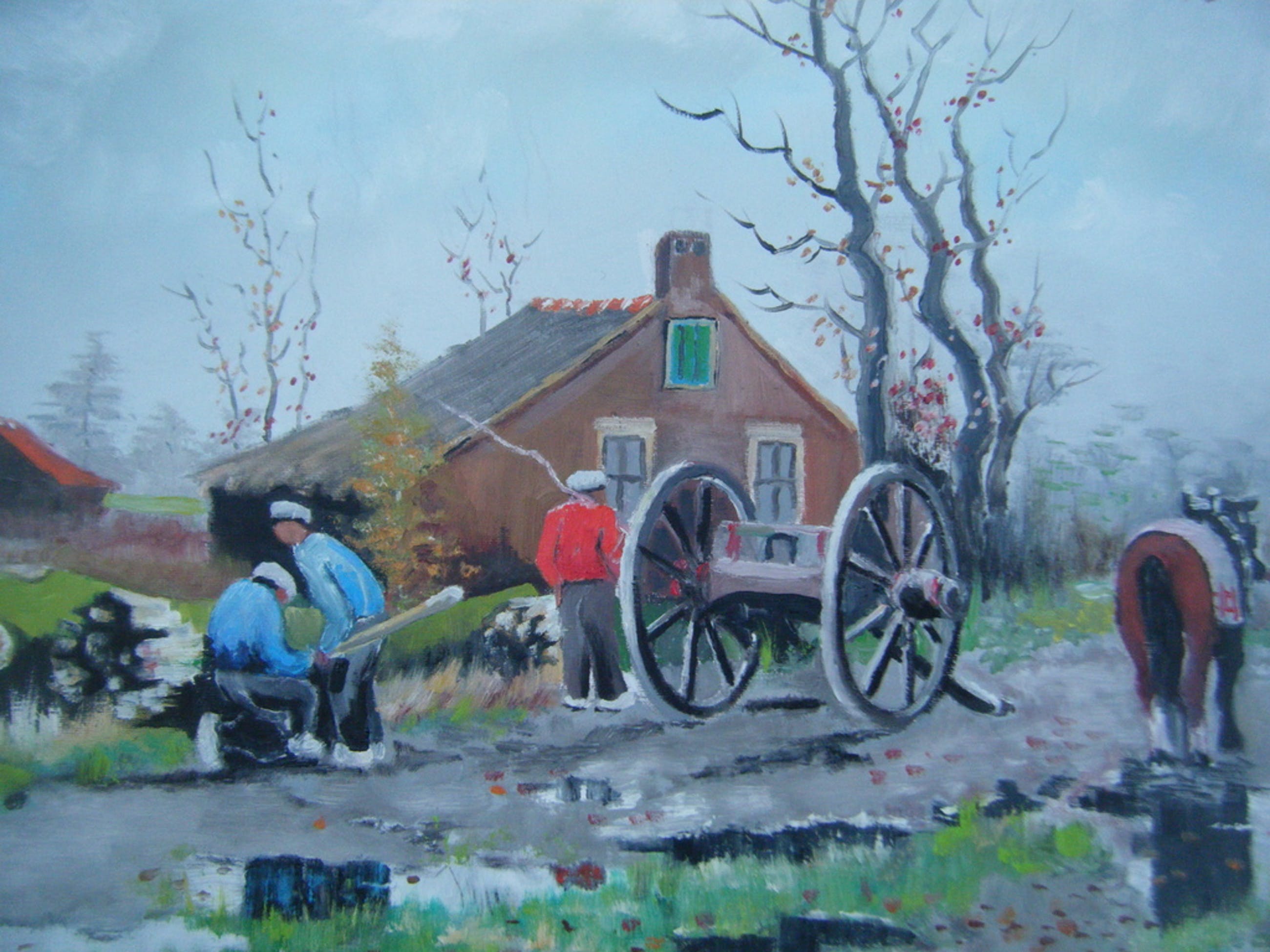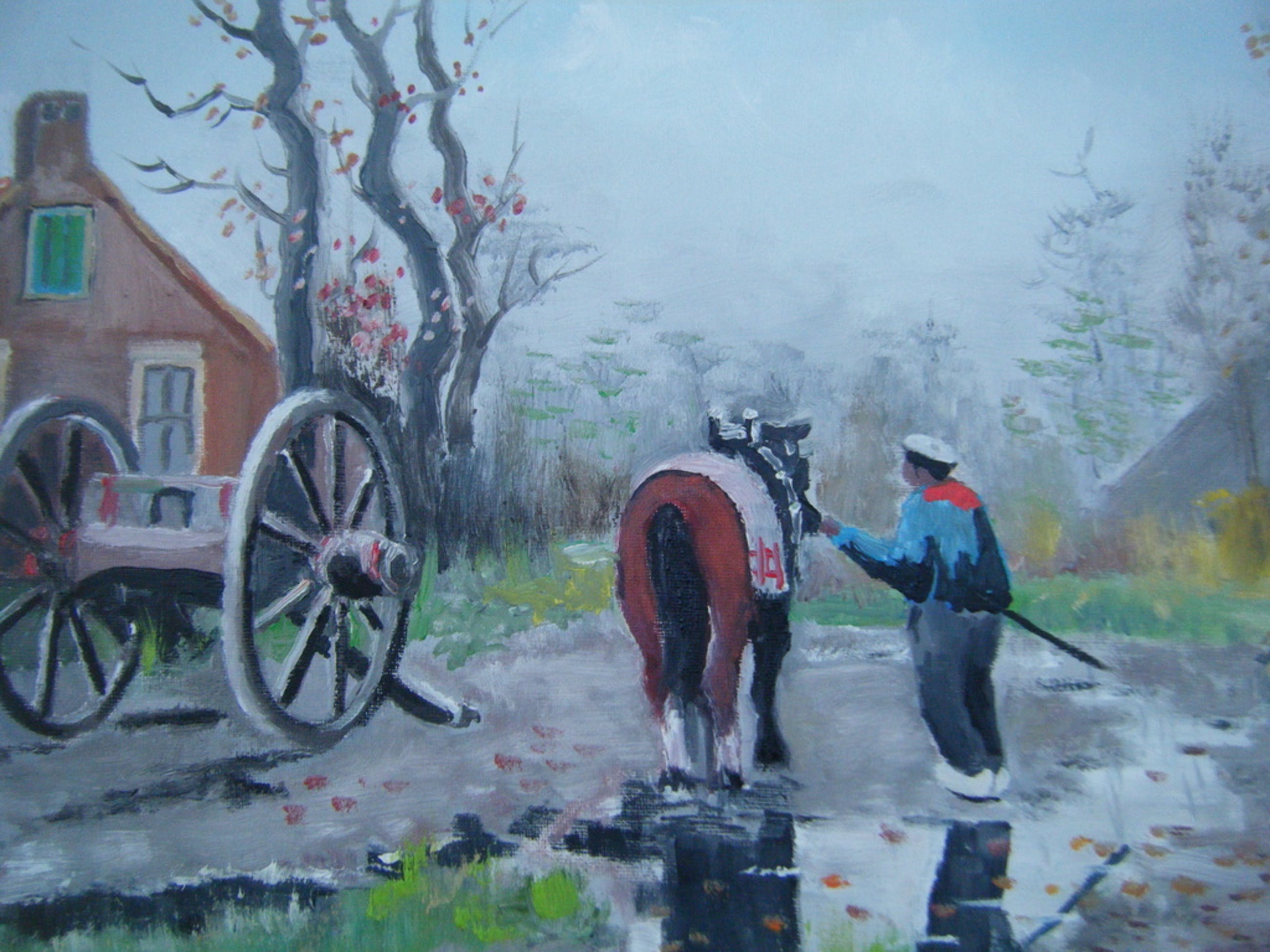 Mooi groot schilderij ,vooral de spiegeling in de plassen water op de landweg nodigd uit om te blijven kijken