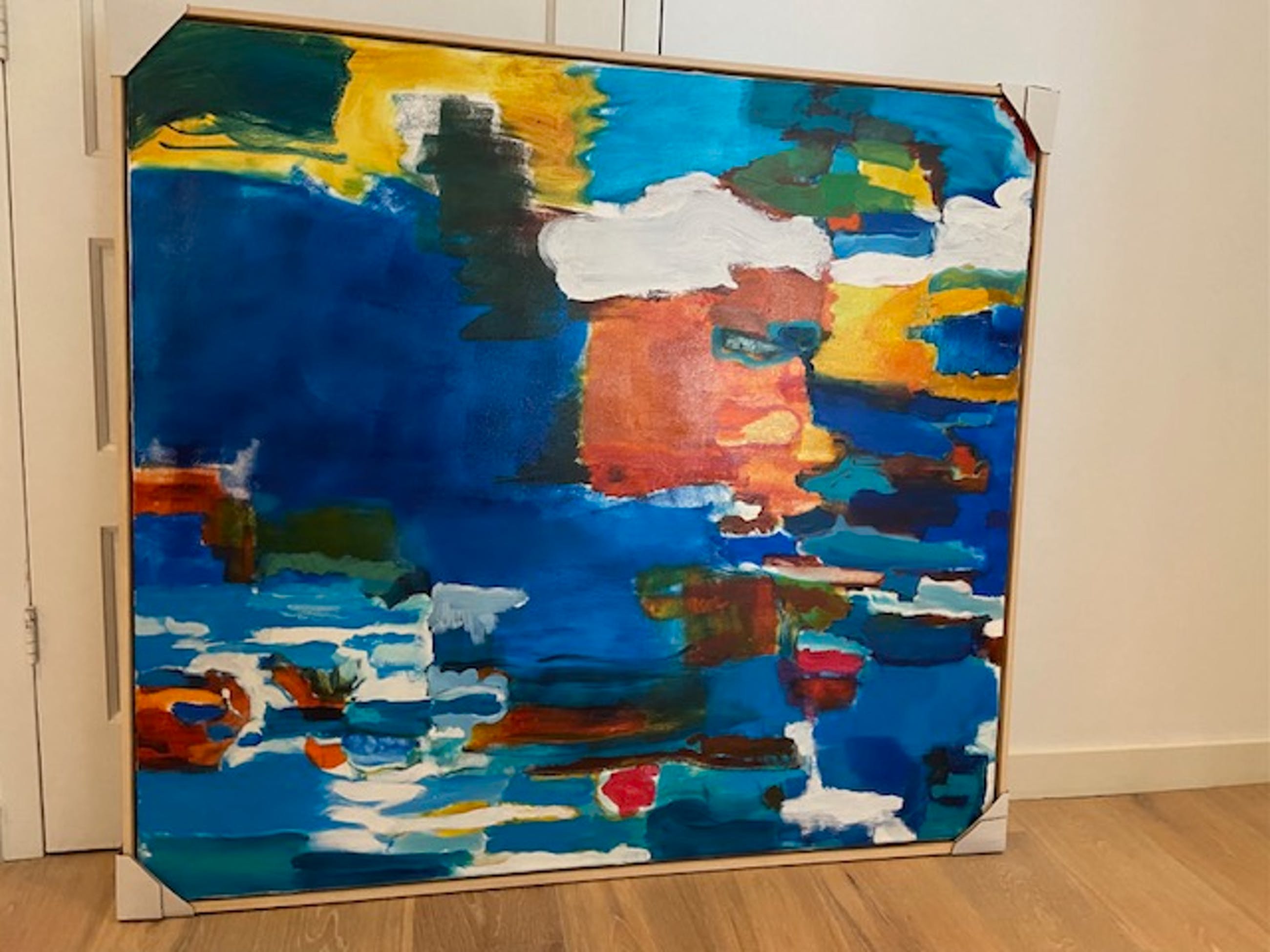 Mooi kleurrijk werk van Lies Snel (zonder titel). Het doek heeft altijd met veel plezier bij ons in huis gehangen. Qua vormen een werk waar je naar blijft kijken en qua kleur een toevoeging aan je interieur.