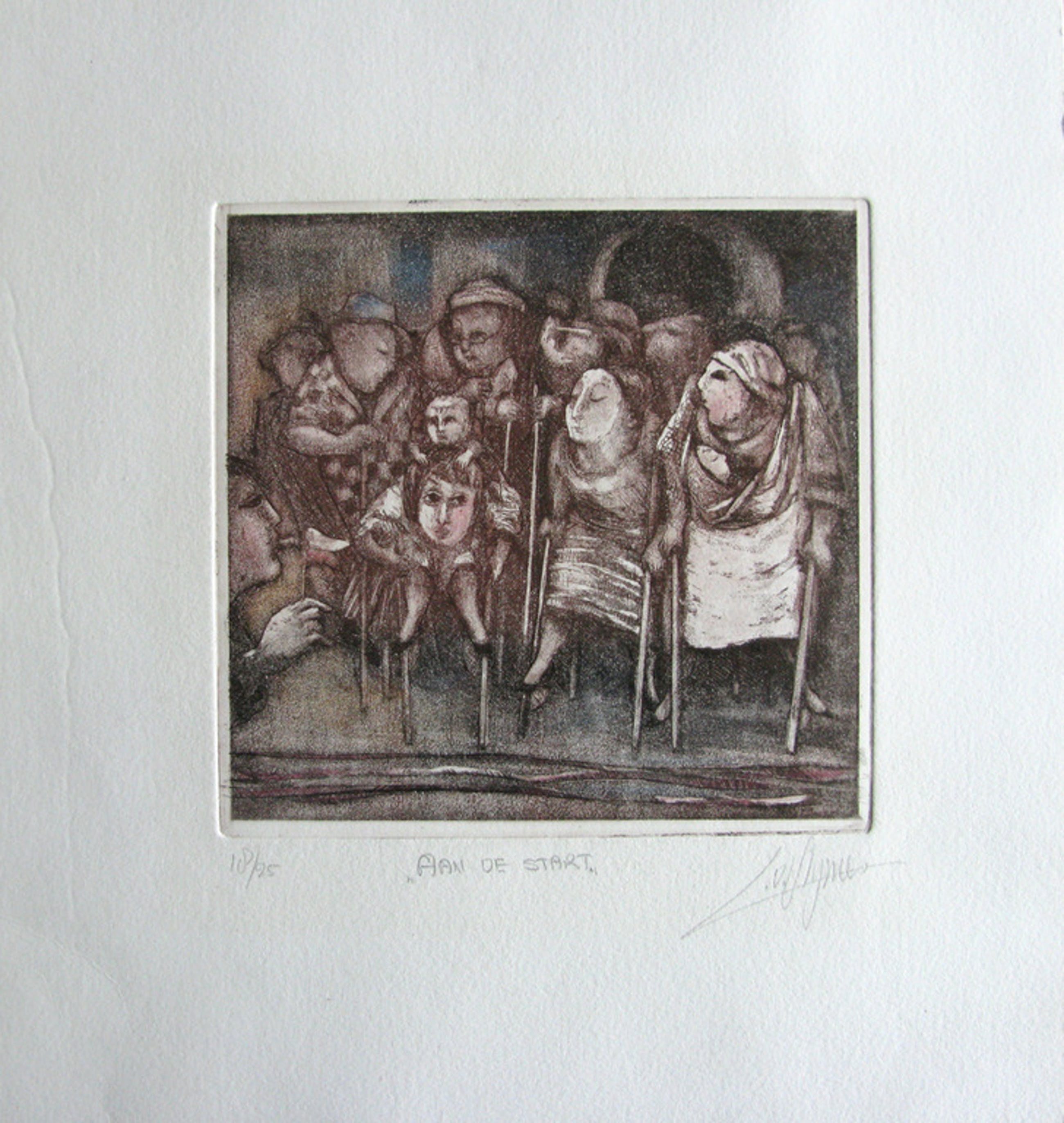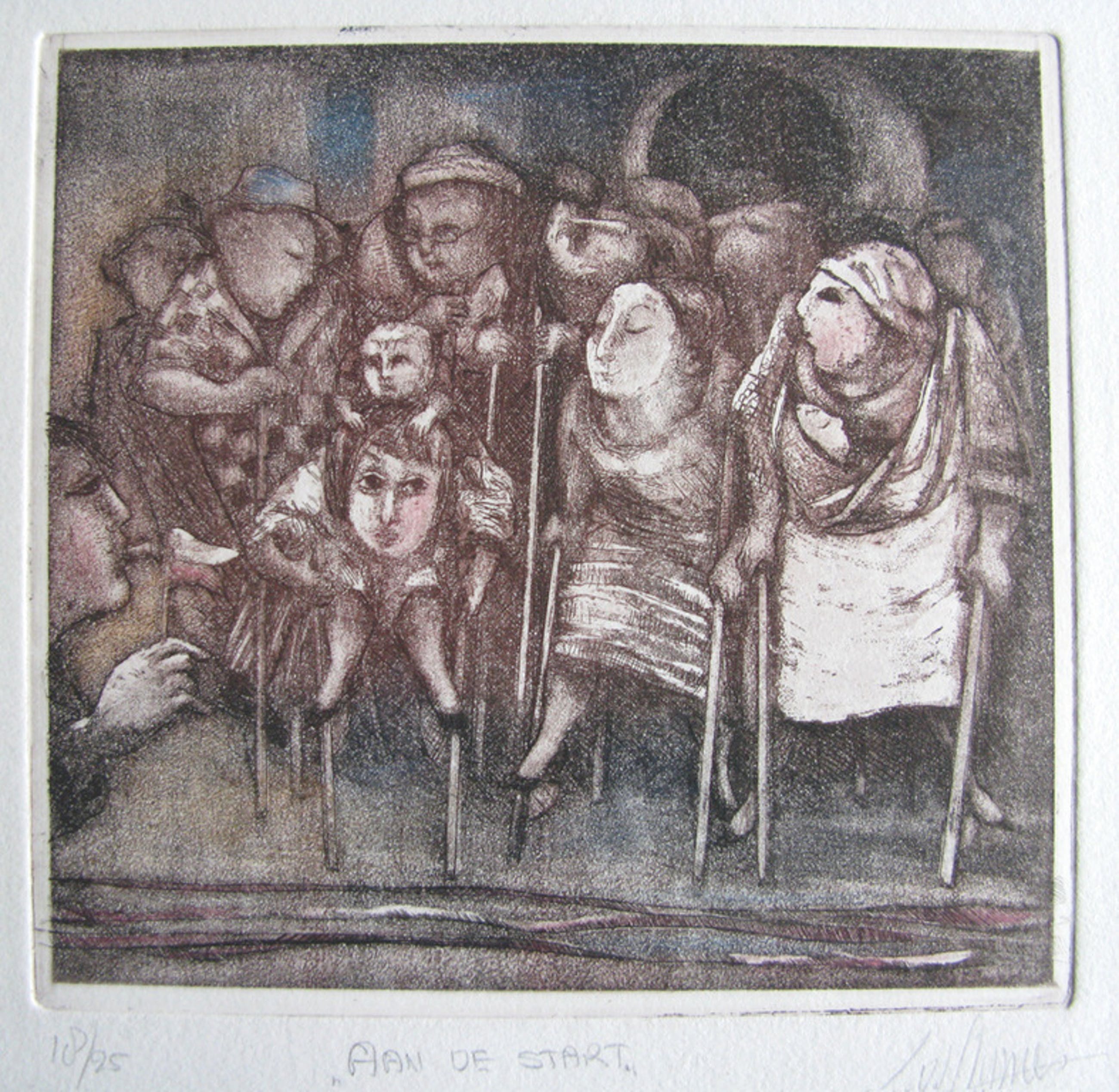 Een kleine ets met een afbeelding waaruit een milde spot spreekt. De afbeelding is 12 cm hoog en 14 cm breed. Formaat van het blad is 25 hoog en 24 breed. De oplage is 18/25 en er is geen jaartal bekend. Gelet op het formaat kan deze kleurets voor een bedrag van € 8,05 goed verpakt en binnen Nederland aangetekend verzonden worden. Voor verzending naar het buitenland worden hogere bedragen gerekend. De verzendkosten zijn voor rekening van de koper.