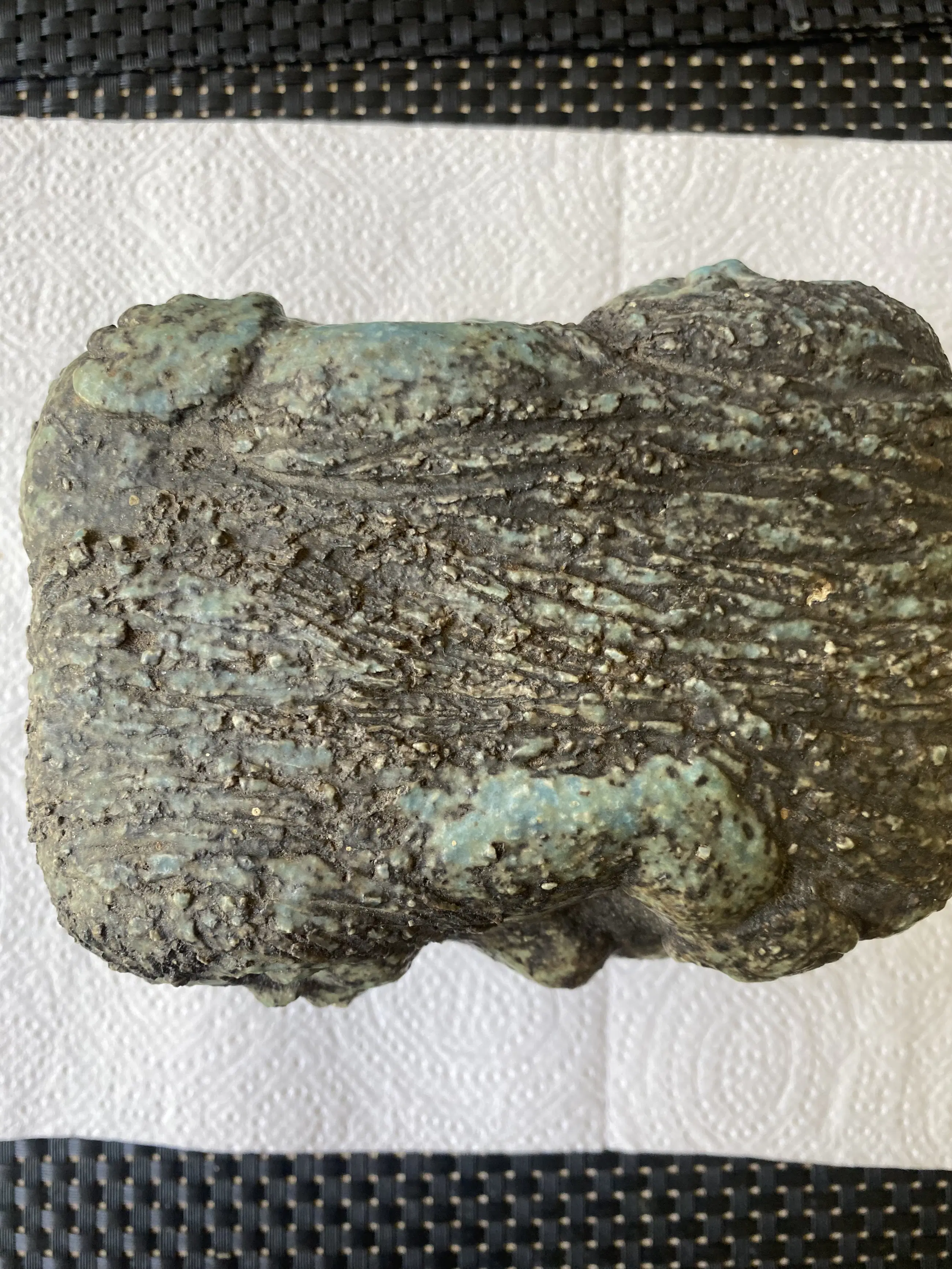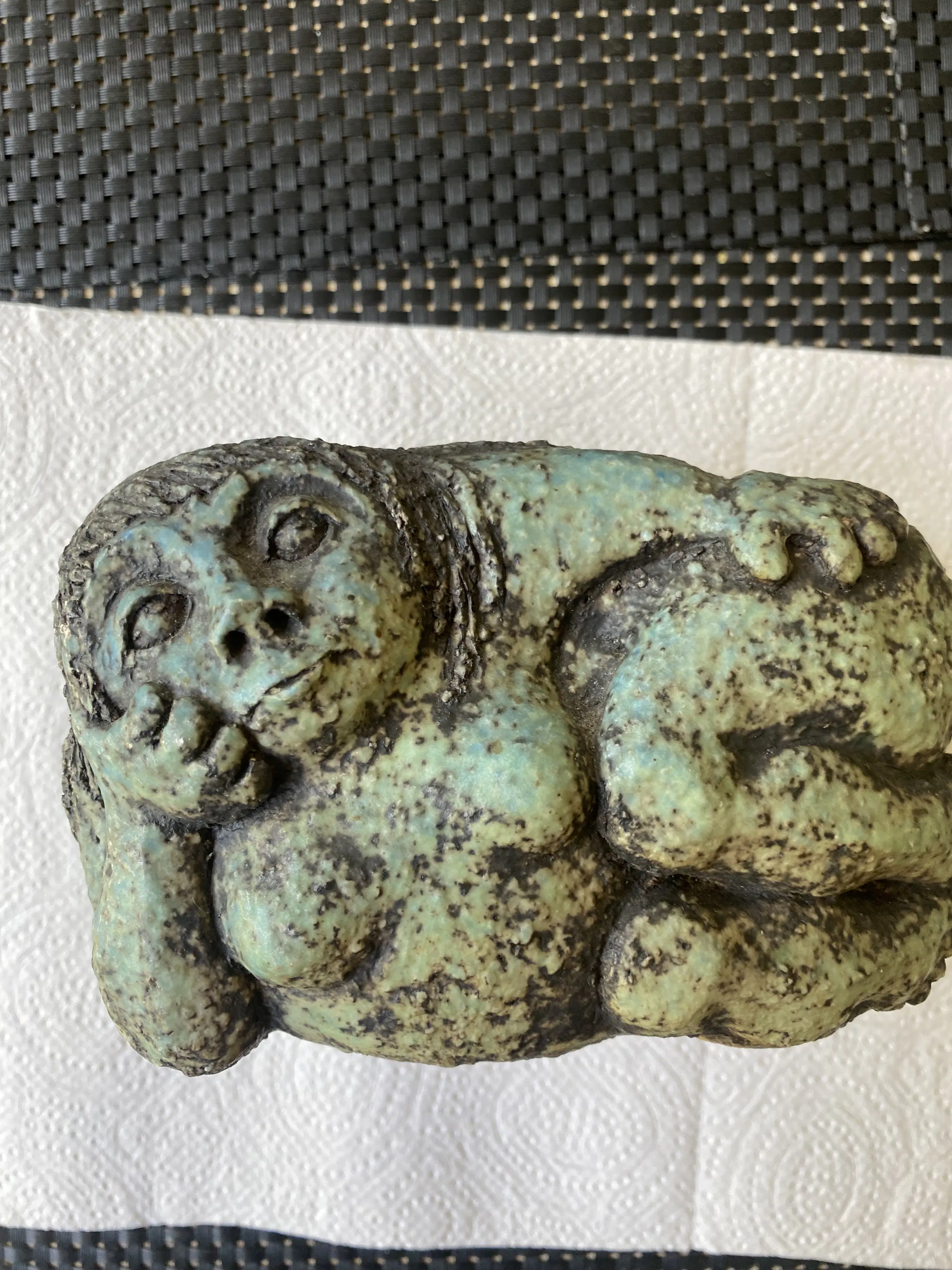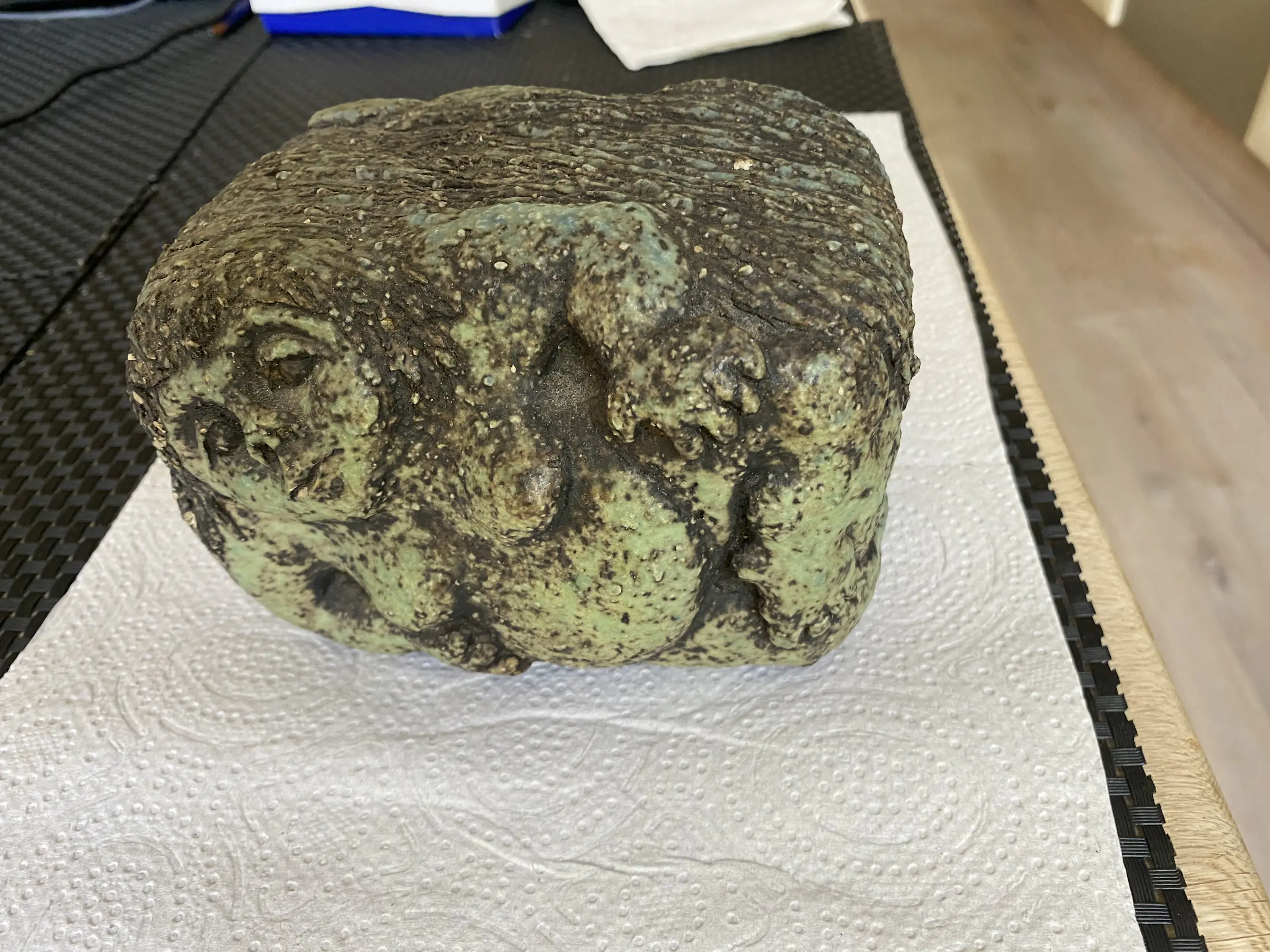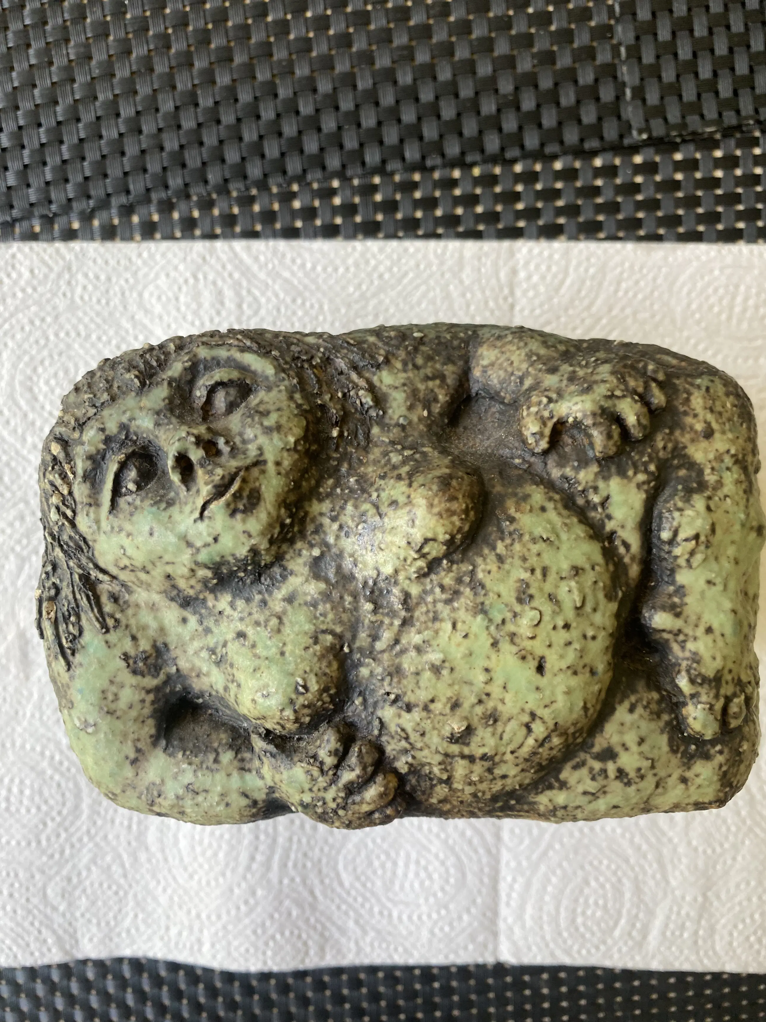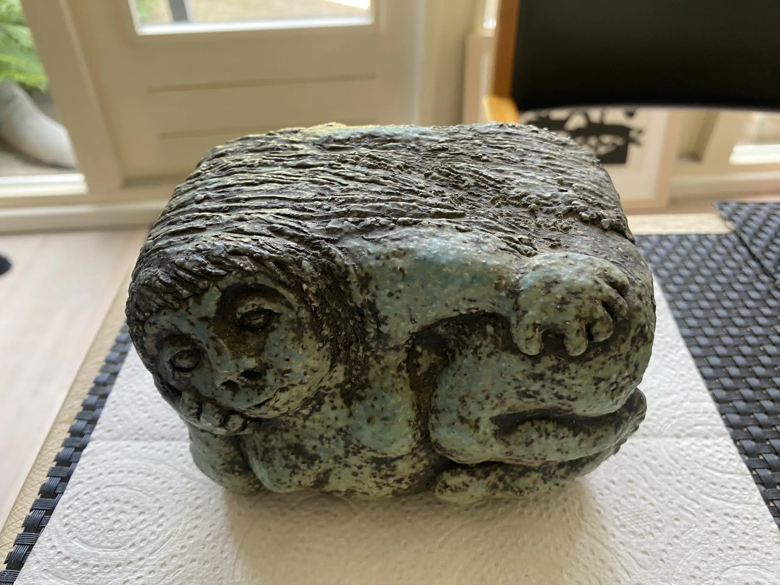 Bijzonder massief keramiek sculptuur van Lies van Vlijmen. Kunstenaar die zich altijd weer onderscheidt door atypische verbeelding van mensfiguren. Beeld heeft twee verschillende aangezichten van vrouw in verschillende poses. Bovenop een gedeelde haartooi. Onderzijde is voorzien van twee voorgeboorde gaten waardoor bevestiging op sokkel mogelijk is.