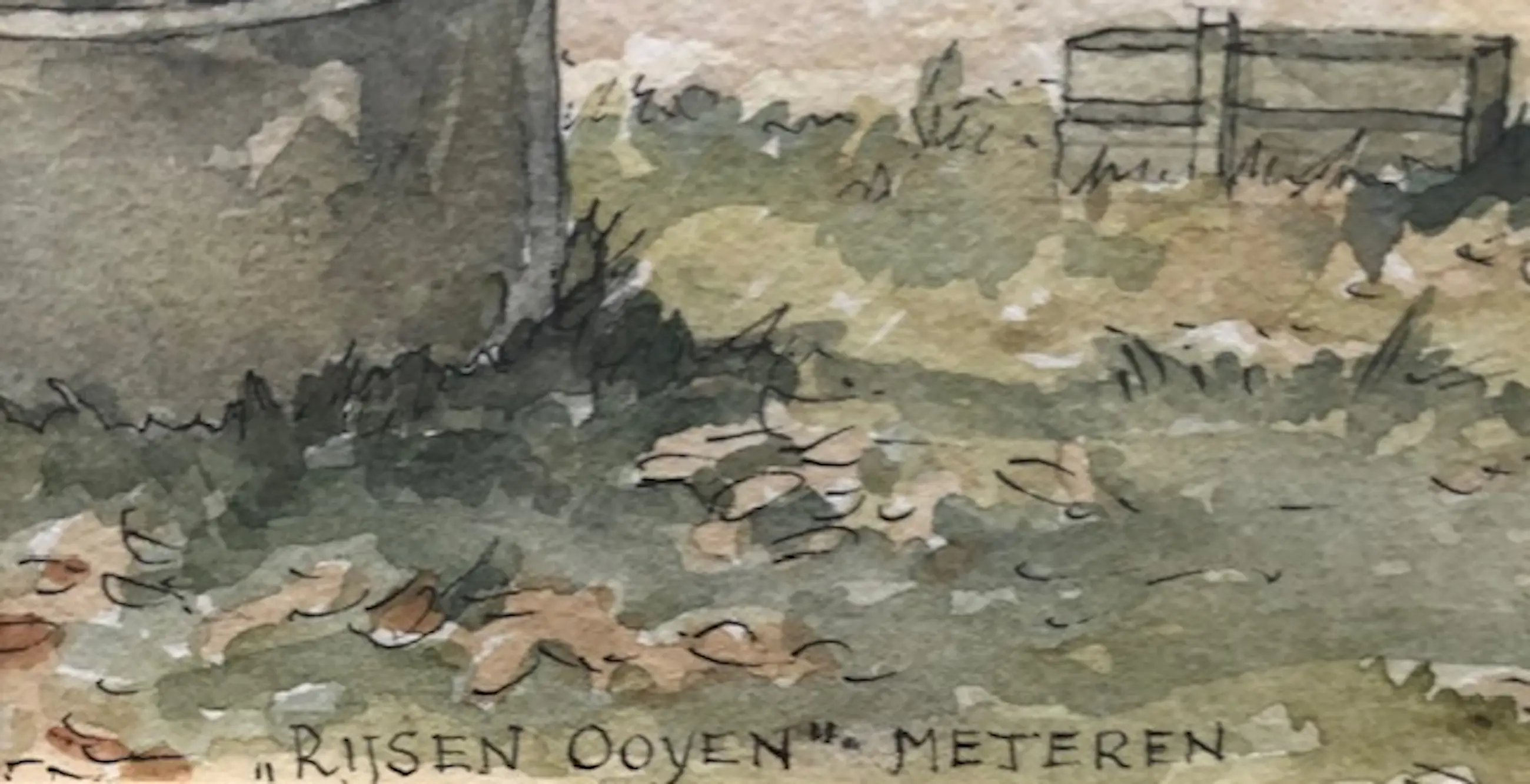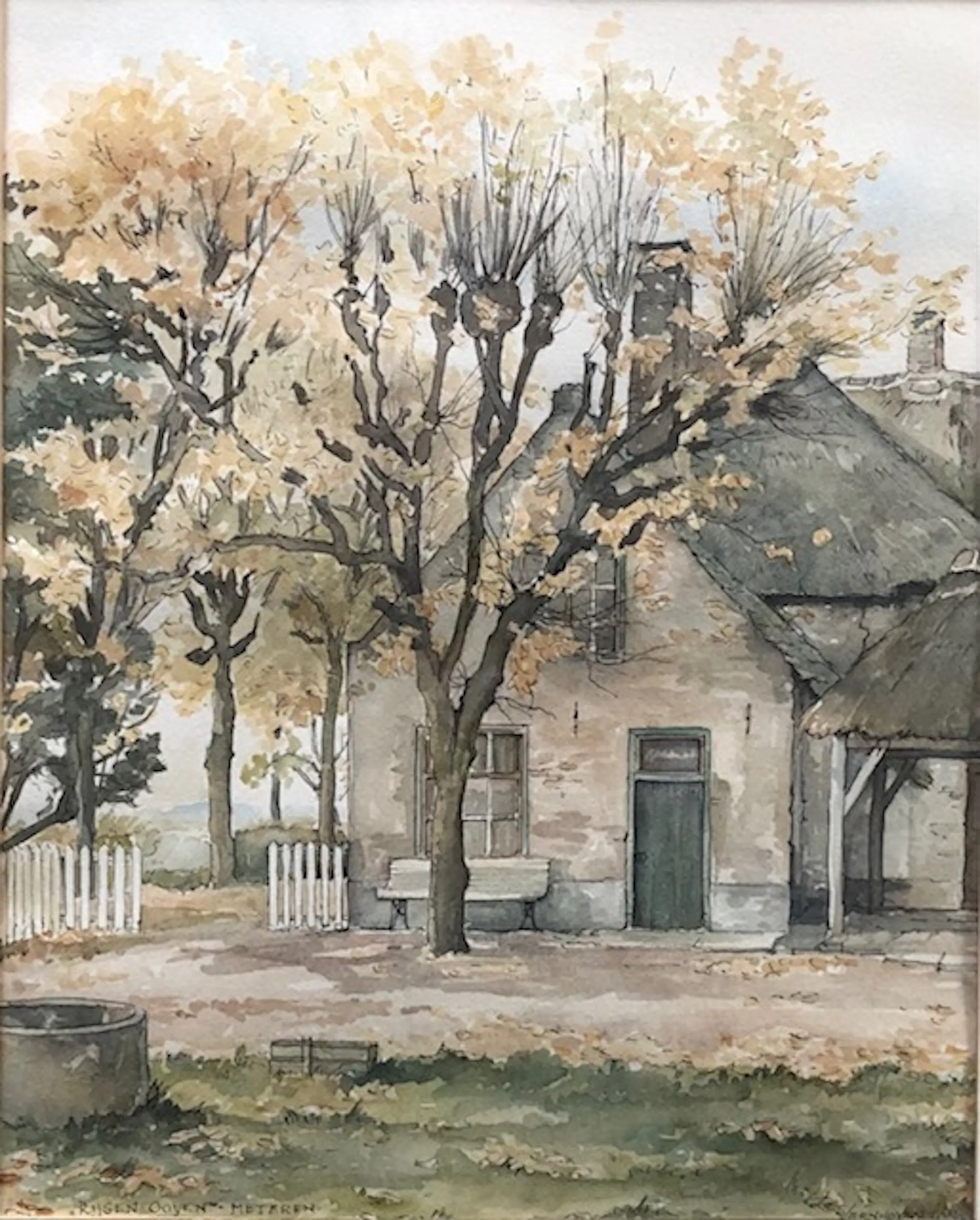 Historische boerderij in Meteren. Gesigneerd en gedateerd Lies Veenhoven 1980.