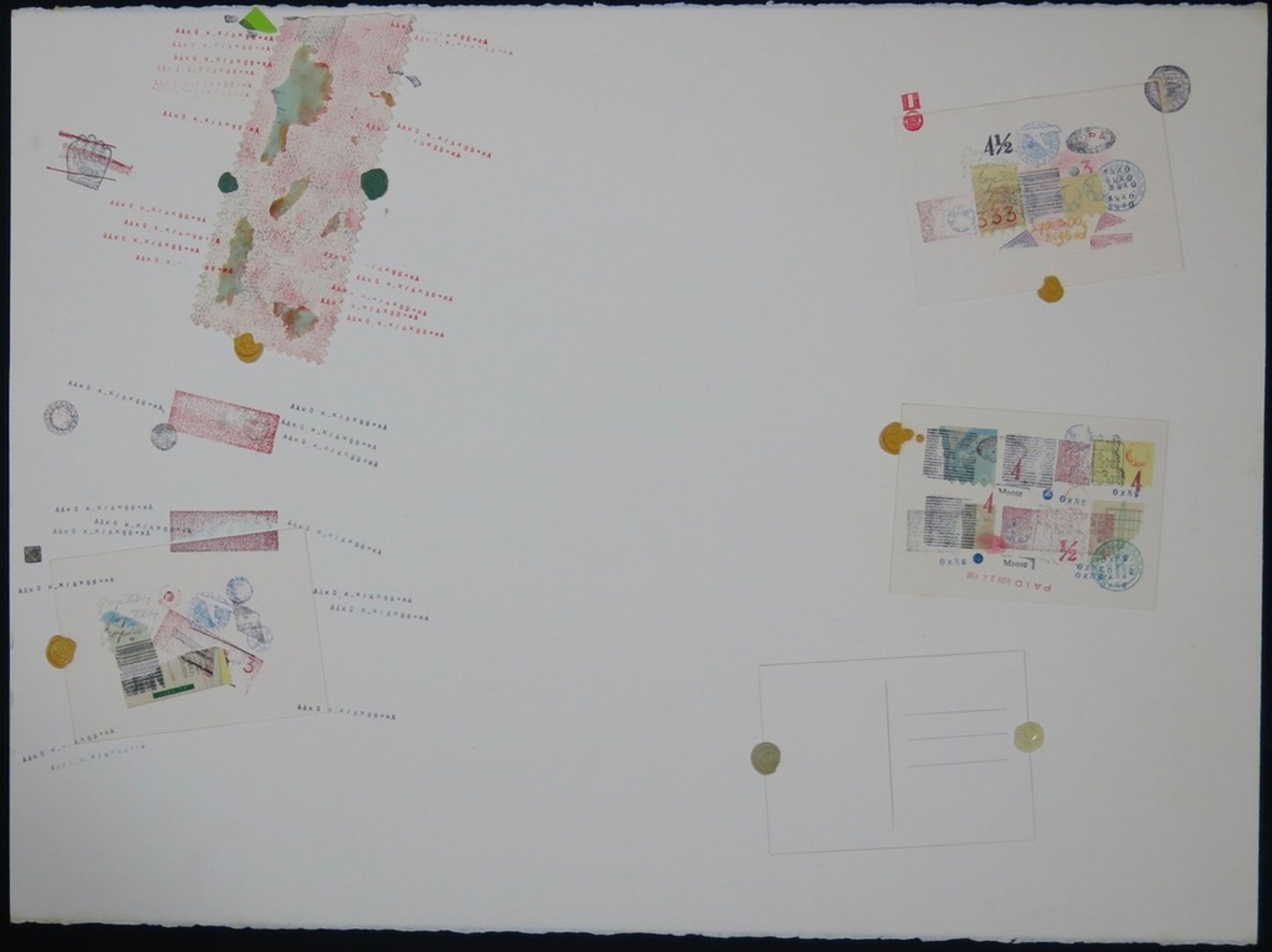 Materiaal: Gemengde techniek waaronder collage een stempels op papier