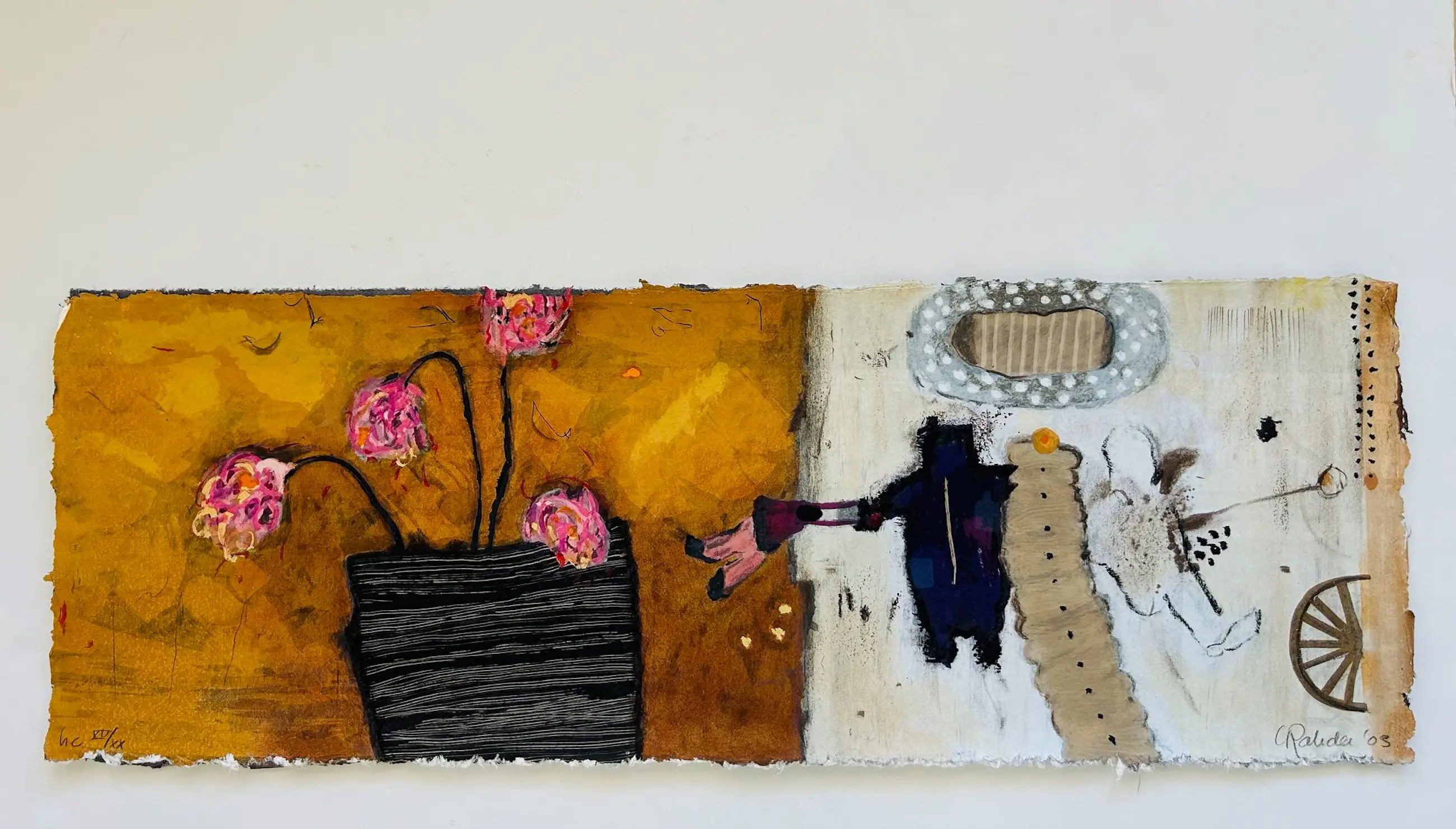 Mooie zeefdruk van Rahder op geschept papier. Het lijkt een aquarel maar het is grafiek van zeer hoogwaardige kwaliteit. Het werk is tot aan de grof geschepte randen bedrukt. Gesigneerd en genummerd met potlood.