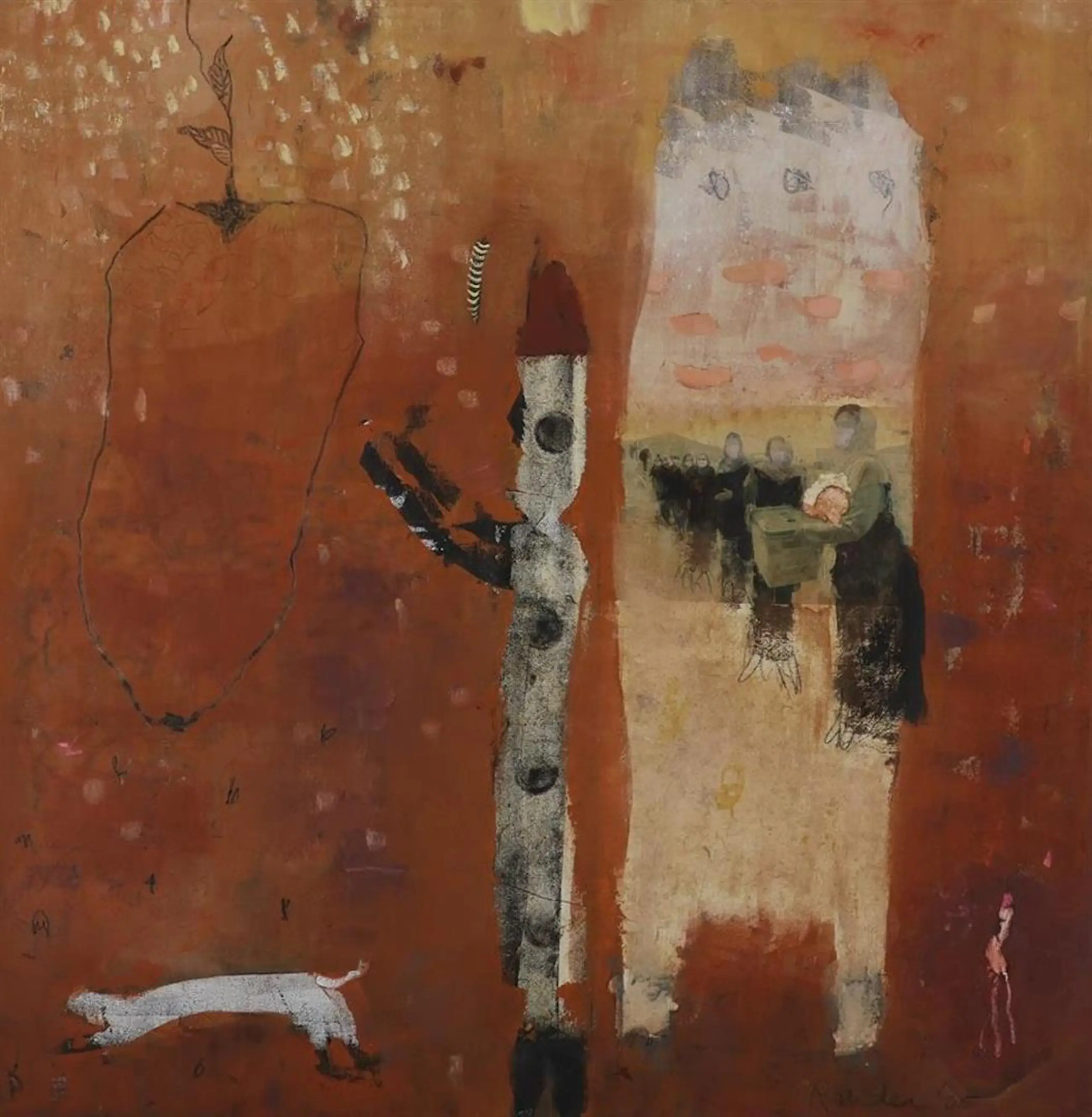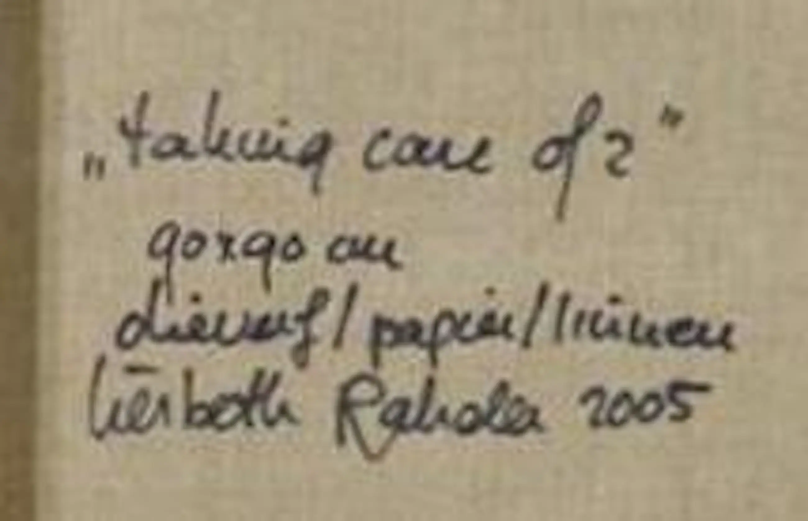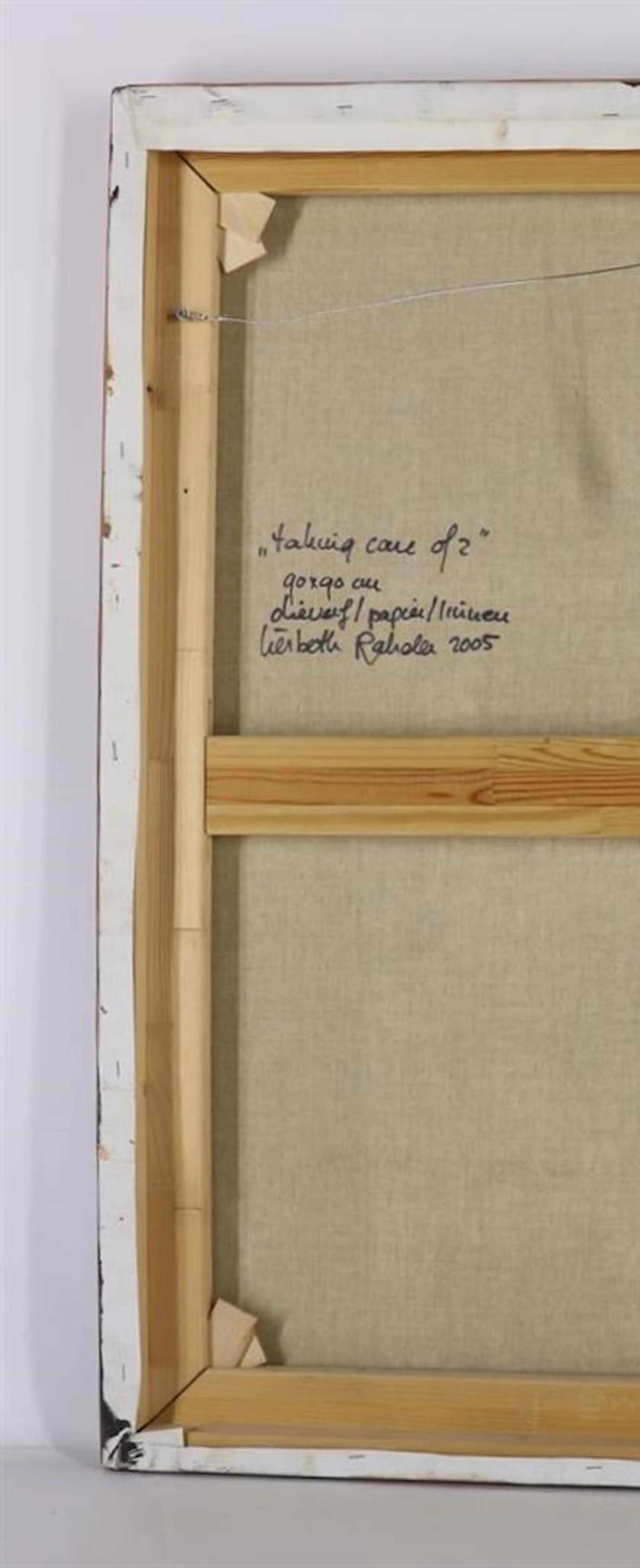 Gemengde techniek op doek van Liesbeth Rahder. Titel: "Taking care of 2". Jaar: 2005. Afmetingen doek: H90 x b90.5cm. Het werk is, rechts onderaan en op de achterkant, gesigneerd door de kunstenaar. De authenticiteit van het aangeboden werk wordt volledig gegarandeerd. Een certificaat van echtheid kan, op aanvraag, worden gemaild.