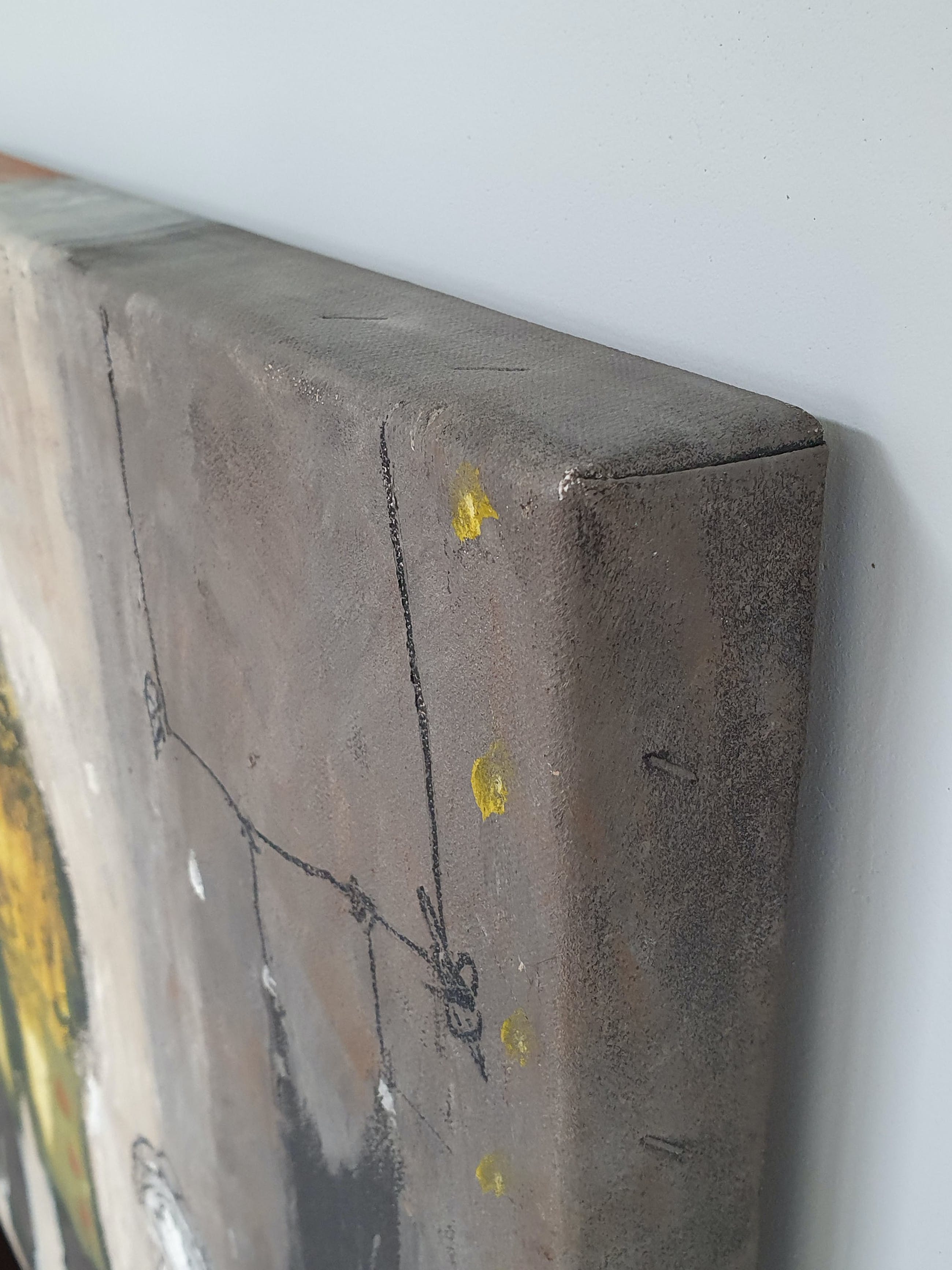 De randen van het werk zijn mee geschilderd en kan zonder lijst opgehangen worden.