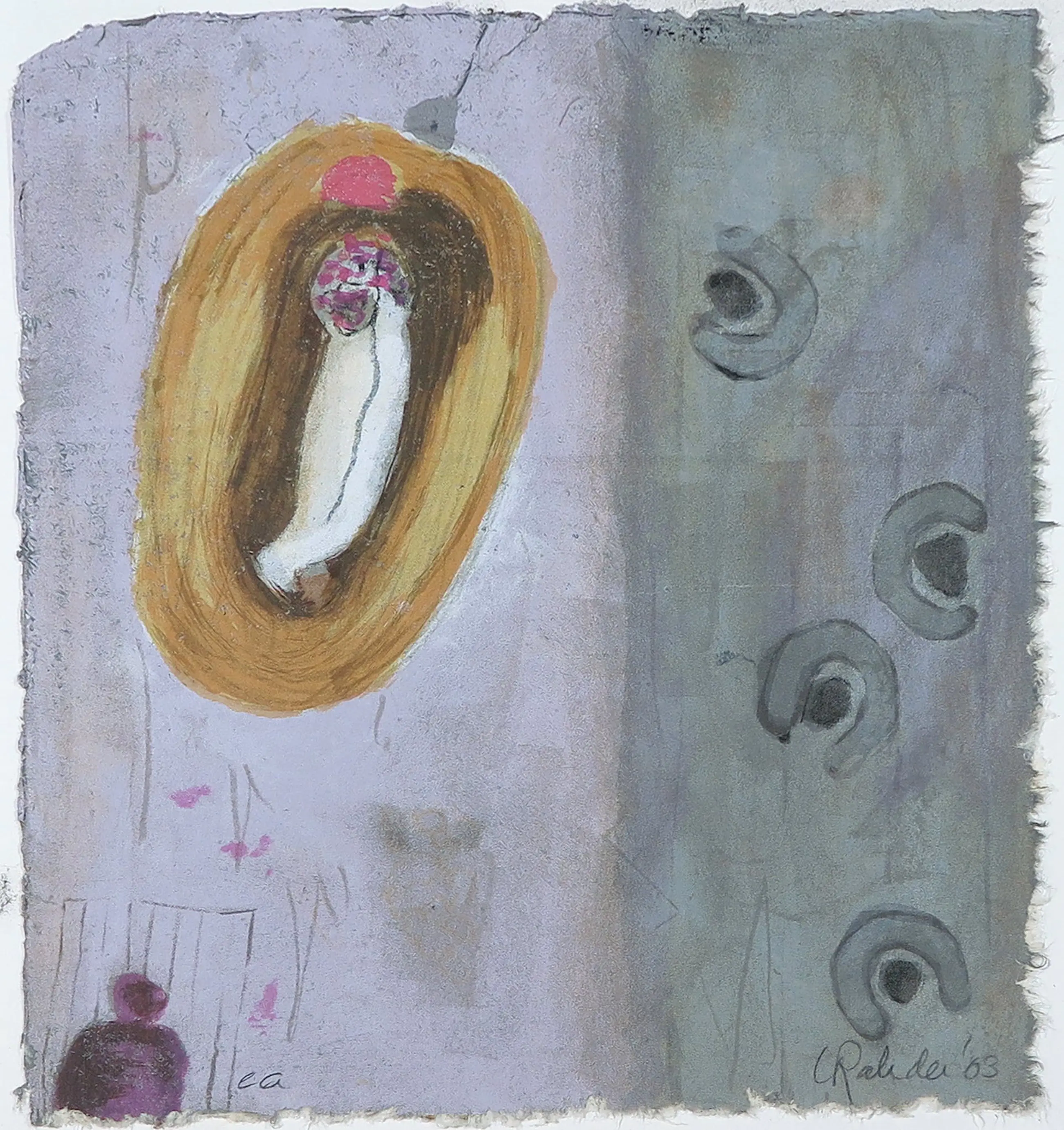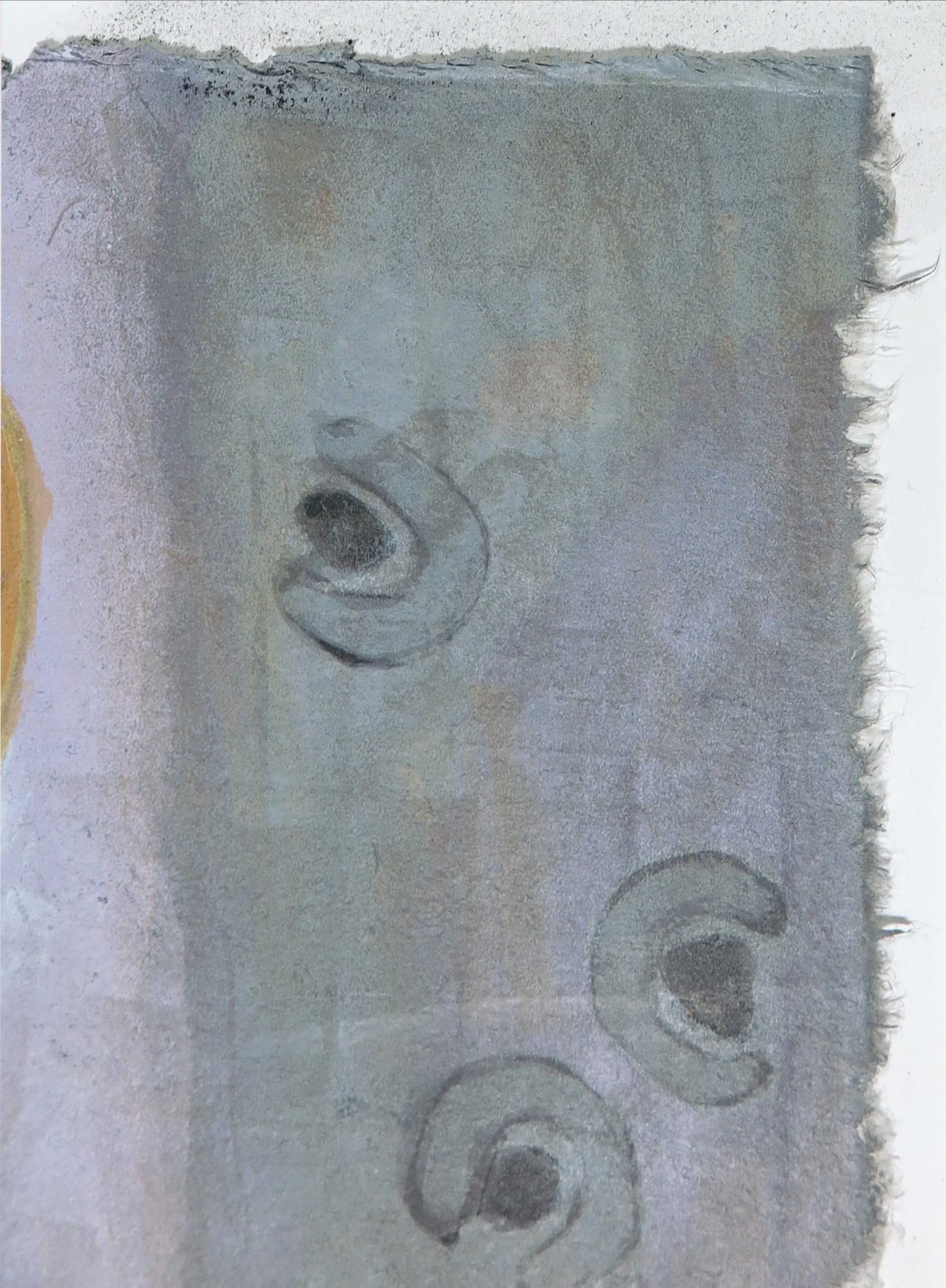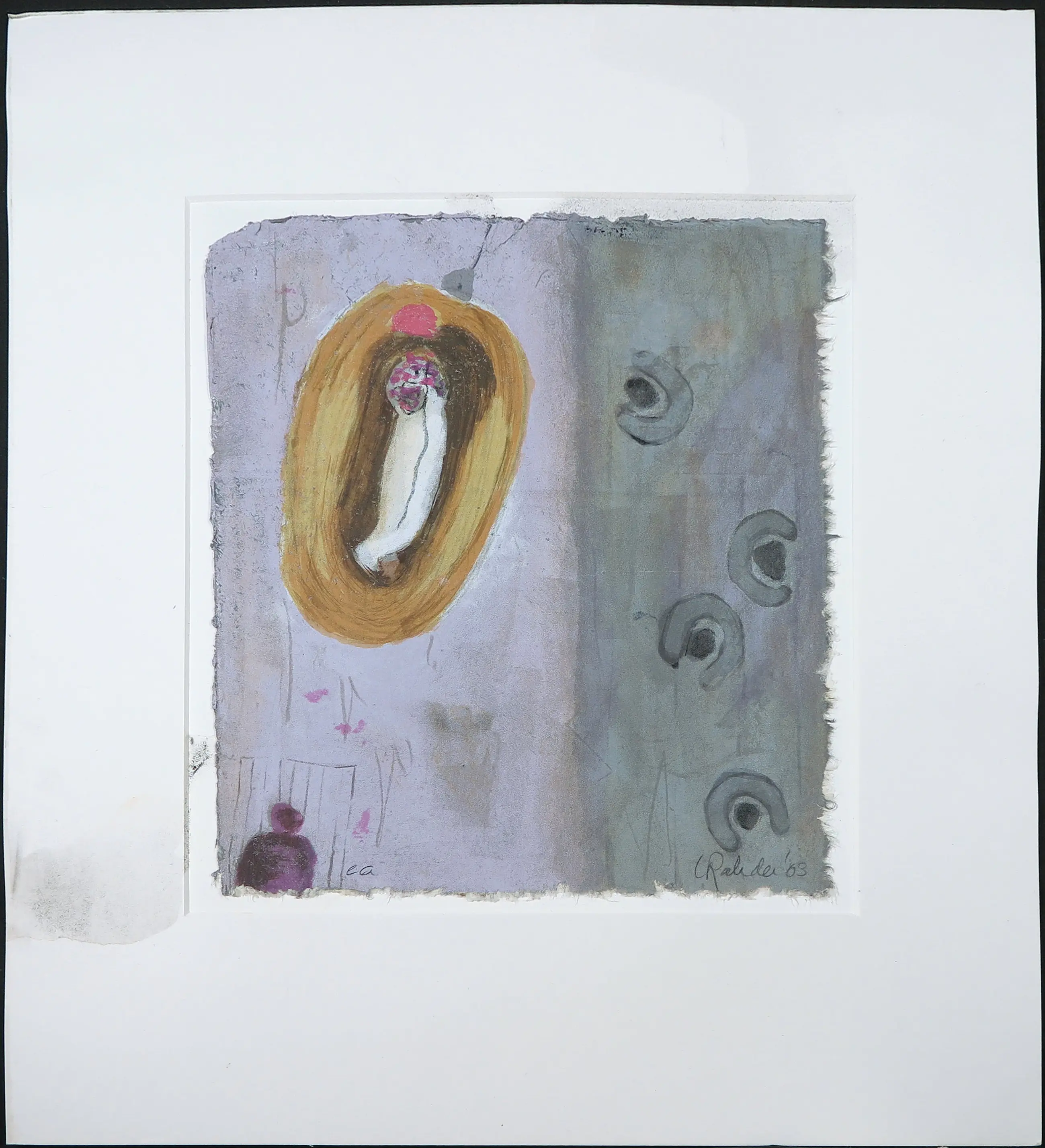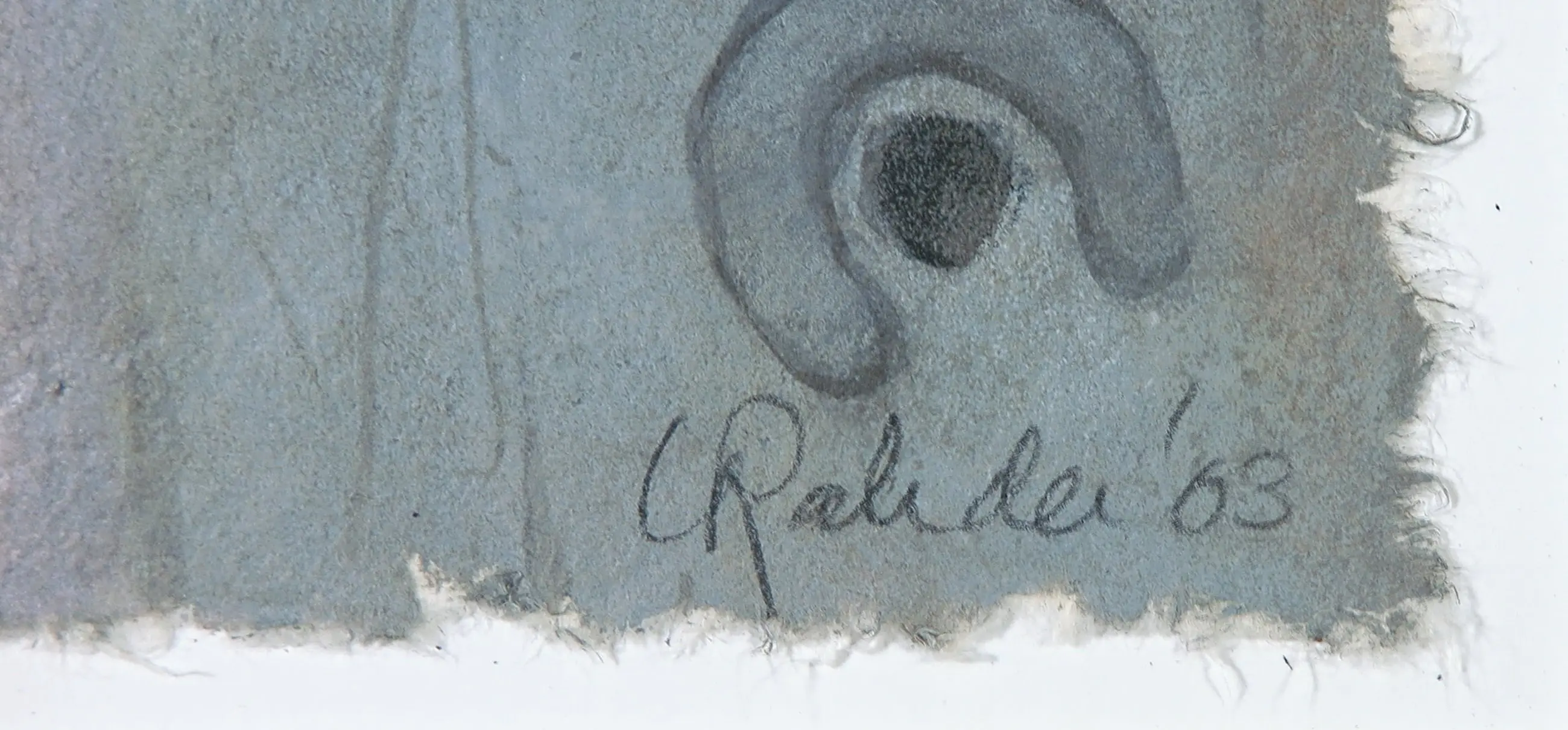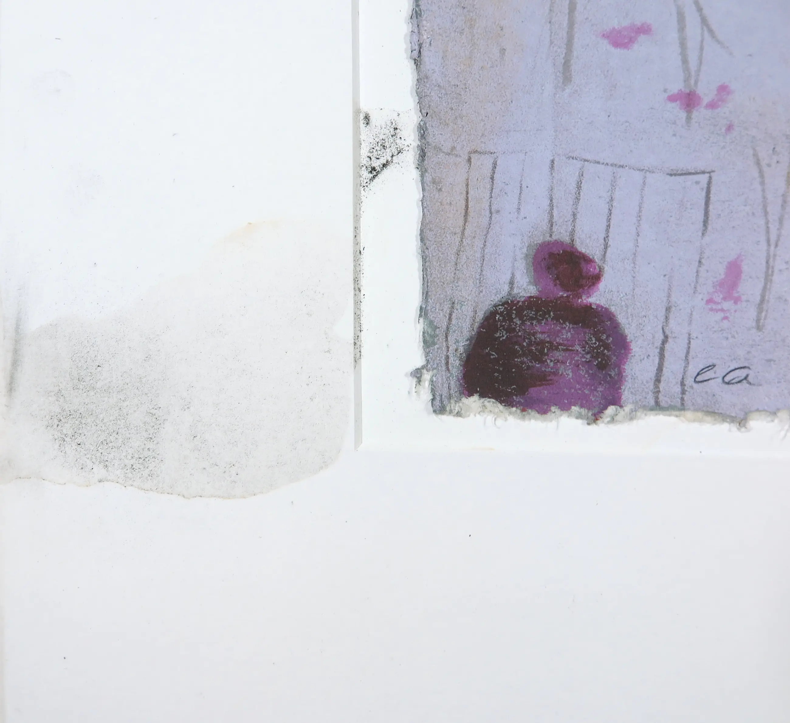 | Over het werk lijkt grafiet geknoeid te zijn, wat in de linkerhelft voor vlekken heeft gezorgd. Ook zit er vochtschade in zowel het passe-partout als het werk zelf. | |||||||||||