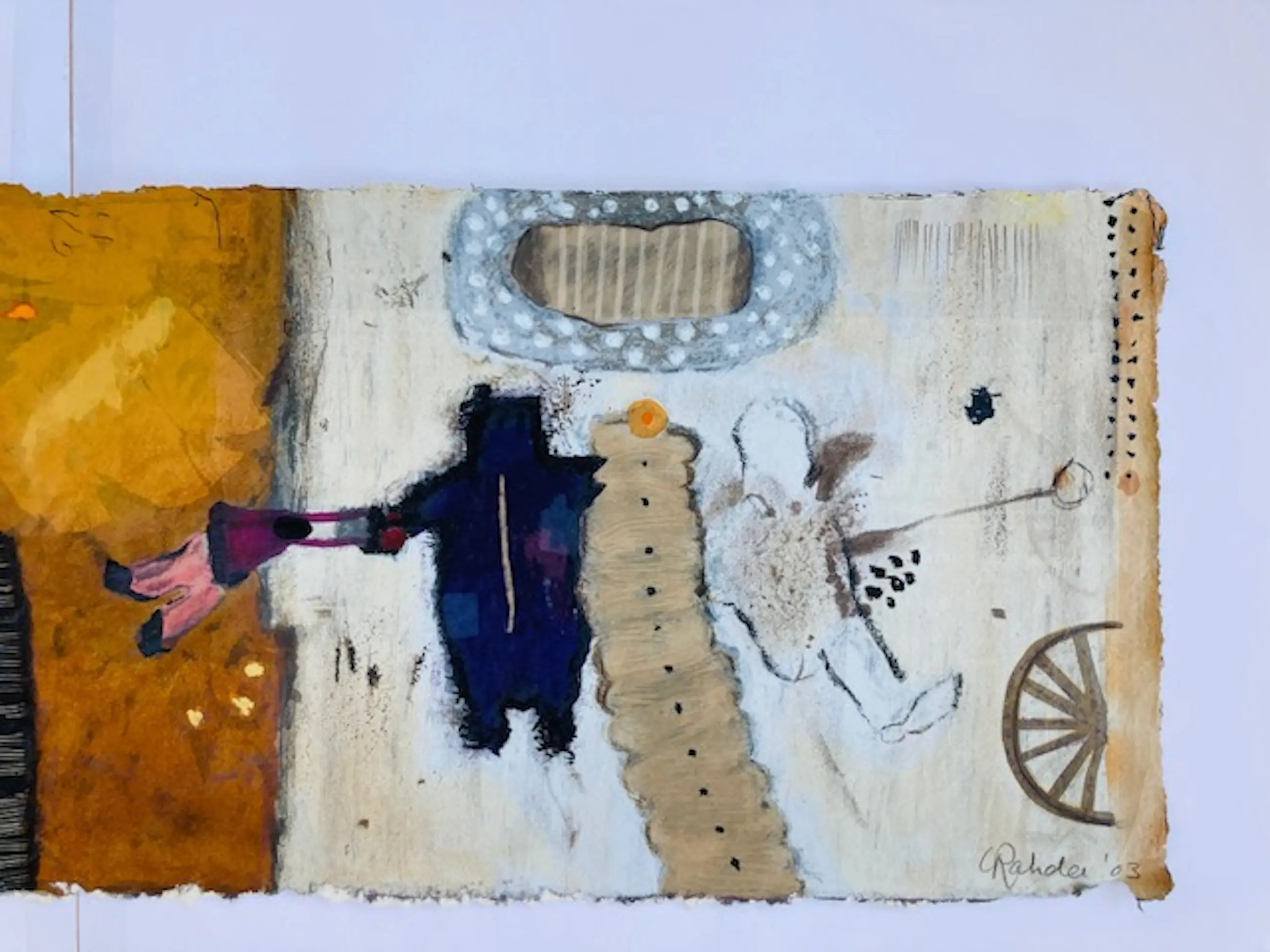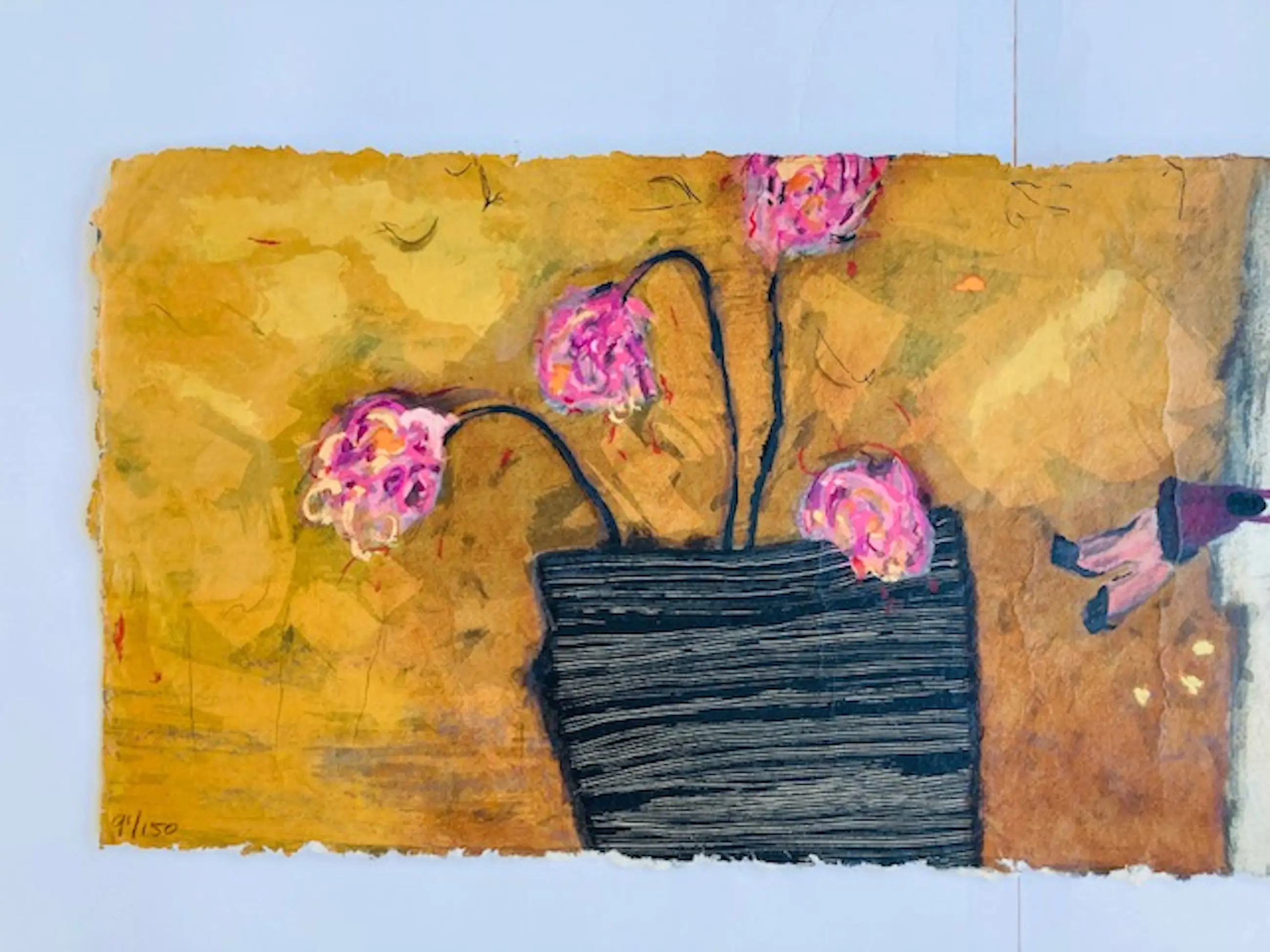 Mooie zeefdruk van Rahder op geschept papier. Het lijkt een aquarel maar het is grafiek van zeer hoogwaardige kwaliteit. Het werk is tot aan de grof geschepte randen bedrukt. Gesigneerd en genummerd met potlood.