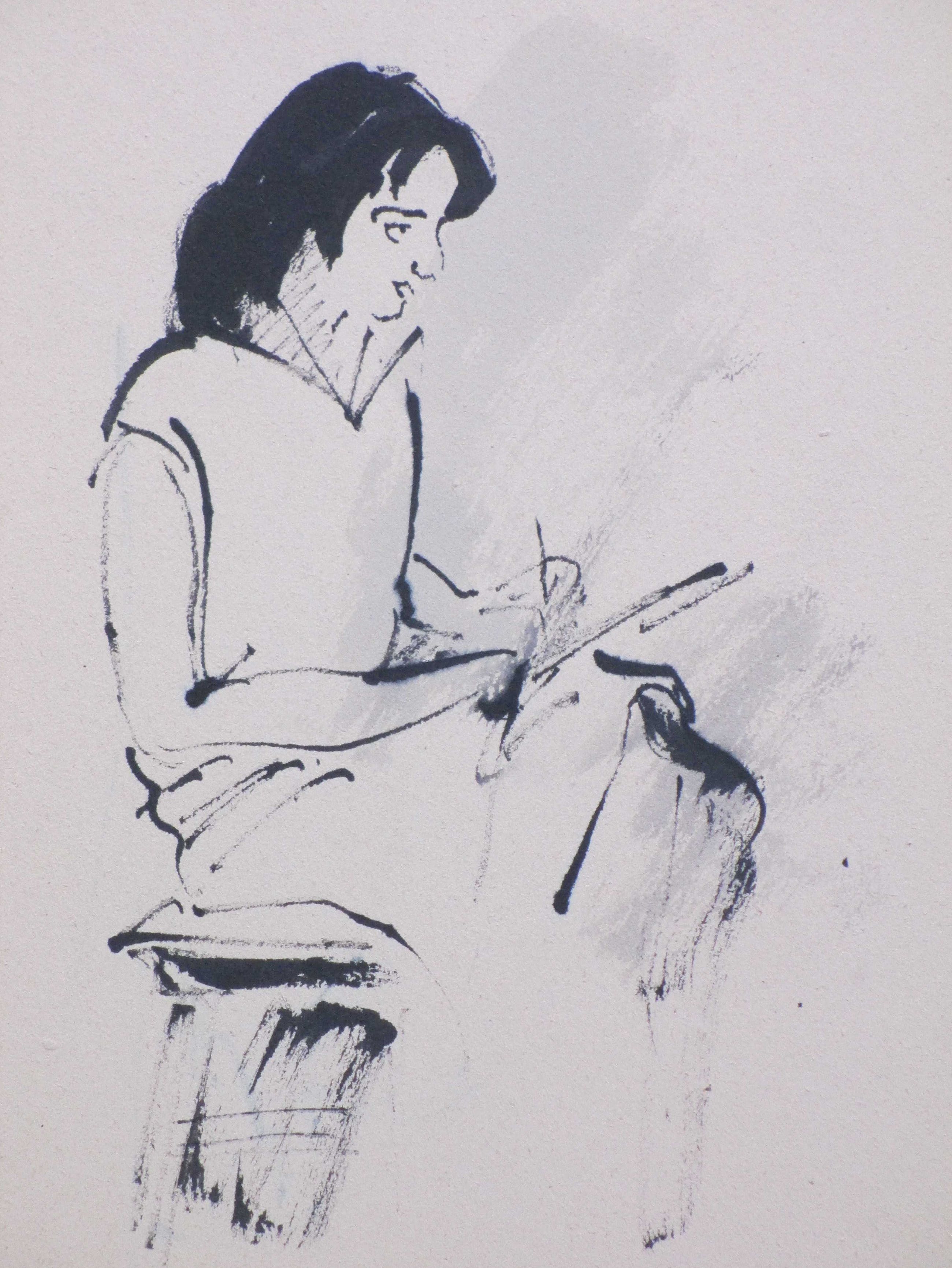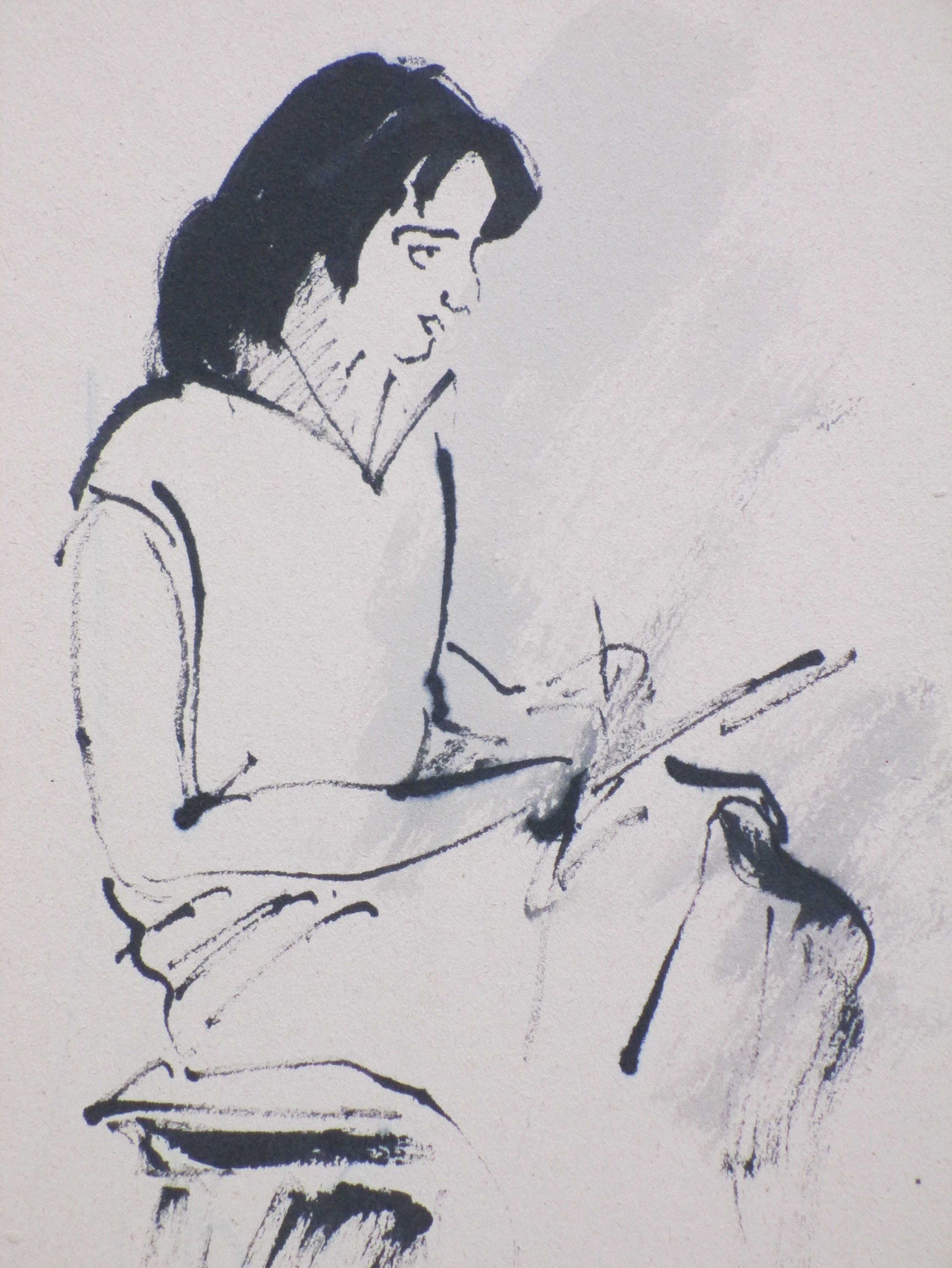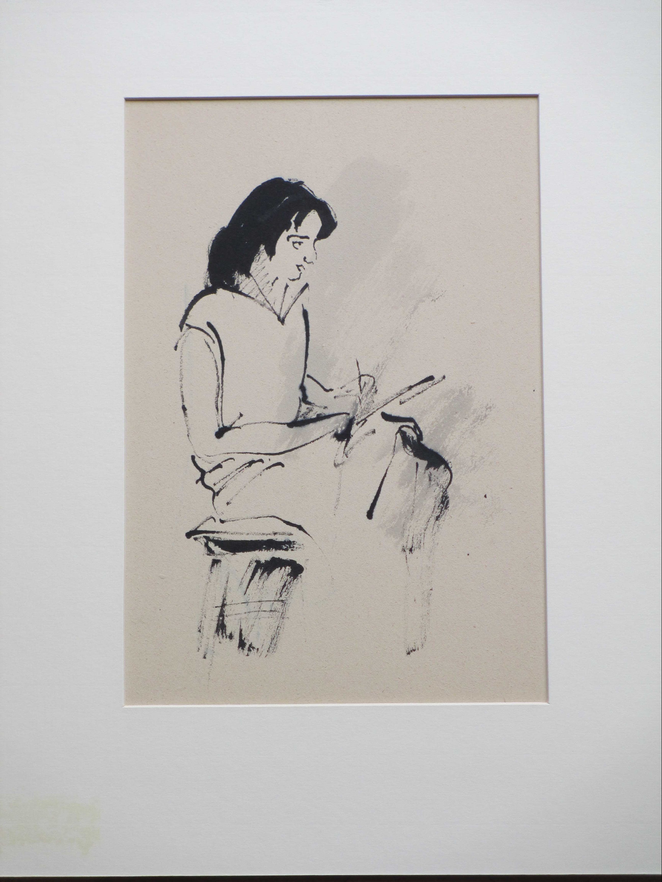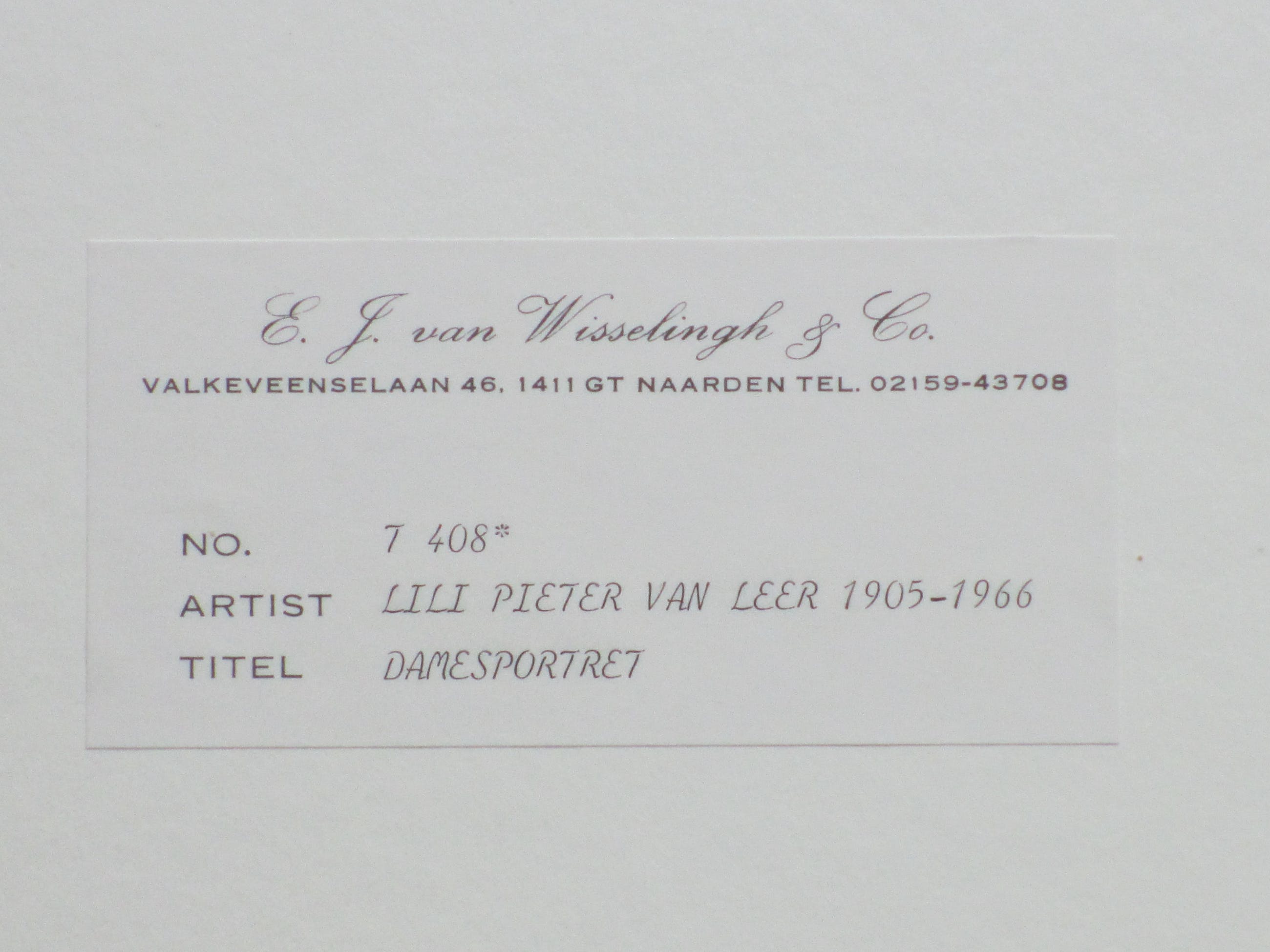Penseel/inkttekening door Lili Pieter van leer. Werk onder passepartout, beeldmaat 25x17, p.p.maat 39x31 Niet gesigneerd Herkomst: Kunsthandel E.J. van Wisselingh & Co, Naarden Titel op achterzijde: 'Damesportret' Authenticiteit volledig gegarandeerd