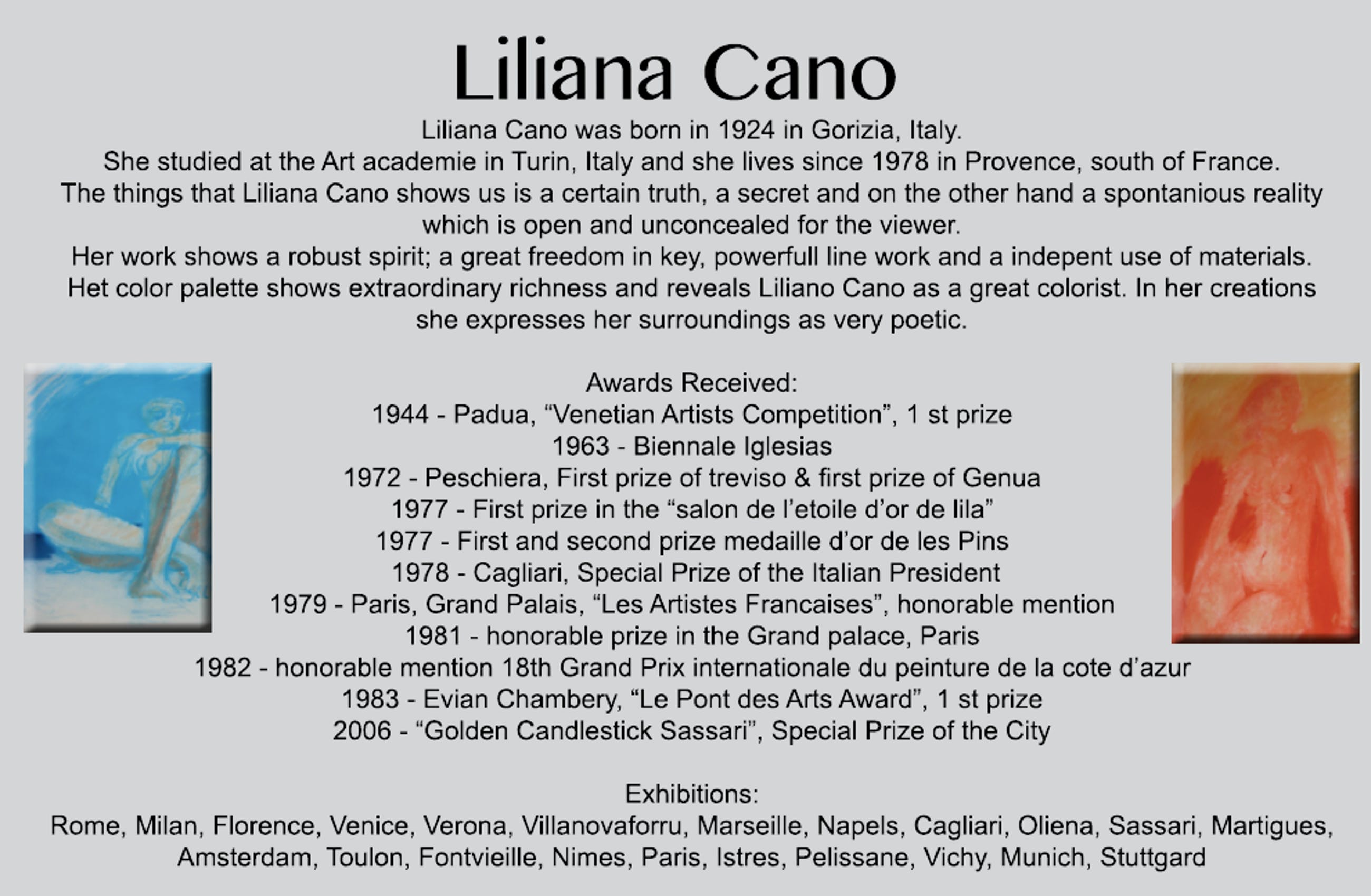 She started exhibiting in Rome, Florence, Avellino ,Brescia, and in many other Sardinian towns, such as Nuoro, Sassari, Olbia and Cagliari. She had taking part in various group exhibitions, in Padova in 1944 and Bologna in 1948. In the mid-40, Liliana Cano come back in Sassari where she teaches drawing and she has partecipated in the artistic life of the city with other painters such as Stanis Dessy, Libero Meledina, Costantino Spada, Pietro Antonio Manca and Ausonio Tanda. In 1978 in Cagliari Liliana Cano received the prestigious Special Award for artistic activity by the President of the Republic. Then she went to Barcelona, where she stops to work falling in love with the city. However, the real artistic life of Liliana Cano was in France, where she lived for twenty years in different cities : Arles, Istres, Marsiglia, Parigi, Avignone, Tolone. She has partecipated in several group exhibitions throughout Europe : Marsiglia, Parigi, Cannes, Monaco, Raastadt, Amsterdam, Barcellona and San Pietroburgo.