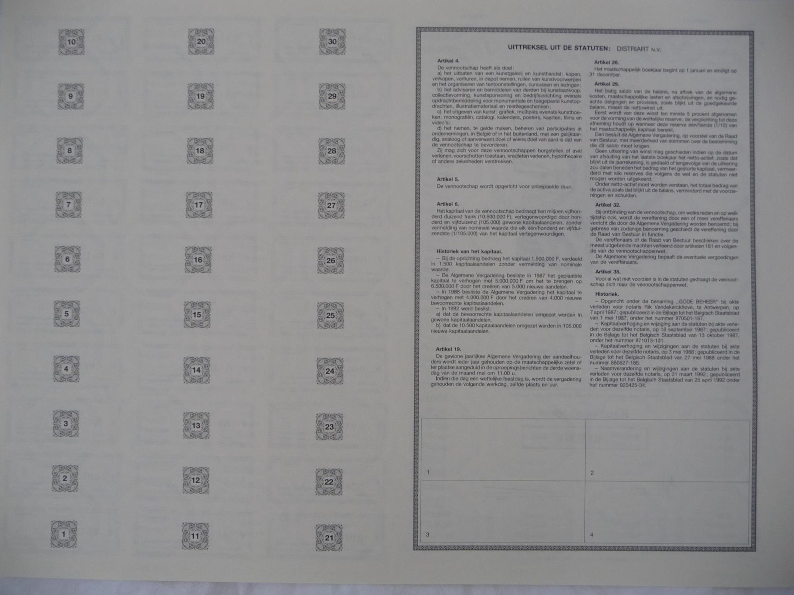 Liliane Vertessen Werk speciaal vervaardigd voor dit aandeel. Genummerd aandeel met coupon gesigneerd in de druk nummering wijkt af van de foto. Titel; Distriart Belgie Uitgever; Distriart n.v. Galerie Forum, Oosteinde 1987 Oorspronkelijk zouden er 1000 aandelen worden uitgegeven door 100 kunsenaars. De oplage werd uiteindelijk slechts 16 exemplaren. Het nummer van het aandeel van Lliane Vertessen is 0,001.528 Op de achterkant een uittreksel van de statuten van distriart