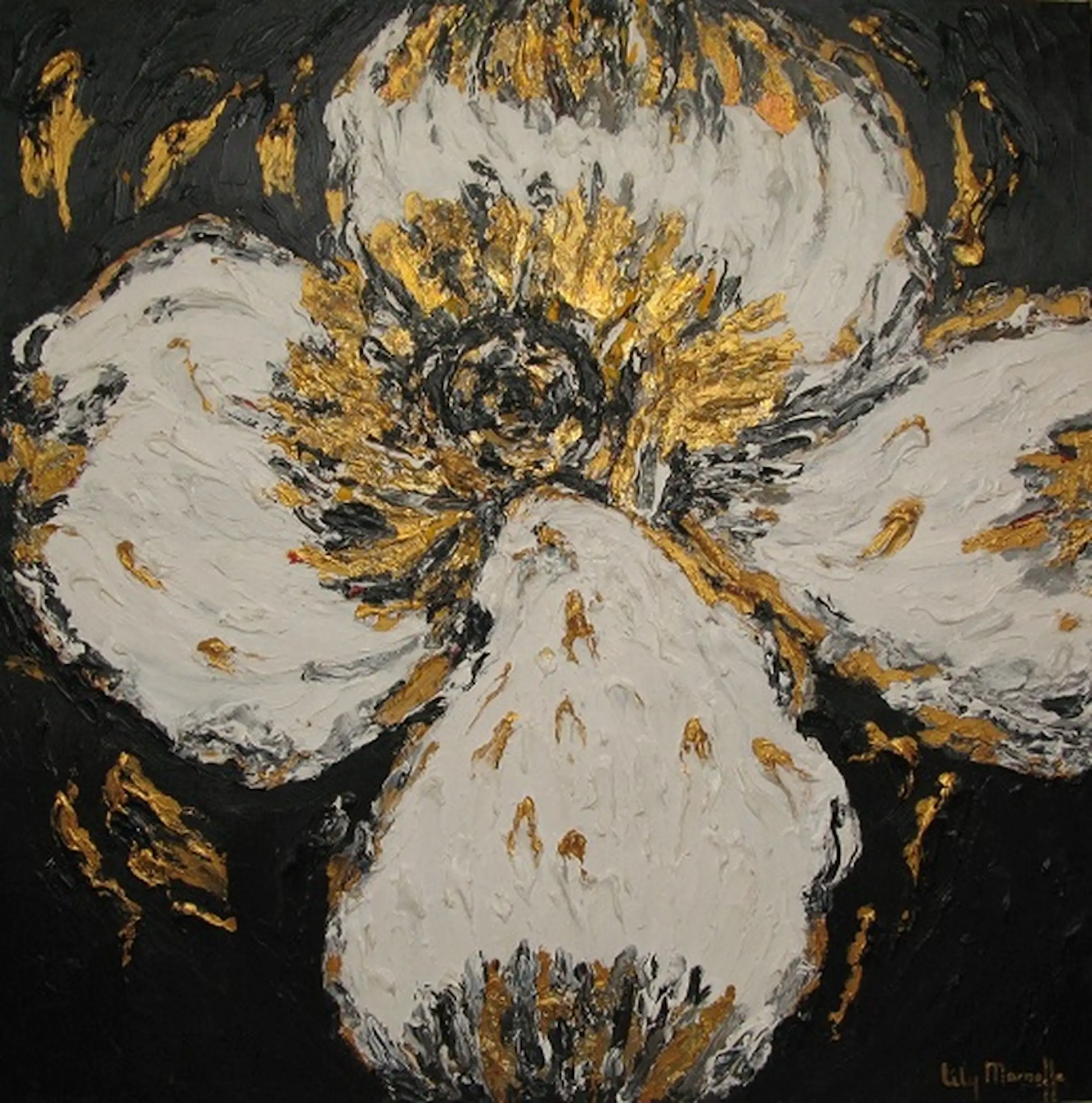 Het canvasdoek is bewerkt met dikke verf; zwart, wit en 24-karaats bladgoud. Op het frame is een lampje gemonteerd. Het doek is van 2007 en verkeert in goede staat en is een eye-catcher in de kamer.