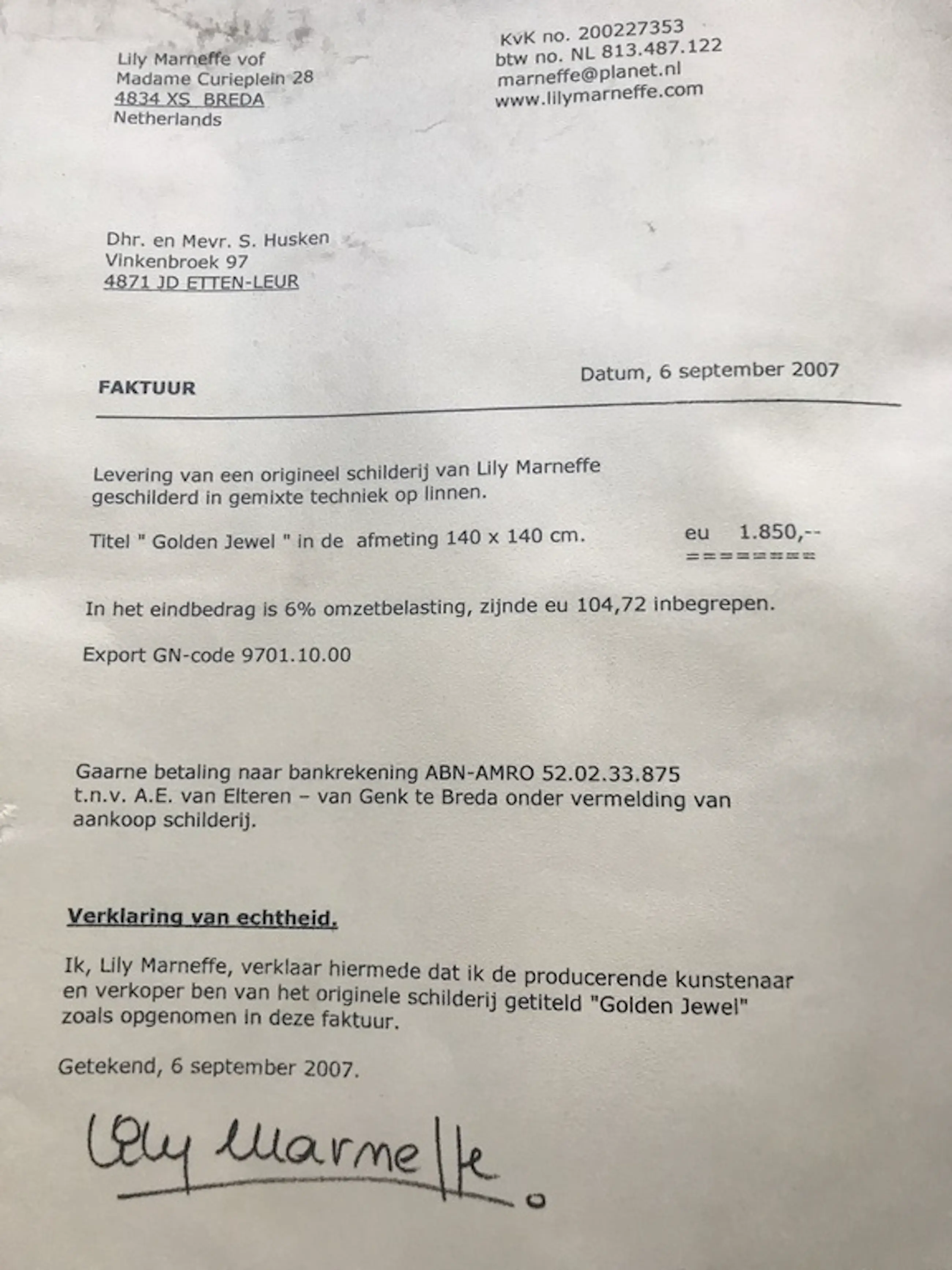 | Afhalen | Het werk is af te halen op locatie. Als koper dient u zelf verpakkingsmateriaal mee te nemen. De locatie is: Etten-leur, Nederland |