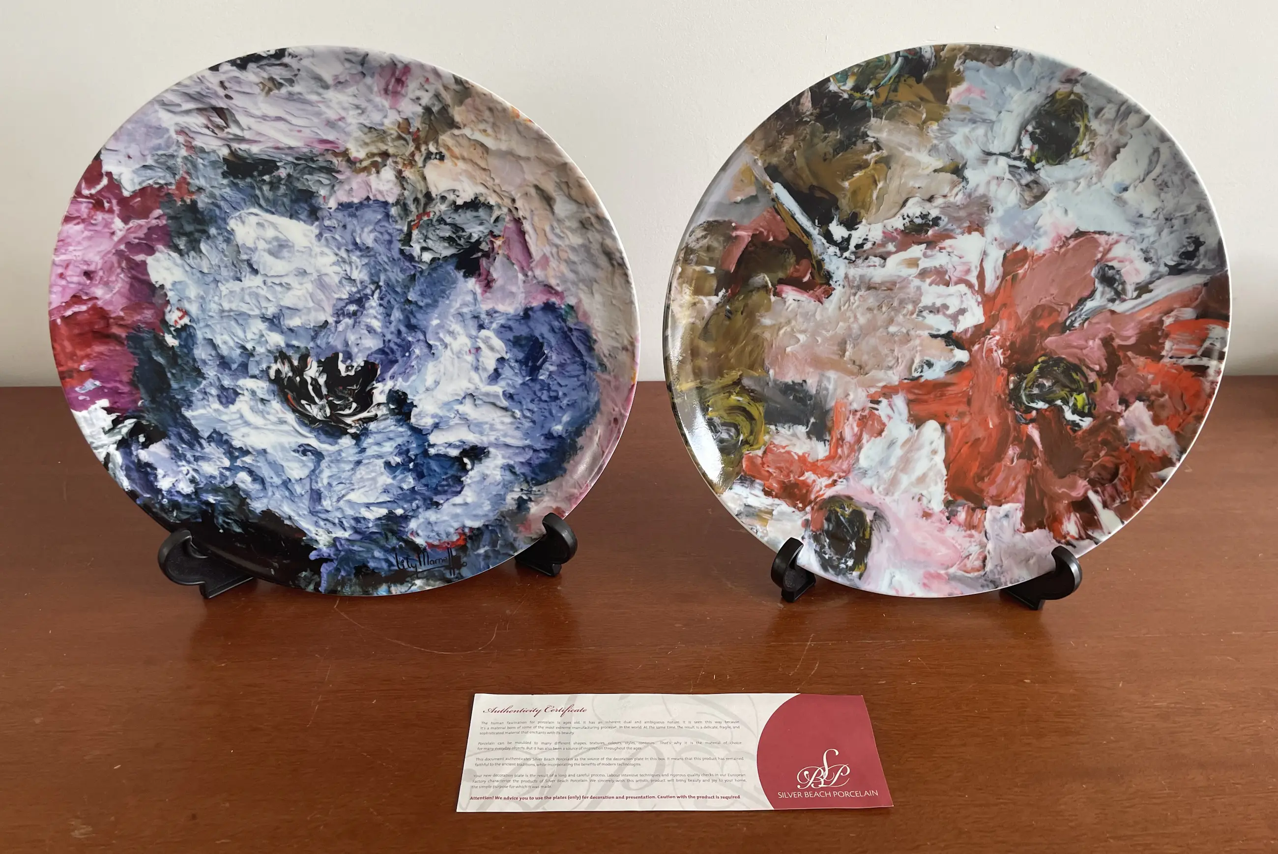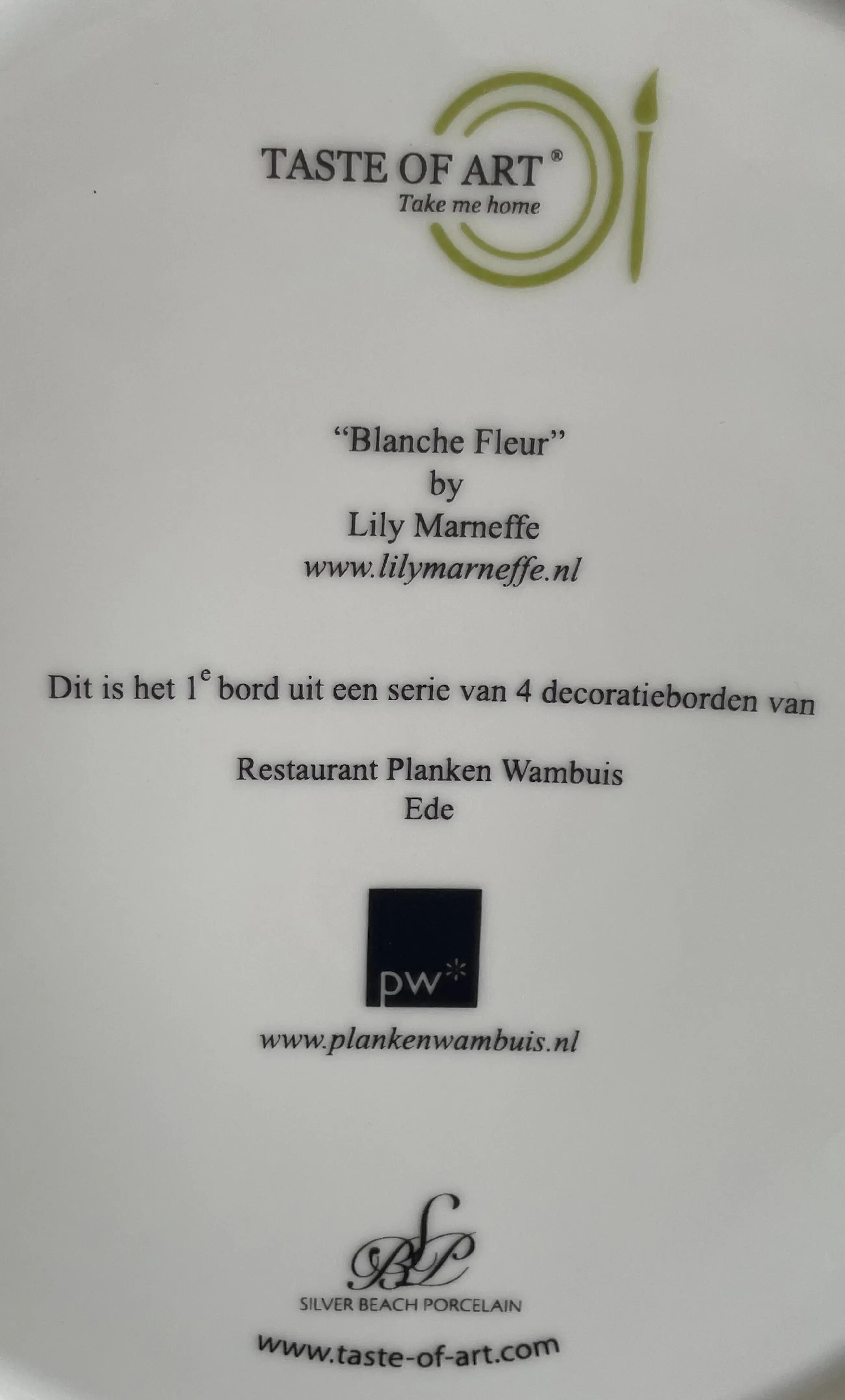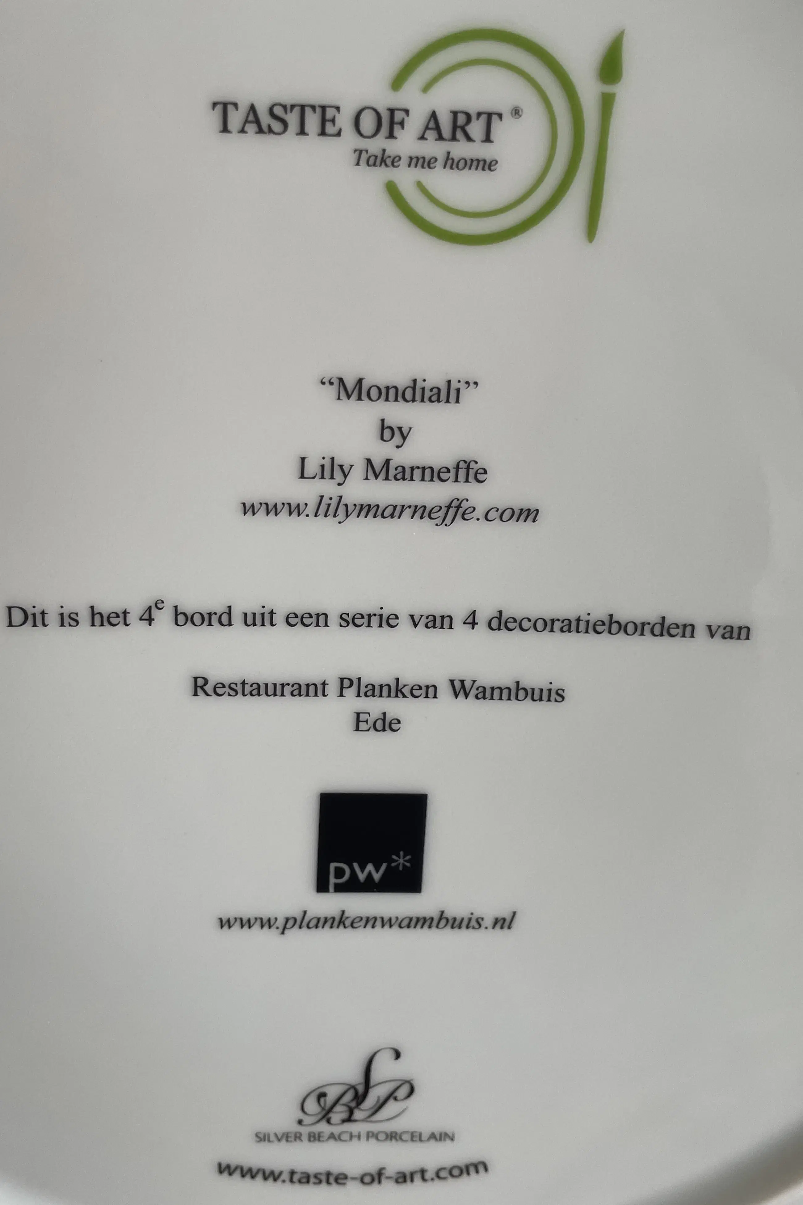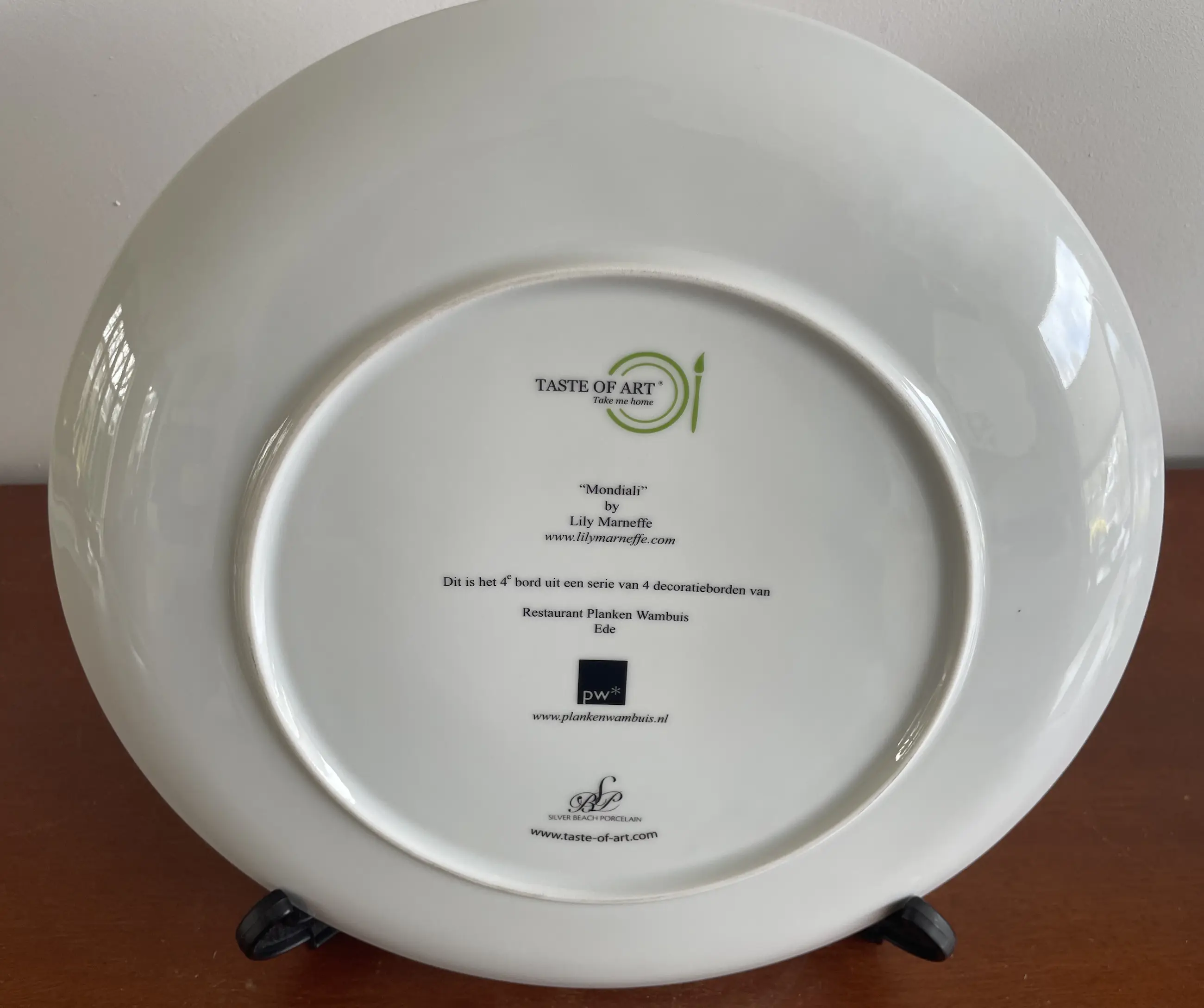 Twee kunstporseleinen sierborden met abstract decor getiteld "Mondiali" en "Blanche Fleur" uitgevoerd door de Nederlandse-Franse kunstenaresse Lily Marneffe voor een serie decoratie borden voor bekende Nederlandse restaurants. Dit zijn bord nr 1 en 4 uitgevoerd voor het restaurant Planken Wambuis uit Ede. In perfecte nieuw conditie en komt inclusief een certificaat van authenciteit van het merk Silver Beach Porcelian. De originele doos is ook aanwezig maar in minder goede staat.