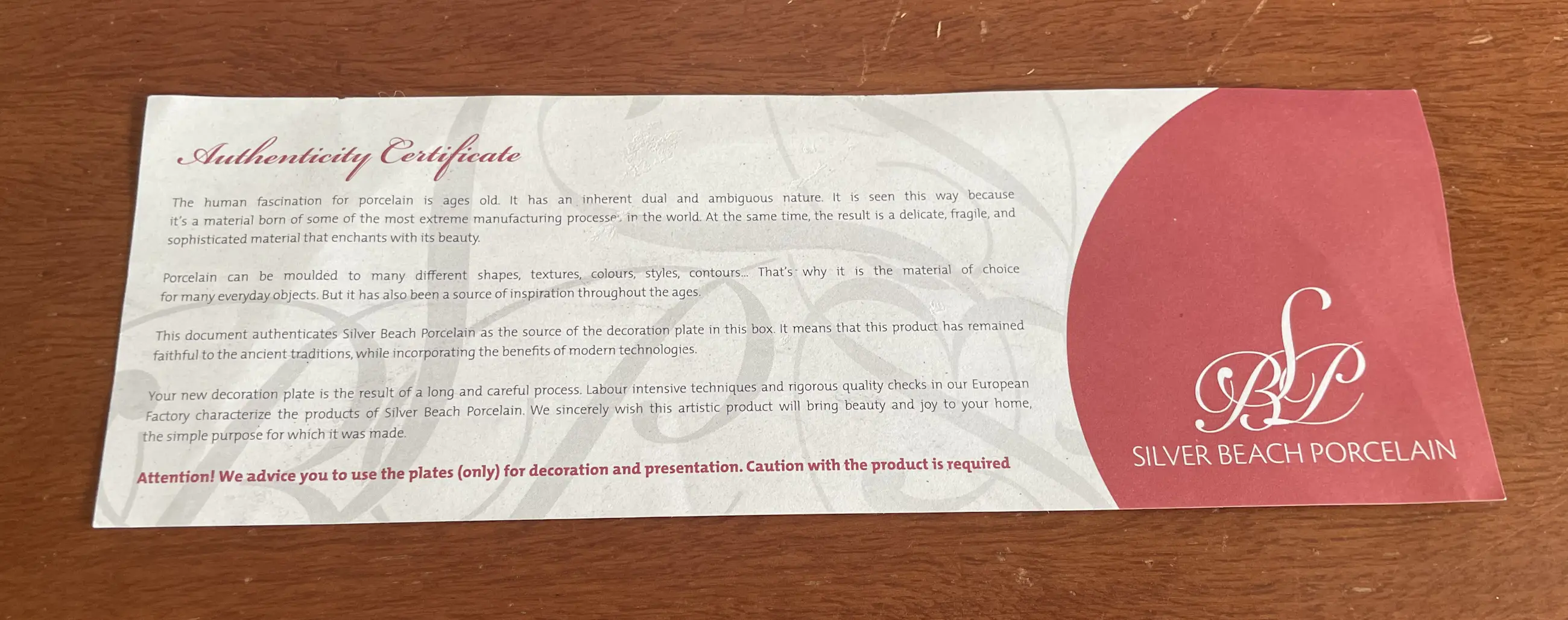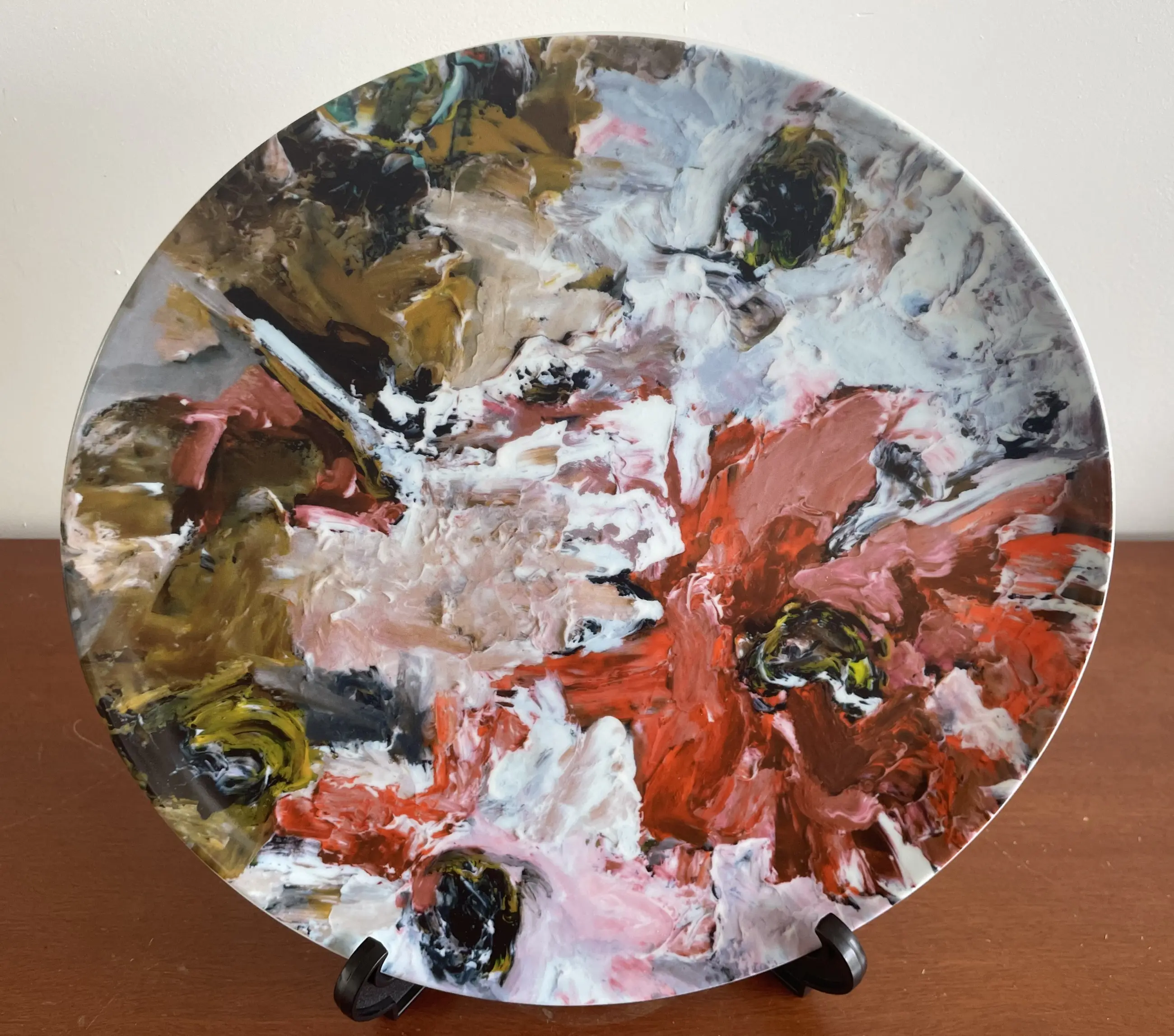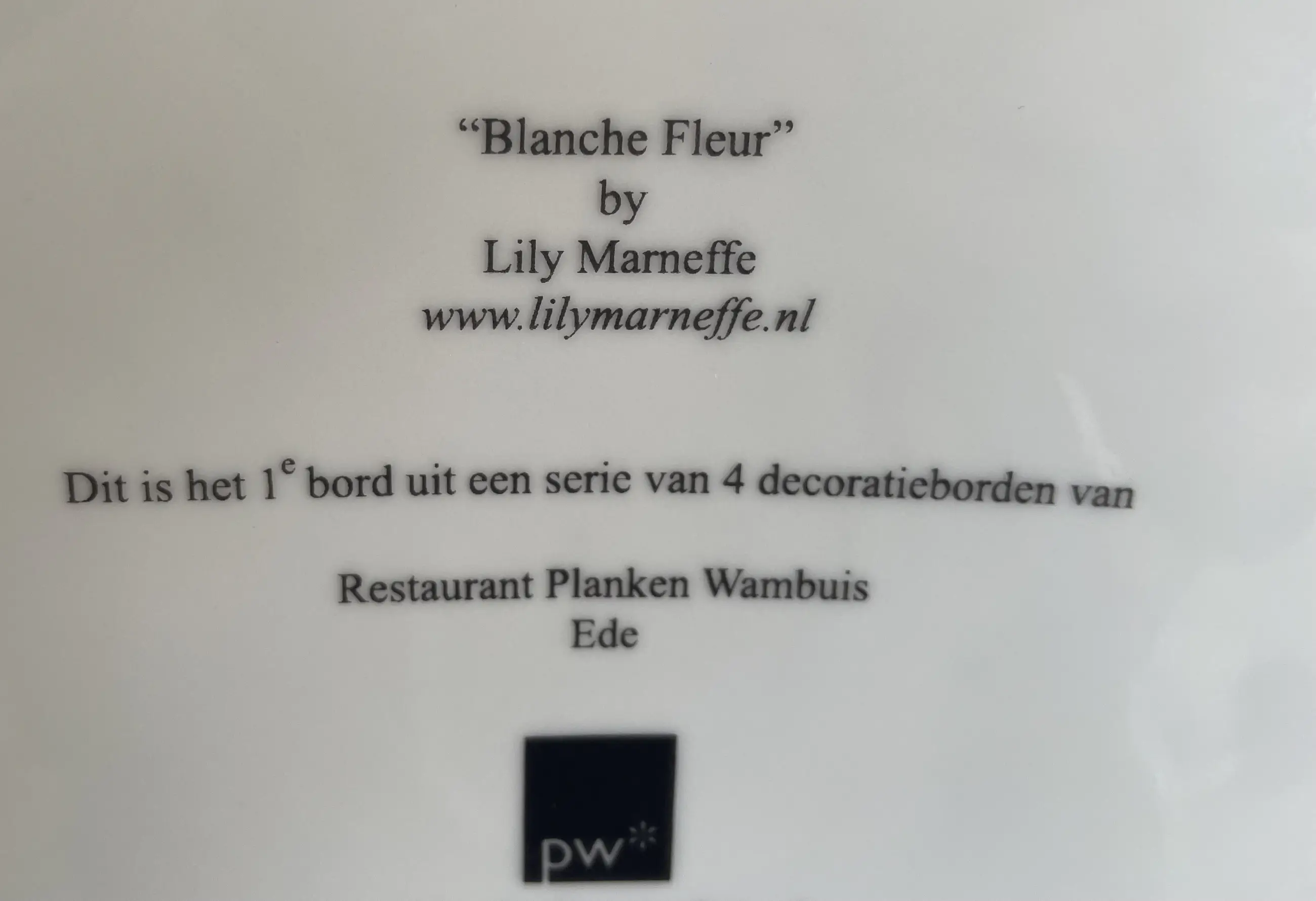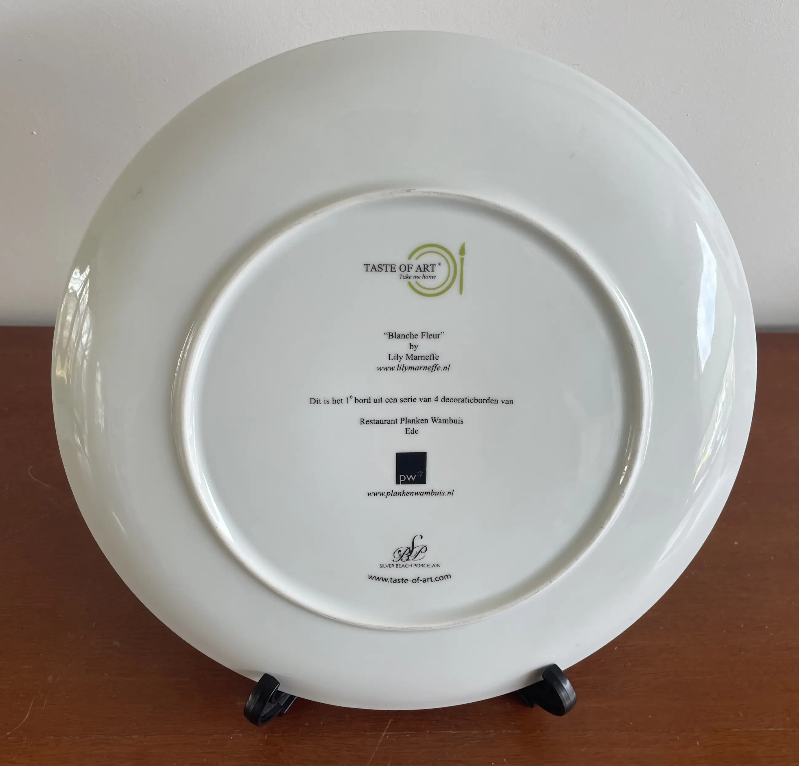 Twee kunstporseleinen sierborden met abstract decor getiteld "Mondiali" en "Blanche Fleur" uitgevoerd door de Nederlandse-Franse kunstenaresse Lily Marneffe voor een serie decoratie borden voor bekende Nederlandse restaurants. Dit zijn bord nr 1 en 4 uitgevoerd voor het restaurant Planken Wambuis uit Ede. In perfecte nieuw conditie en komt inclusief een certificaat van authenciteit van het merk Silver Beach Porcelian. De originele doos is ook aanwezig maar in minder goede staat.