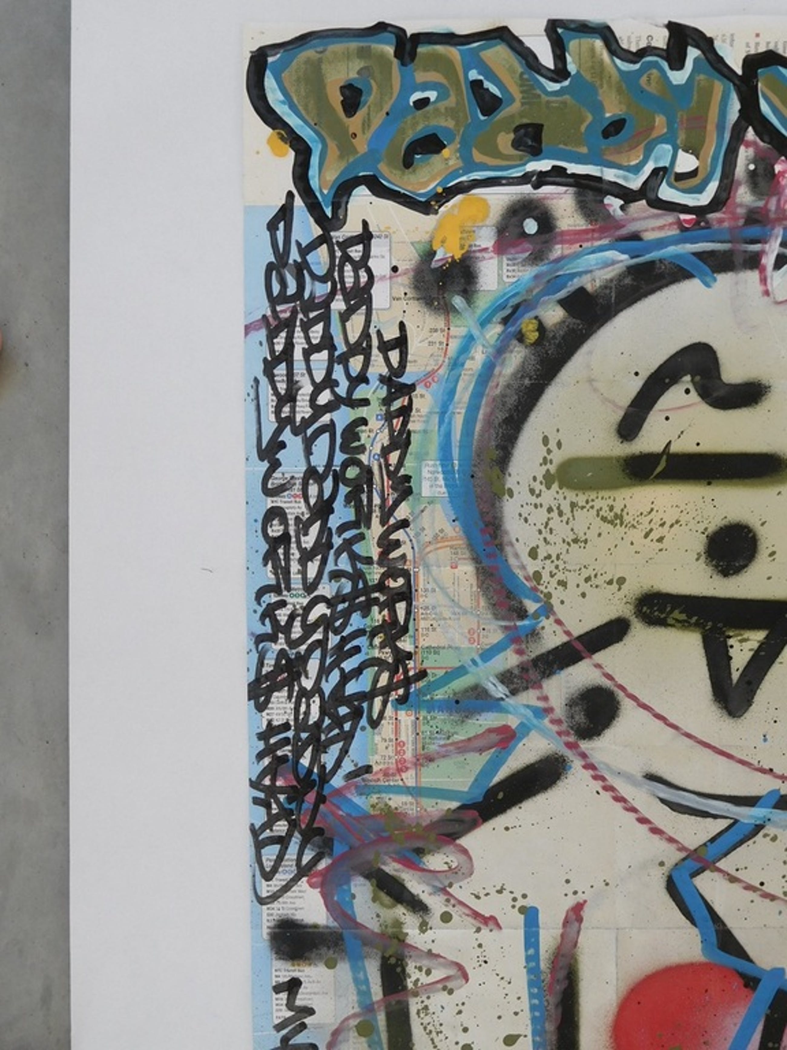 Origineel werk op Metro plattegrond van NYC van Graffiti kunstenaar Quik Lin Felton (1958). Het werk heeft als titel "My Daddy Works" en is gemaakt met diverse matarialen zoals spuitbus en acryl verf. Het werk meet 83 x 58 cm. Dit werk komt goed tot zijn recht in een plexiglazen omlijsting. Wordt aangetekend in koker verstuurd.