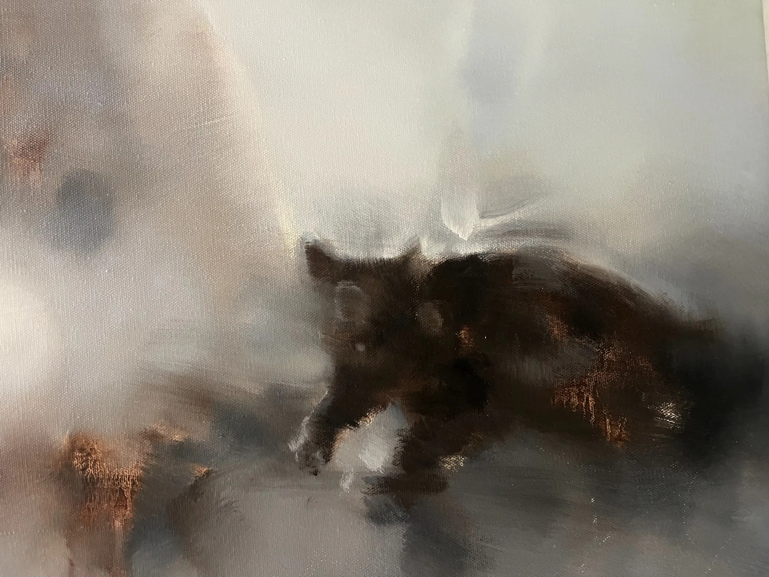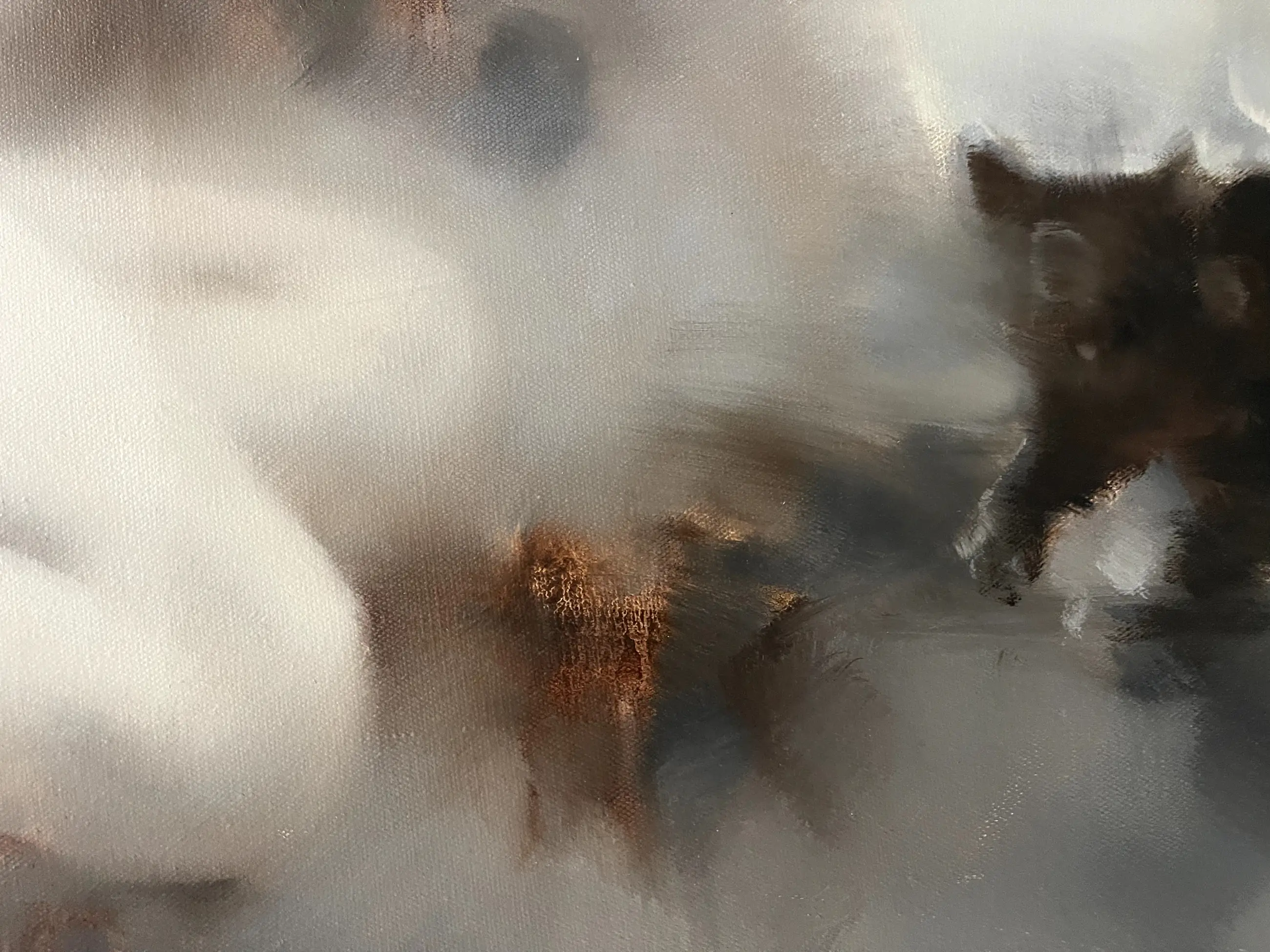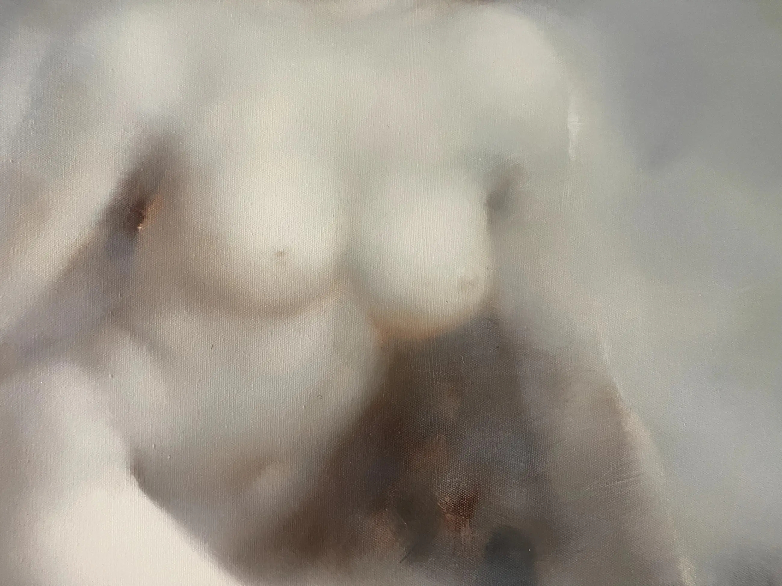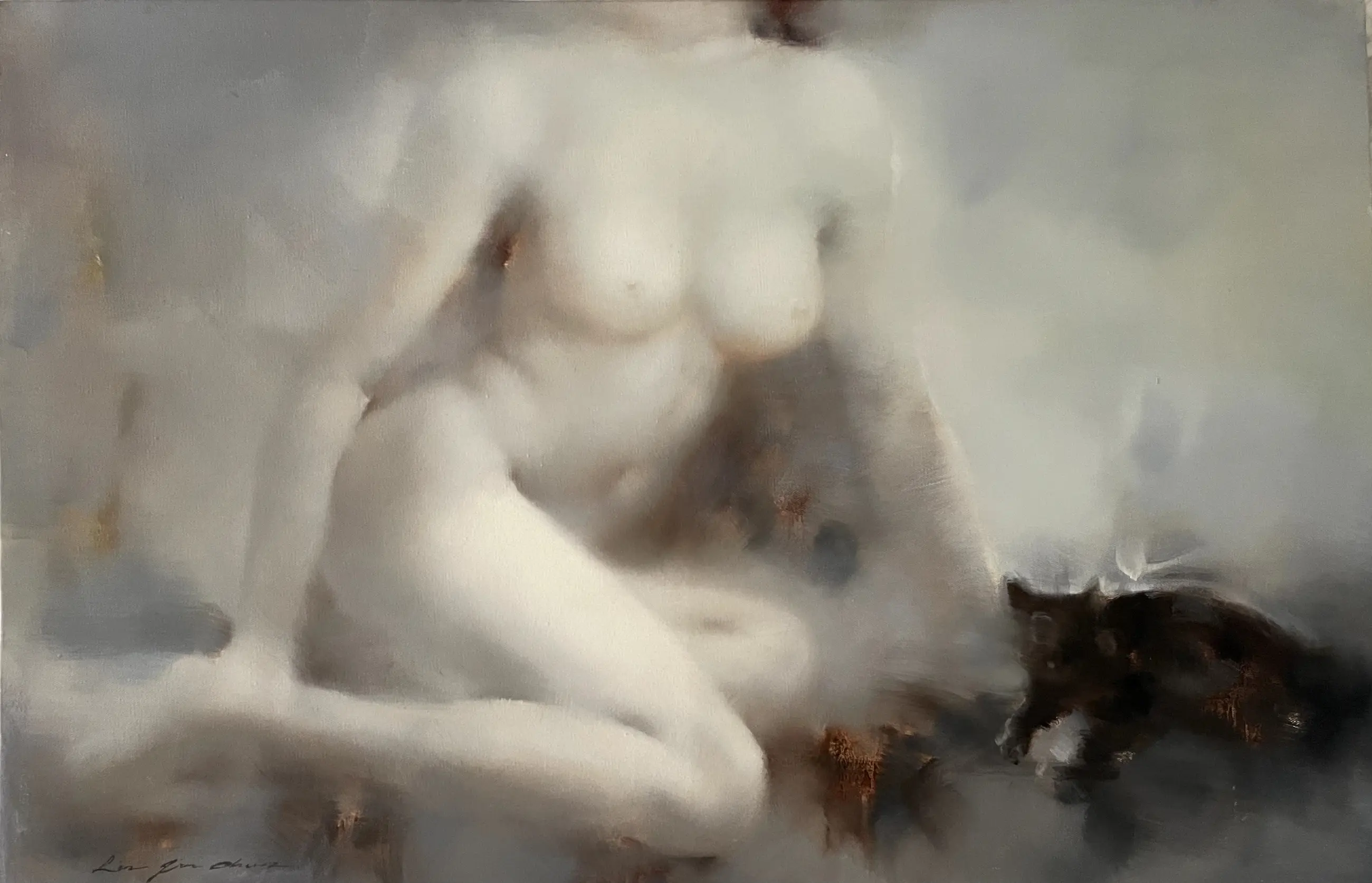 Dit schilderij uit de serie naakten van Chun toont een naakt poserende vrouw met een kat aan haar voeten. De handtekening staat links onder op het schilderij.