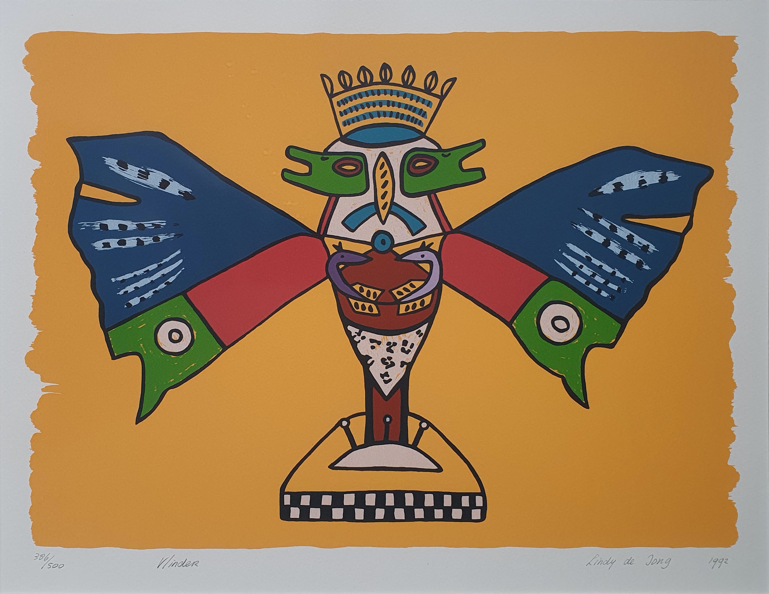 Zeefdruk uit 1992 van Lindy de Jong met de titel: 'Vlinder'. Het werk is rechtsonder met de hand gesigneerd door de kunstenaar.