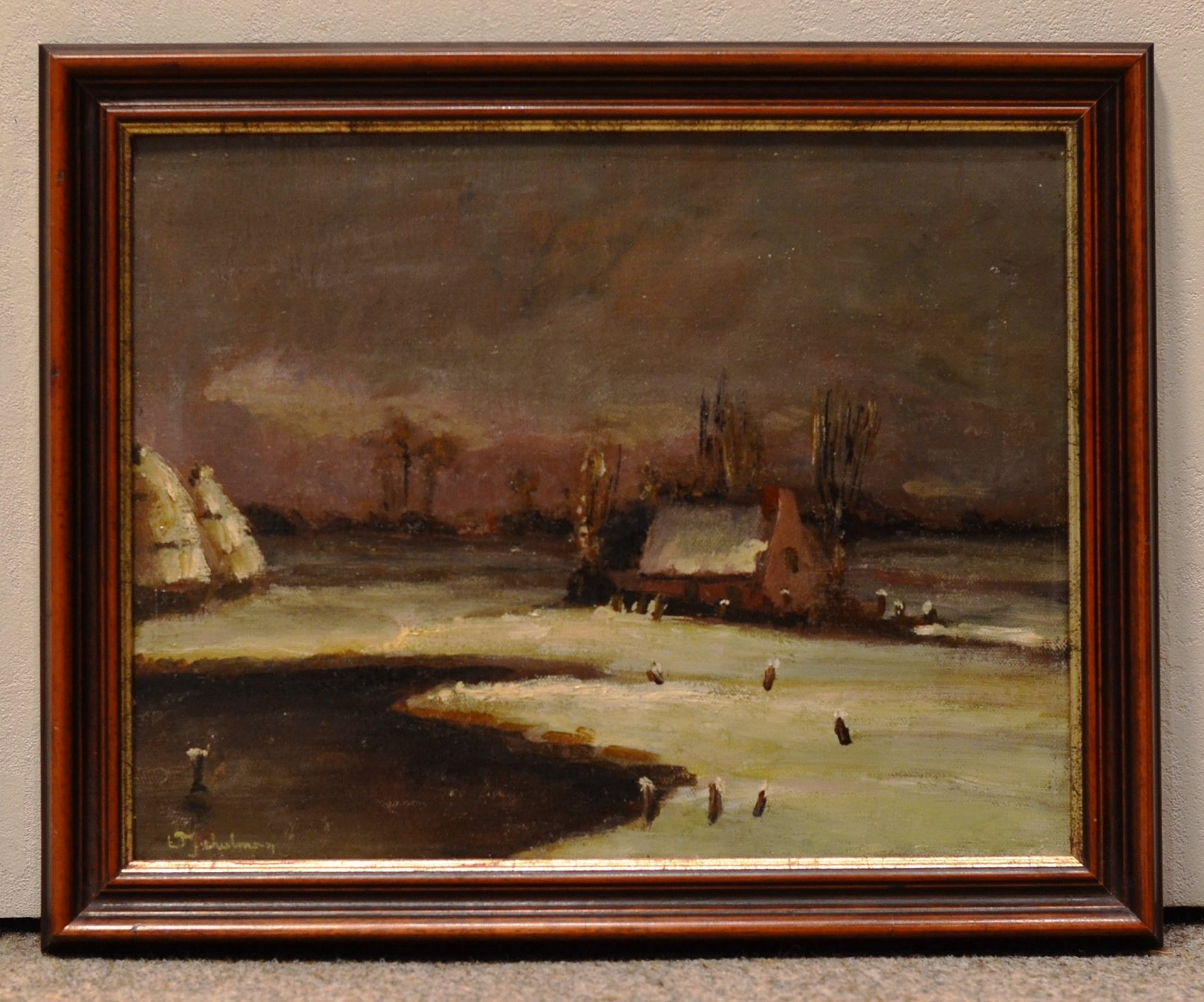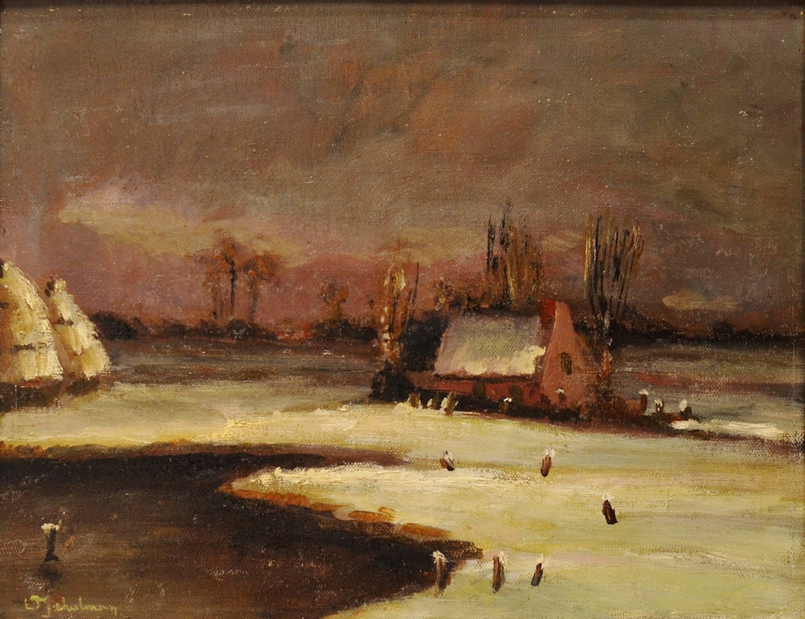 Een winterlandschap met een boerderij en hooischelven, gelegen aan een rivier. De locatie is waarschijnlijk in de omgeving van Hilversum, waar Lion Schulman toentertijd heeft gewoond. Op basis van het spieraam is de datering 4e kwartaal 19e eeuw of 1ste kwartaal 20ste eeuw.