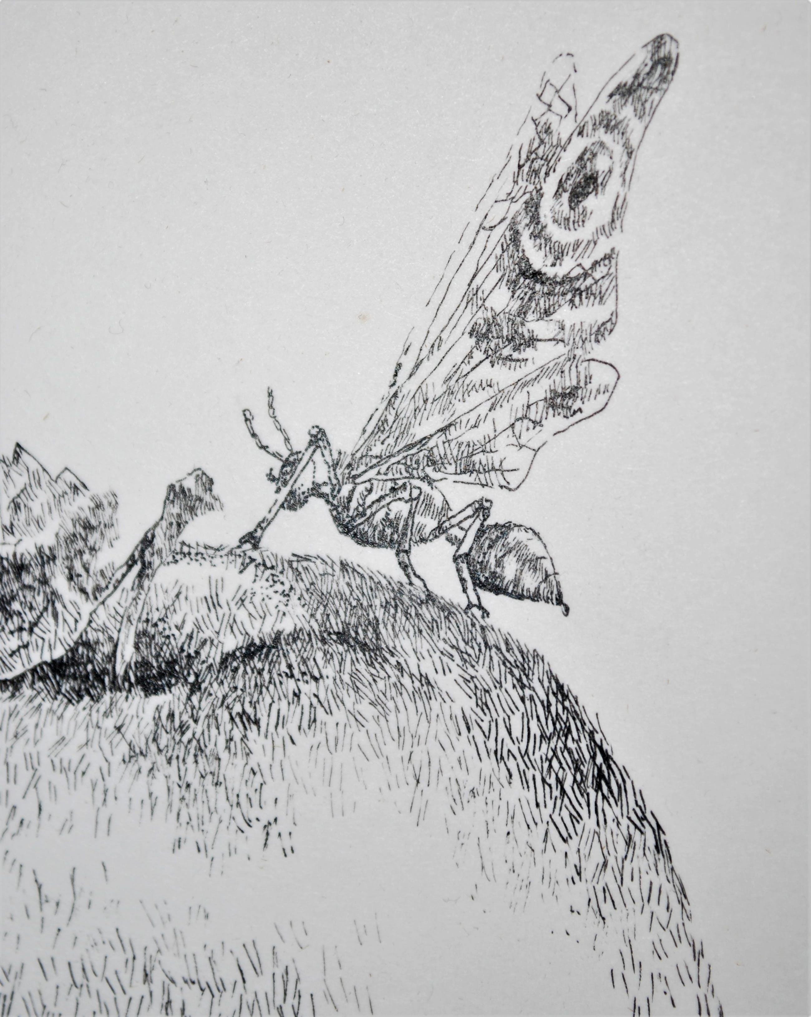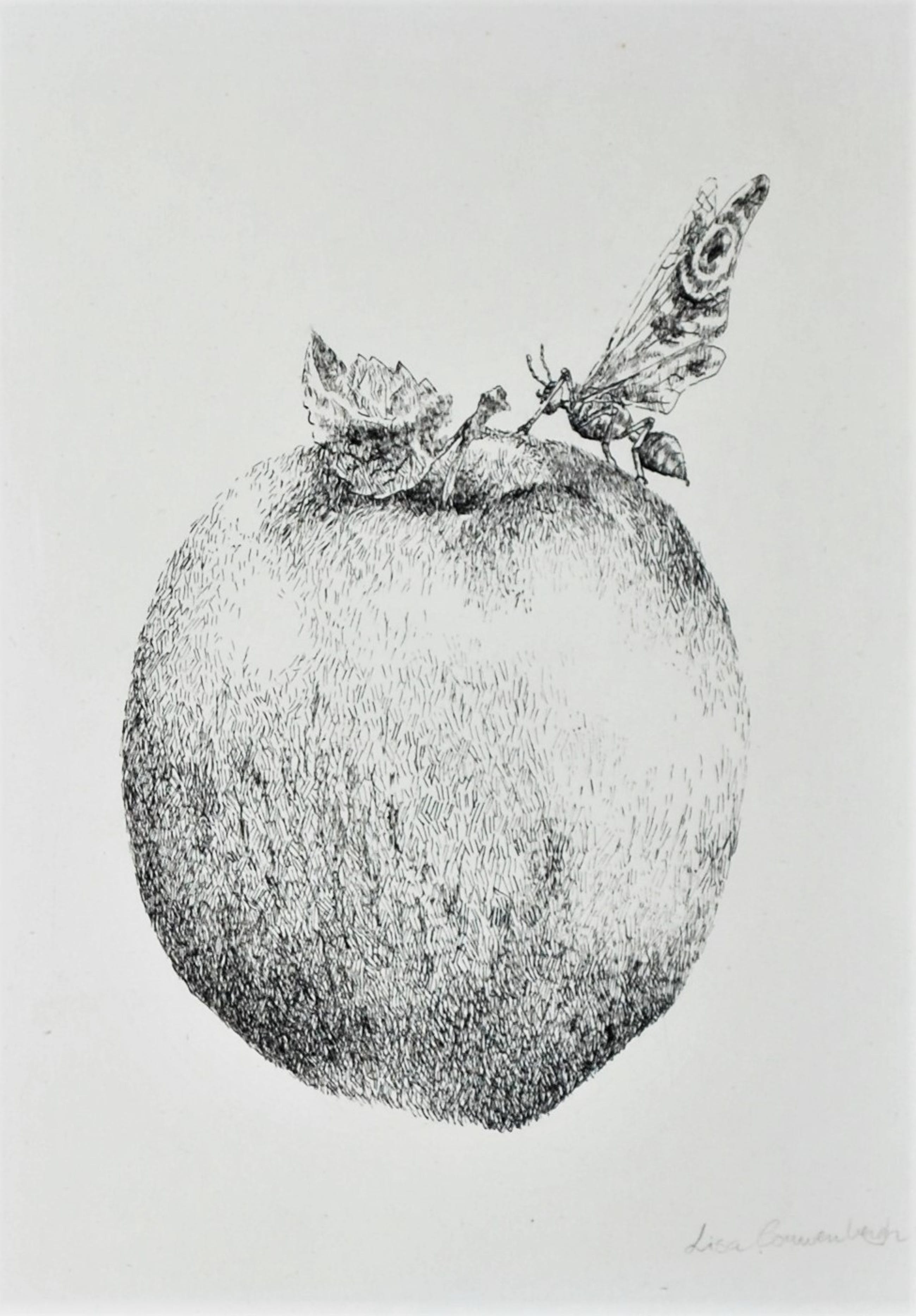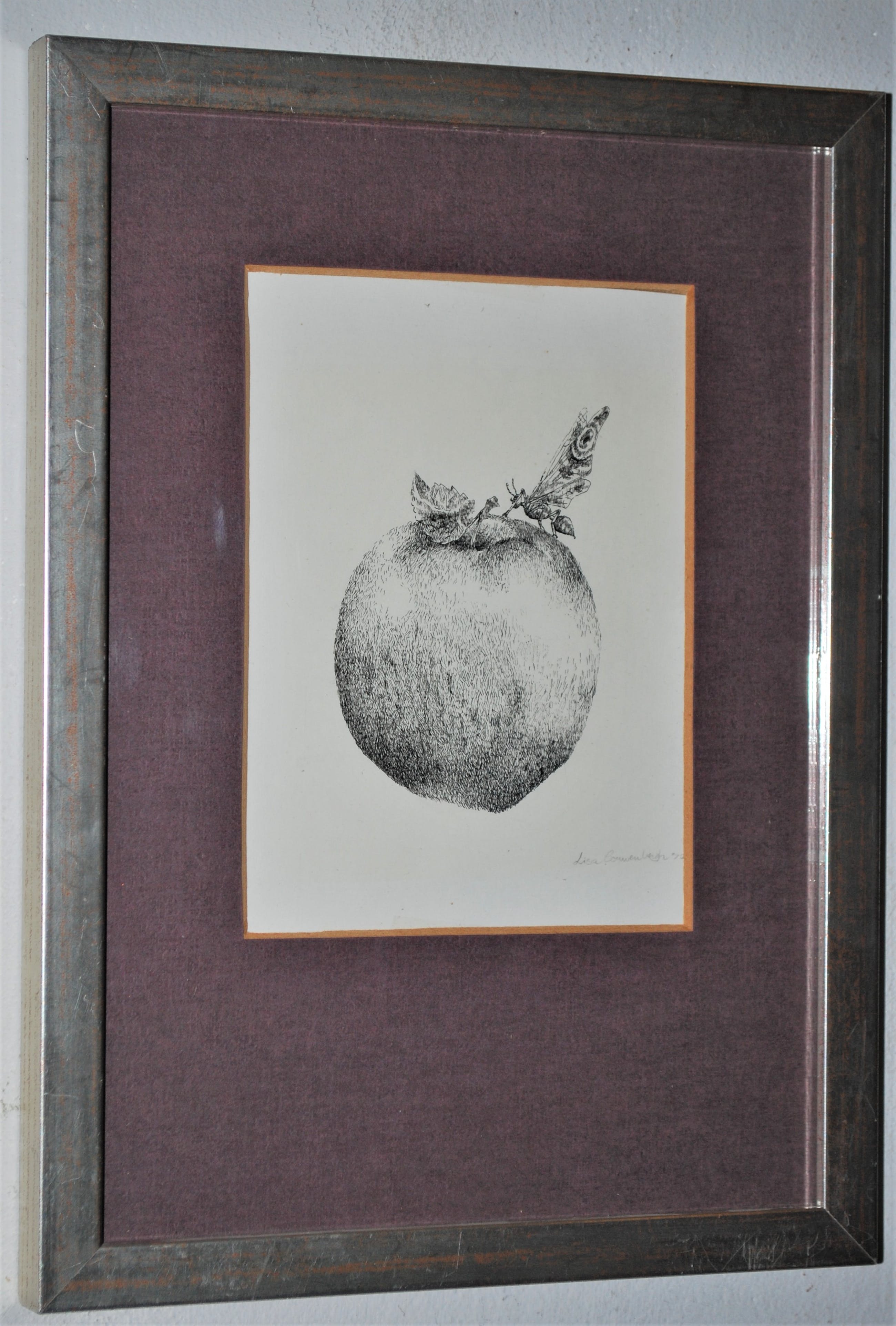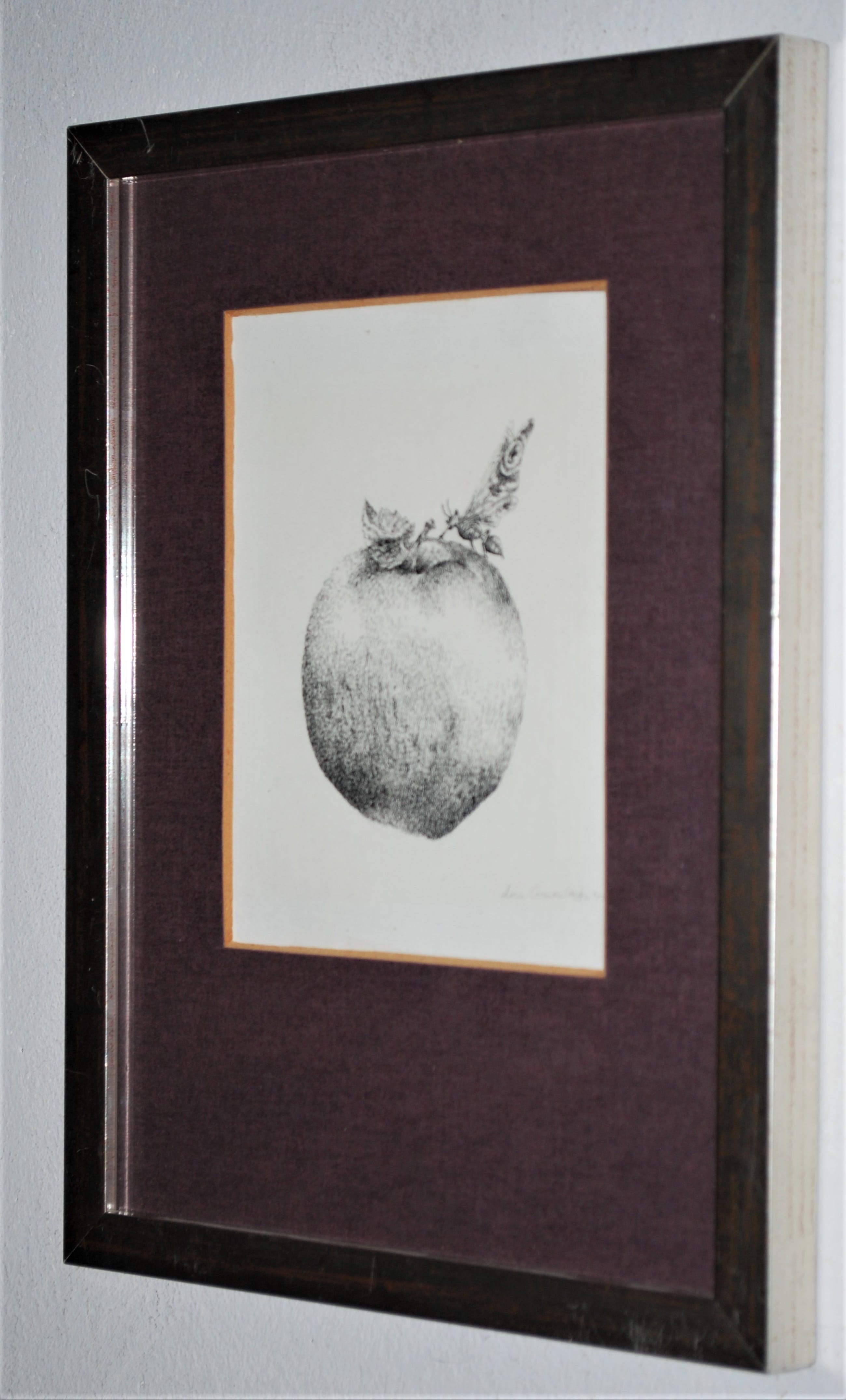 Tekening op dun karton, maat ca. 16x12 cm. Achter passepartout en glas. In een fraaie houten lijst.