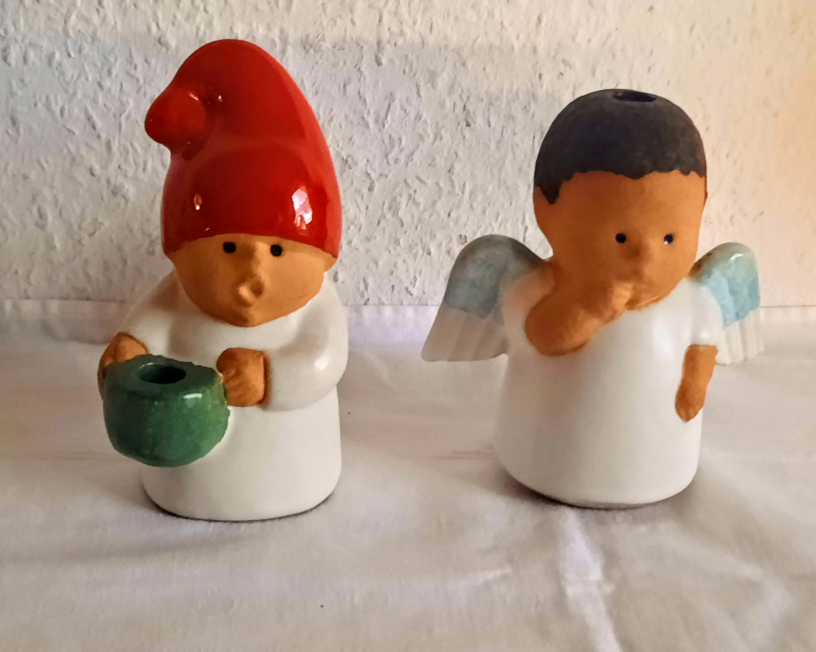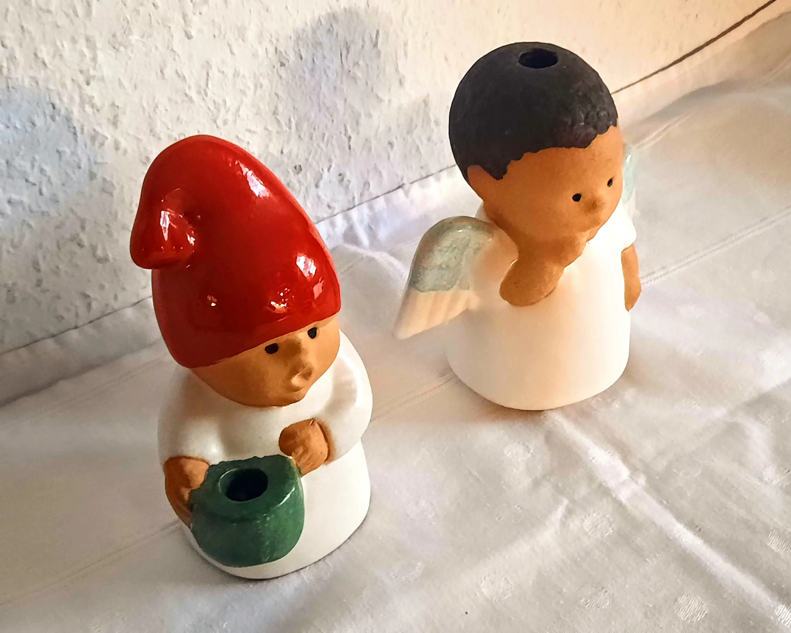 2 zeer fraaie keramische beeldjes als kandelaars, ontworpen door de gerenommeerde Zweedse keramiste Lisa Larson voor de series Angel Children en Advent Children voor Rörstrand.