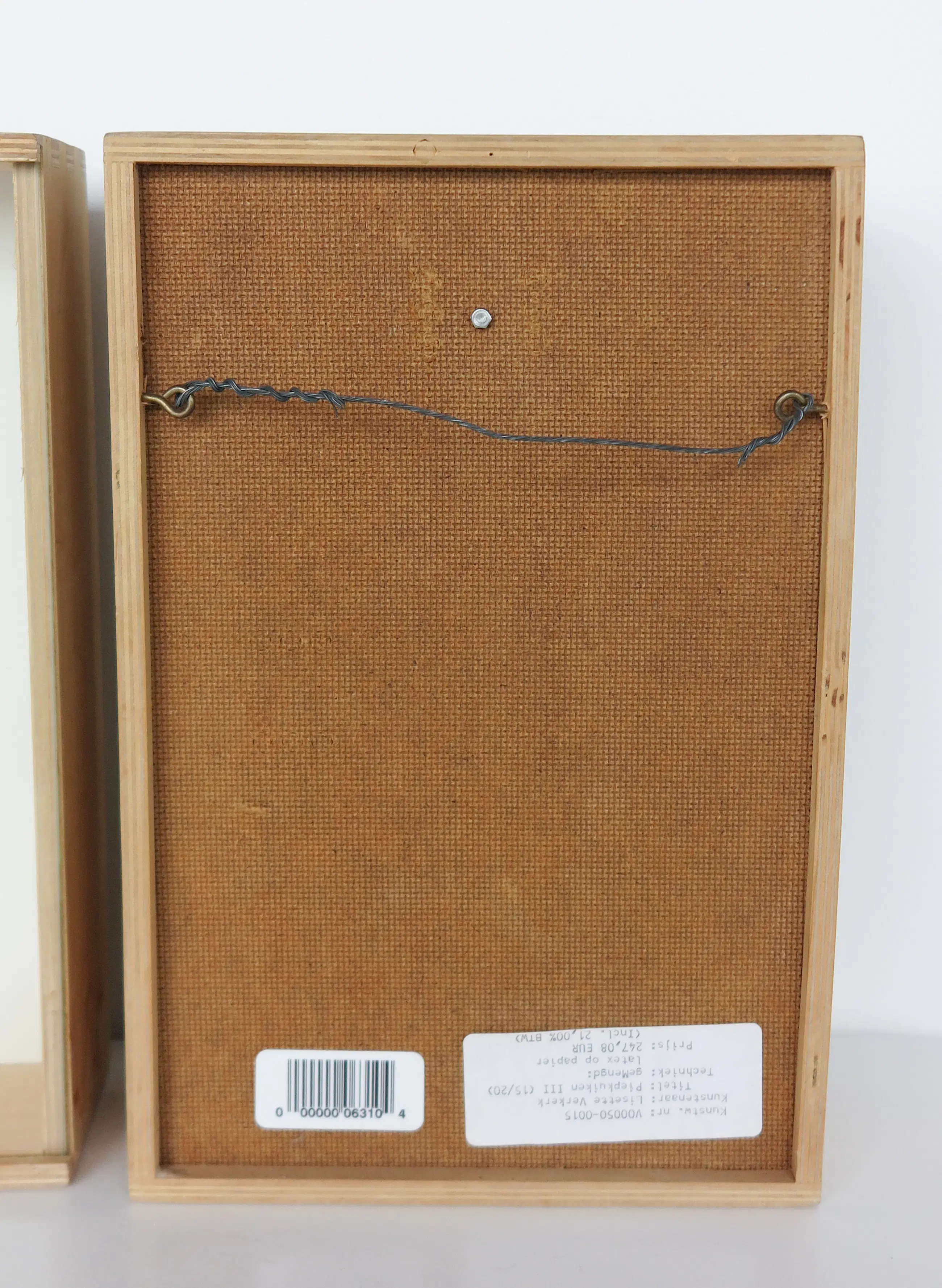 Passe-partout/lijsten: Beschadigingen aan lijsten worden niet beschreven. Indien een werk achter glas is ingelijst en het glas gebroken is, zal dit wel vermeld worden. Passe-partouts worden op geen enkele manier gegarandeerd en ook niet altijd meegezonden.