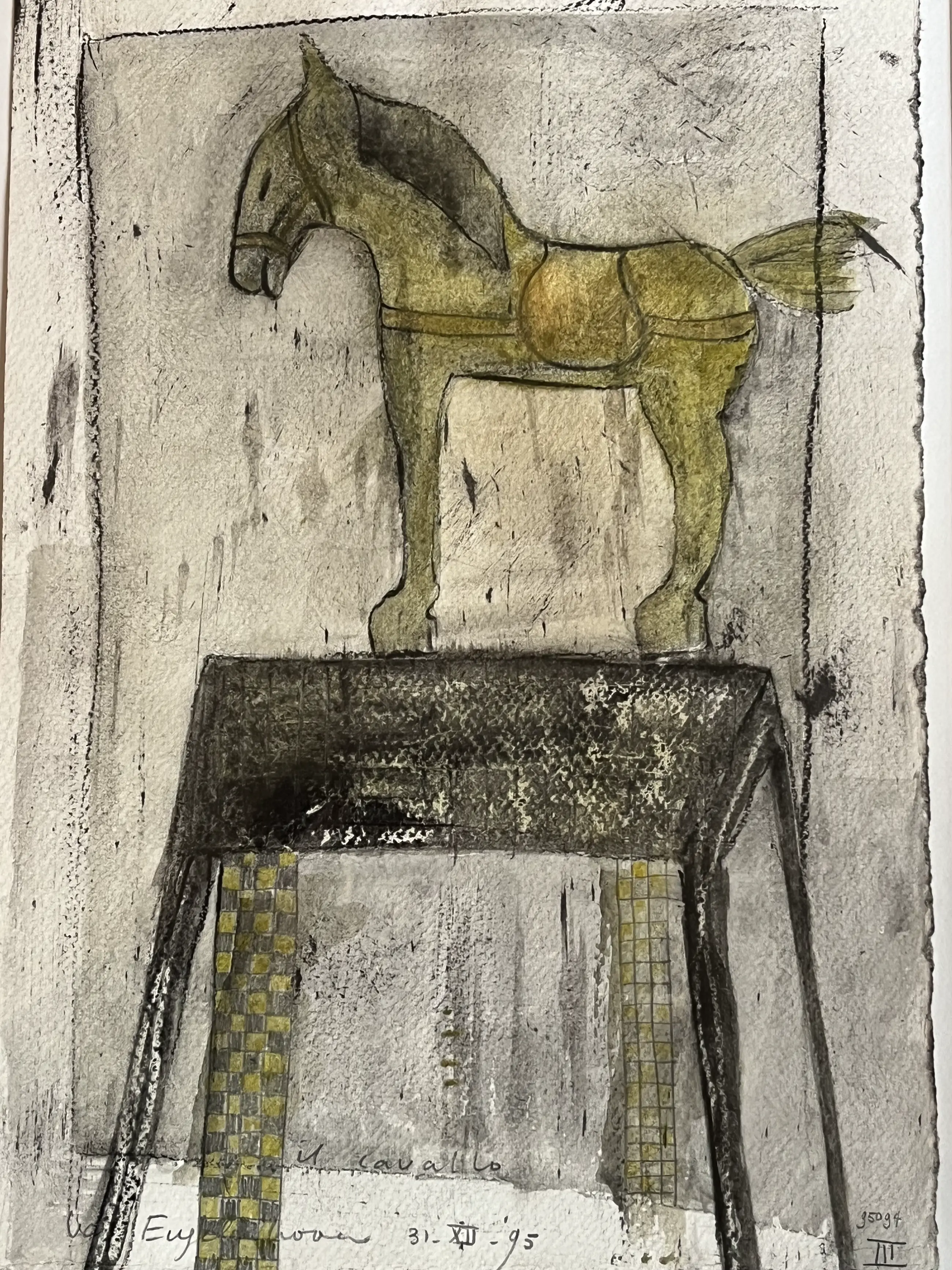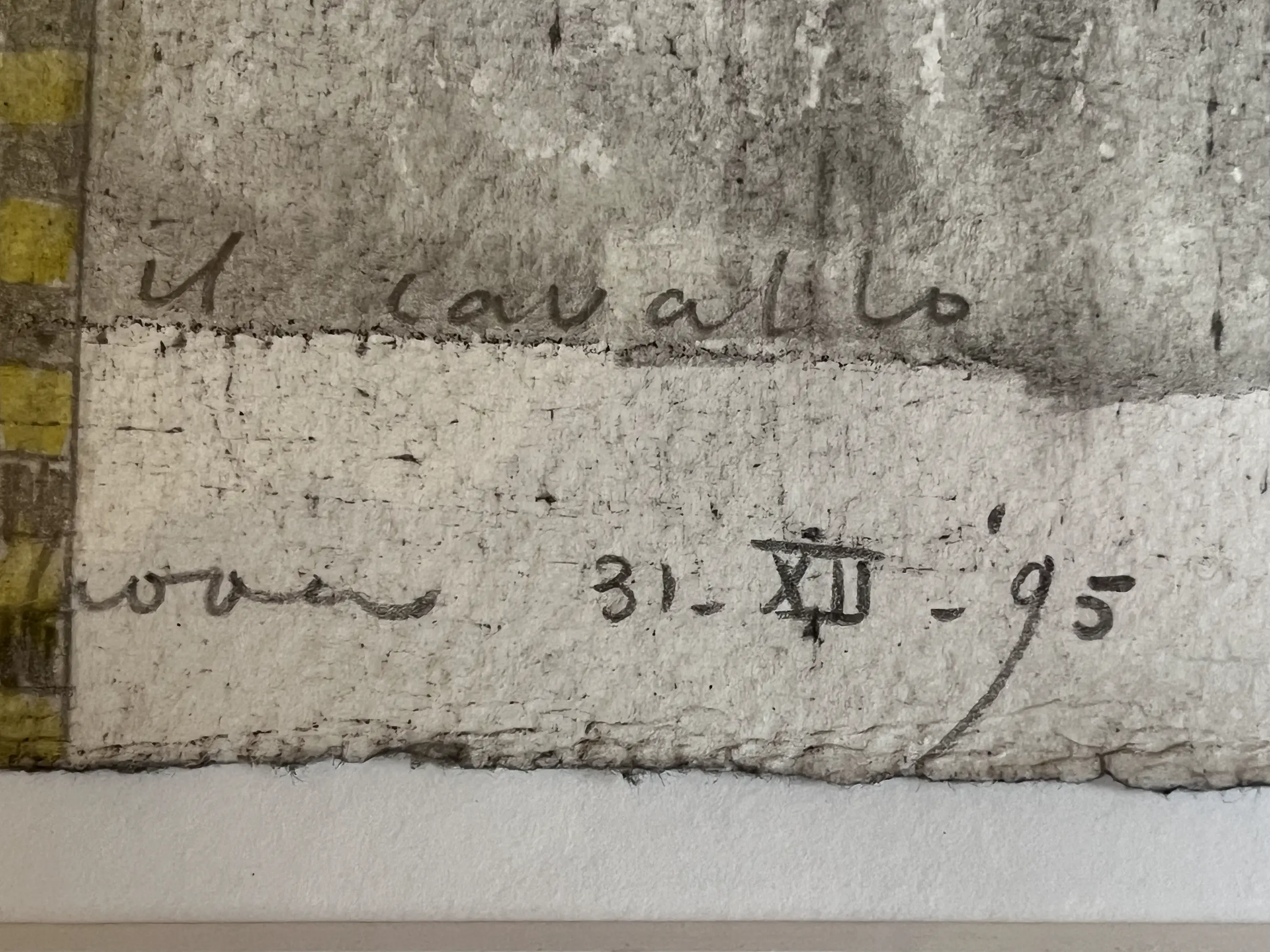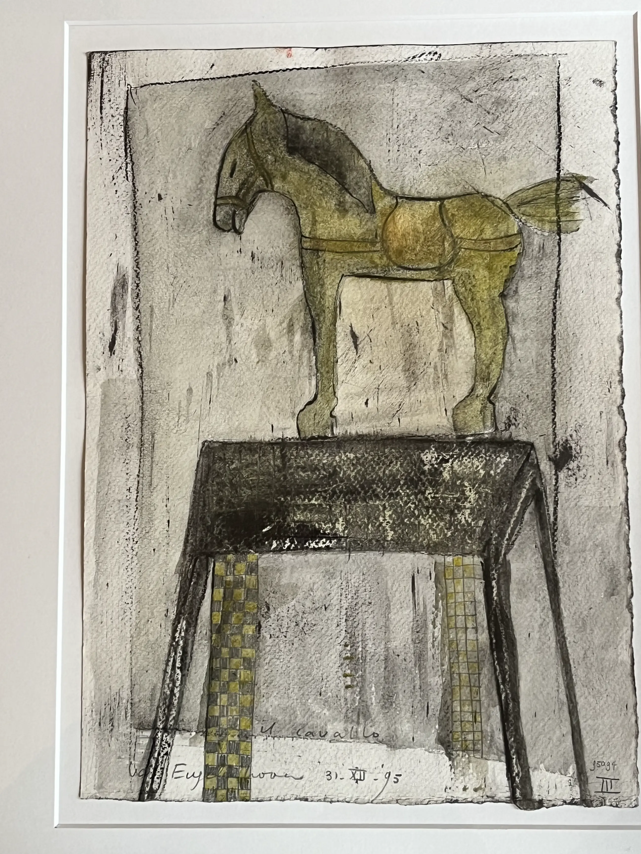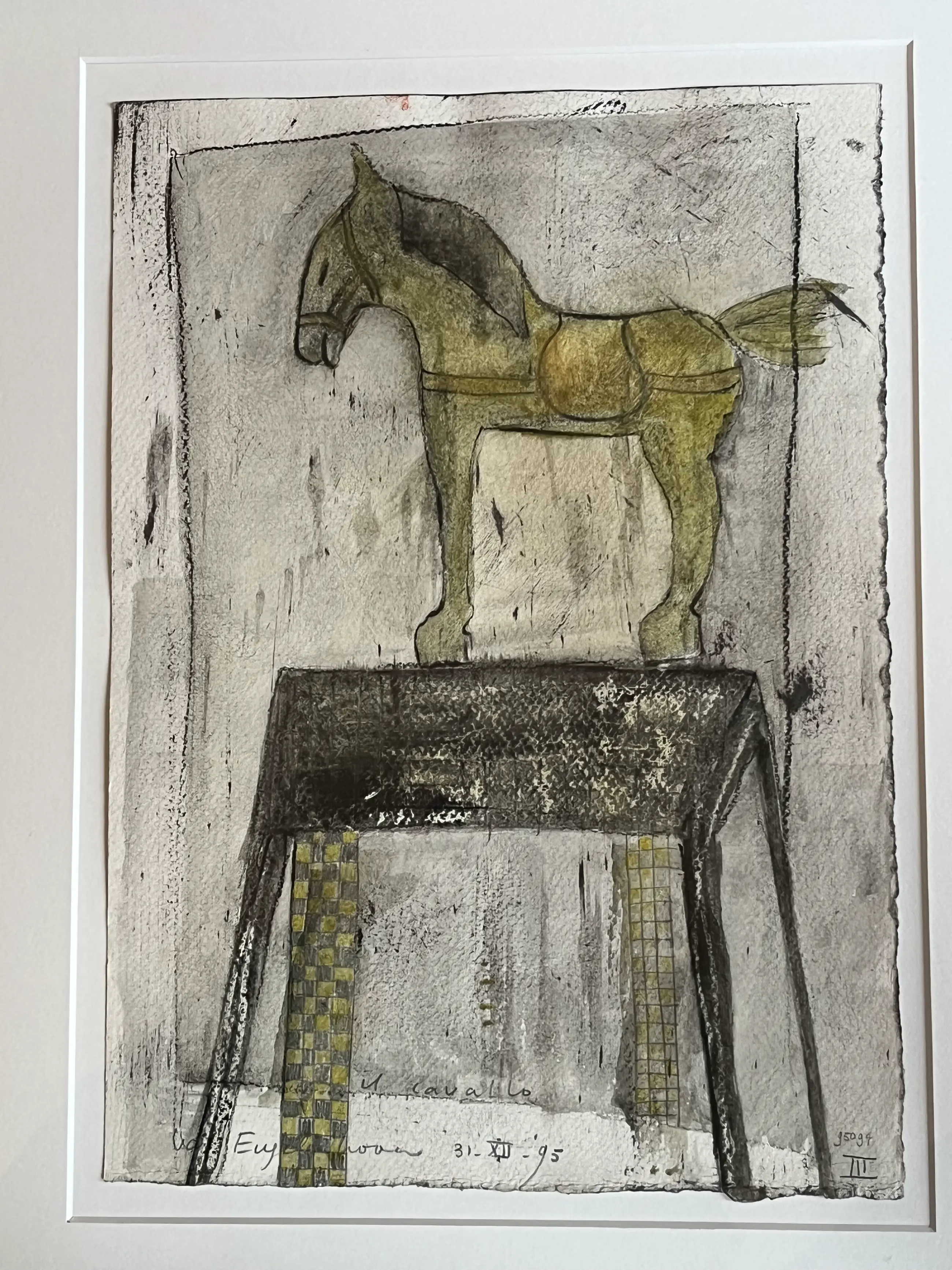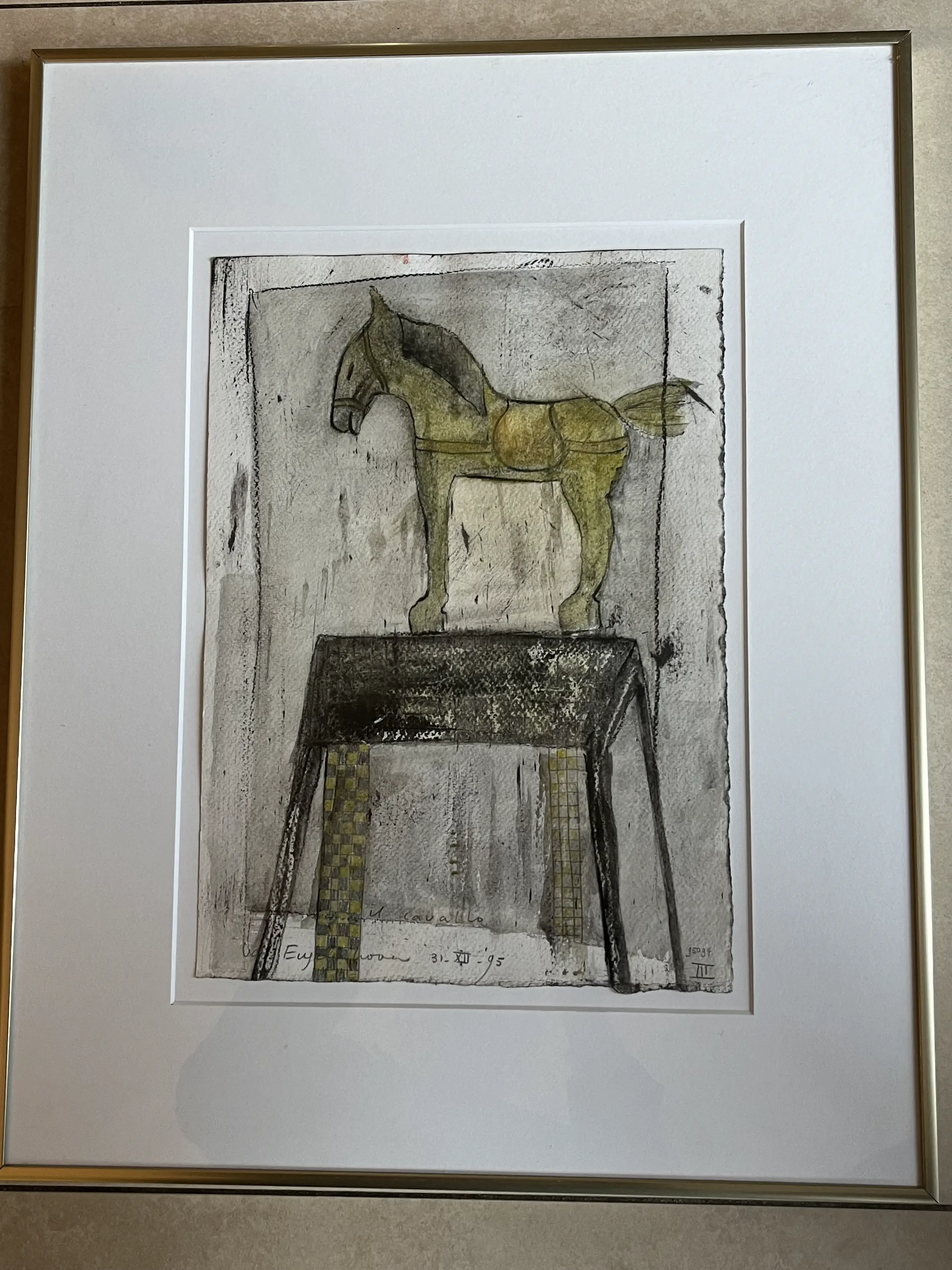 Gemengde techniek waarop een leuk tafereeltje uit 1995. Werk is gelijst in goudkleurige aluminium wissellijst. Afmeting inclusief lijst is 55 x 43,5 cm.