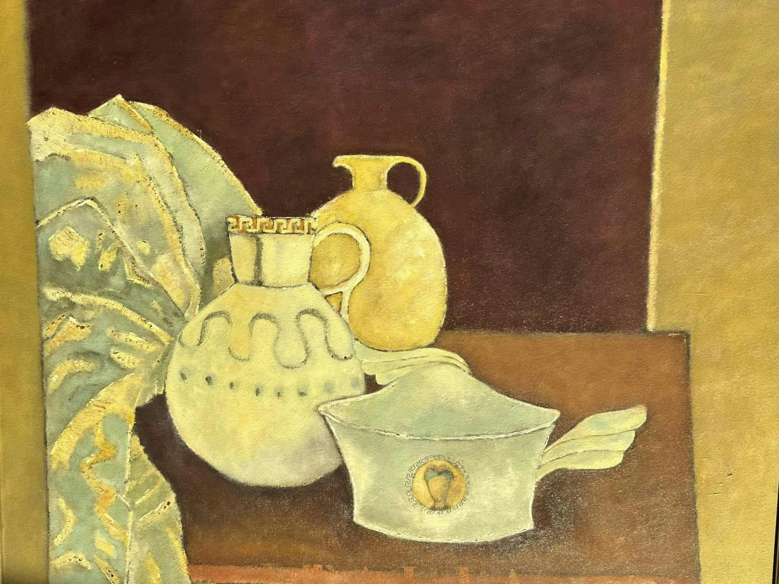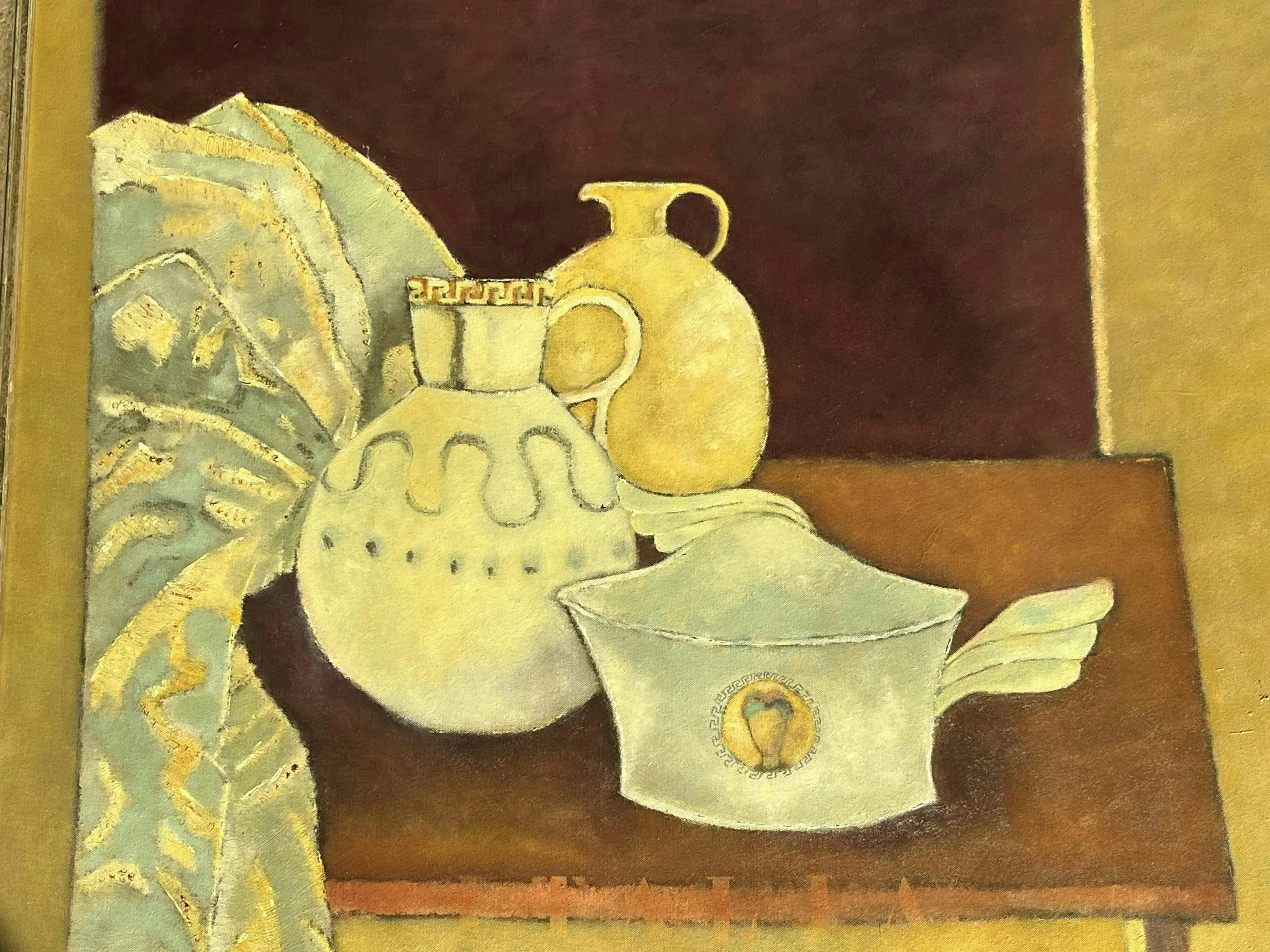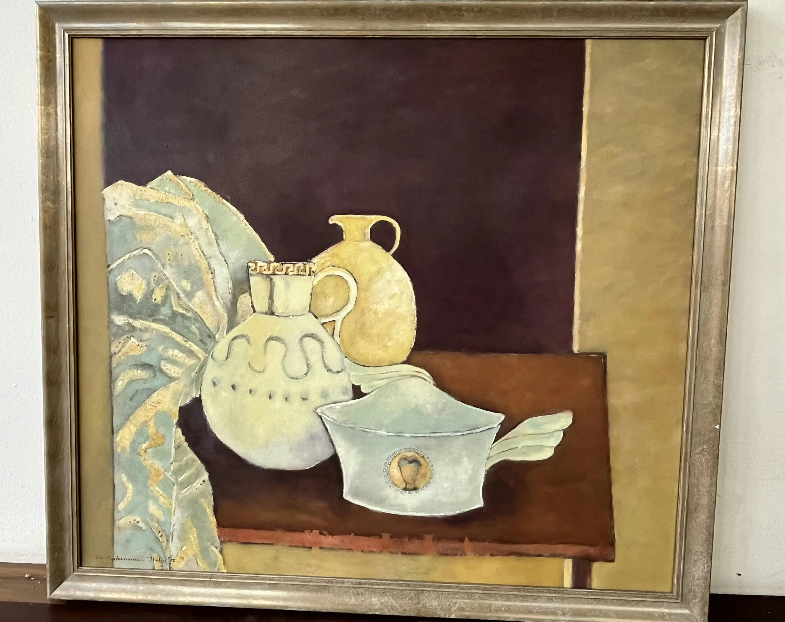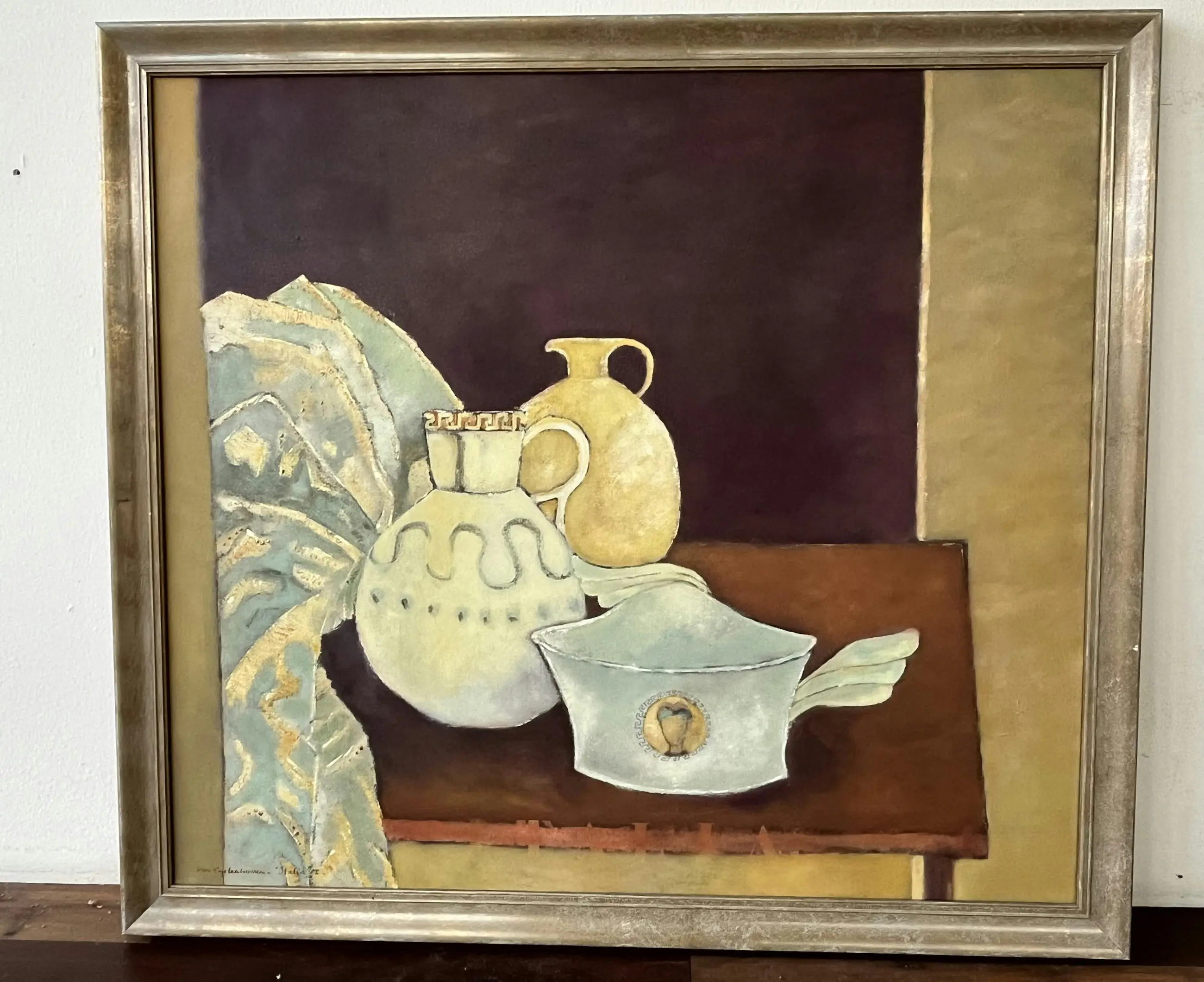 Fraai stilleven met als titel “ Italia I”. Gelijst in bijpassende lijst. Heeft lichte gebruikssporen. Kan zo aan de muur. Afmeting doek 80 x 90 cm. Inclusief lijst 90 x 100 cm.