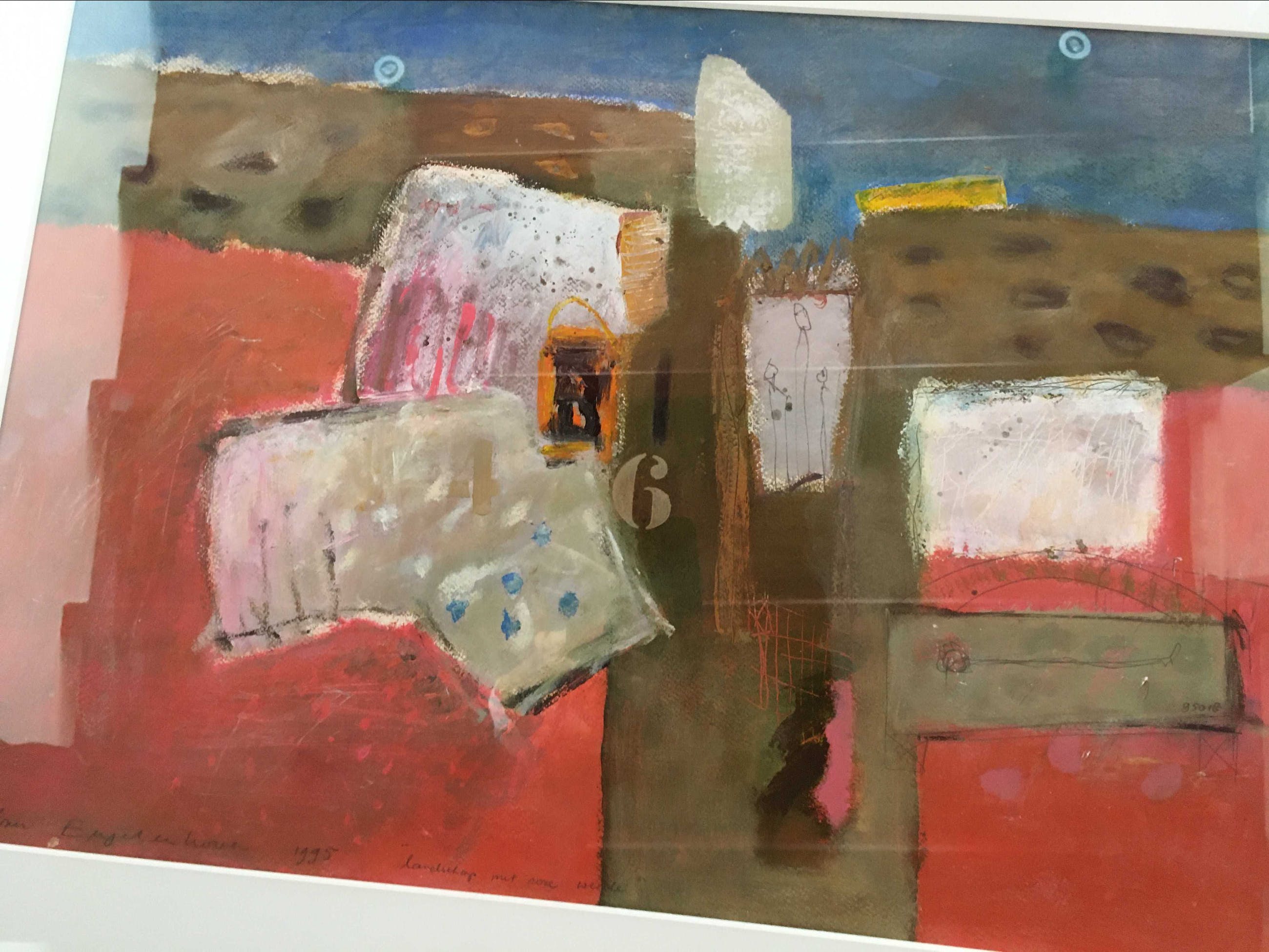Abstract werk in gemengde techniek. Mooi van compositie, in heldere kleuren uitgevoerd. Naturel houten lijst. Afkomstig van voormalige Galerie de Mijt Nederhemert. Bezorging of afhalen in overleg.