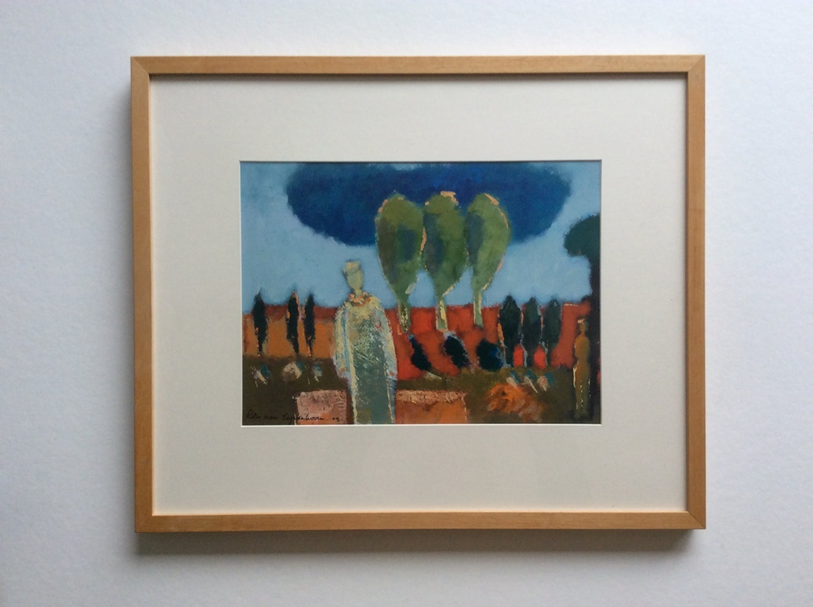 Mooi werk van Lita van Engelenhoven - figuren in landschap - acryl op stevig papier, in houten lijst. Gesigneerd l.o. 2004. Formaat incl. 47 x 57 cm. Afm. schilderij 27 x 37 cm.