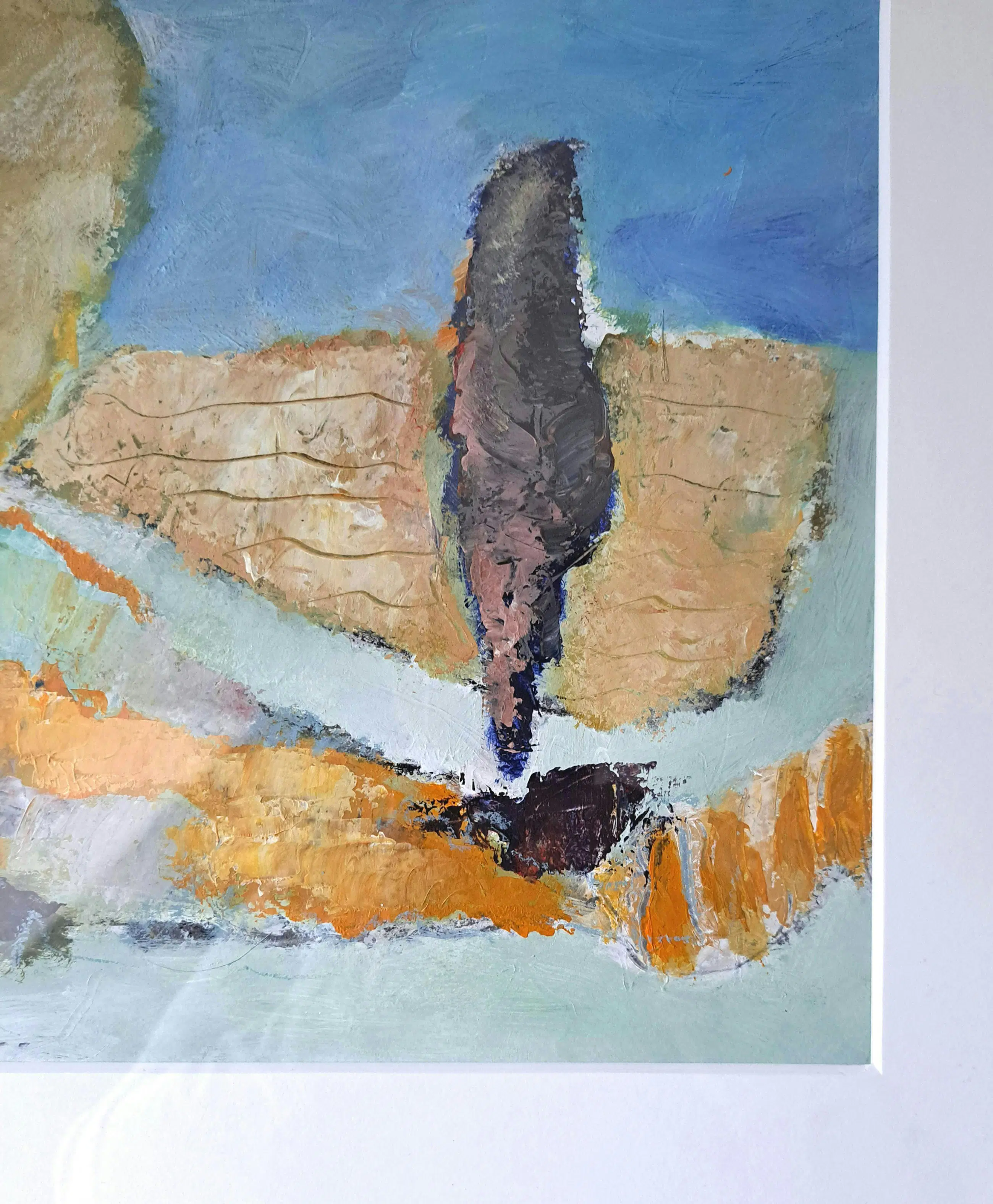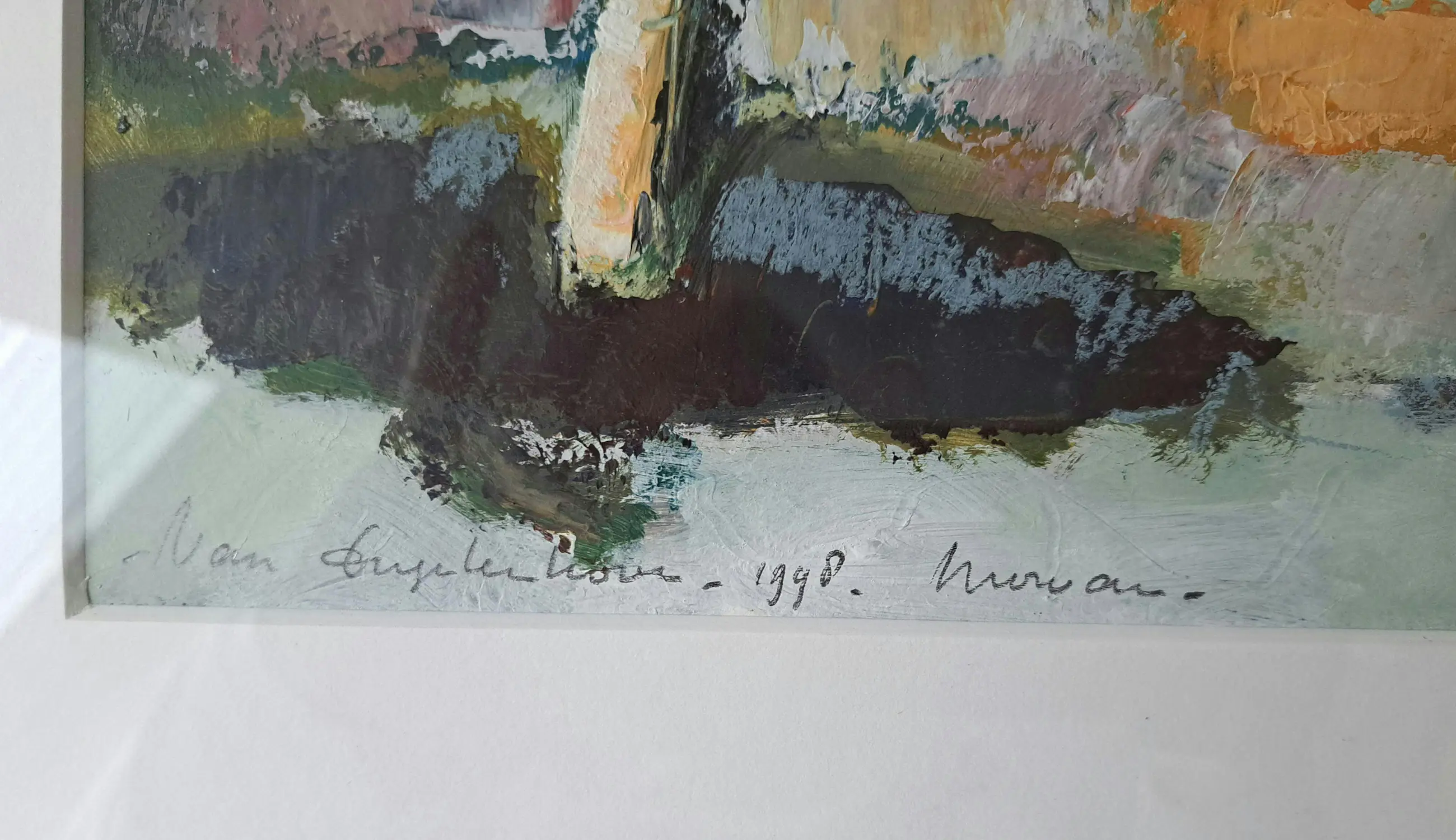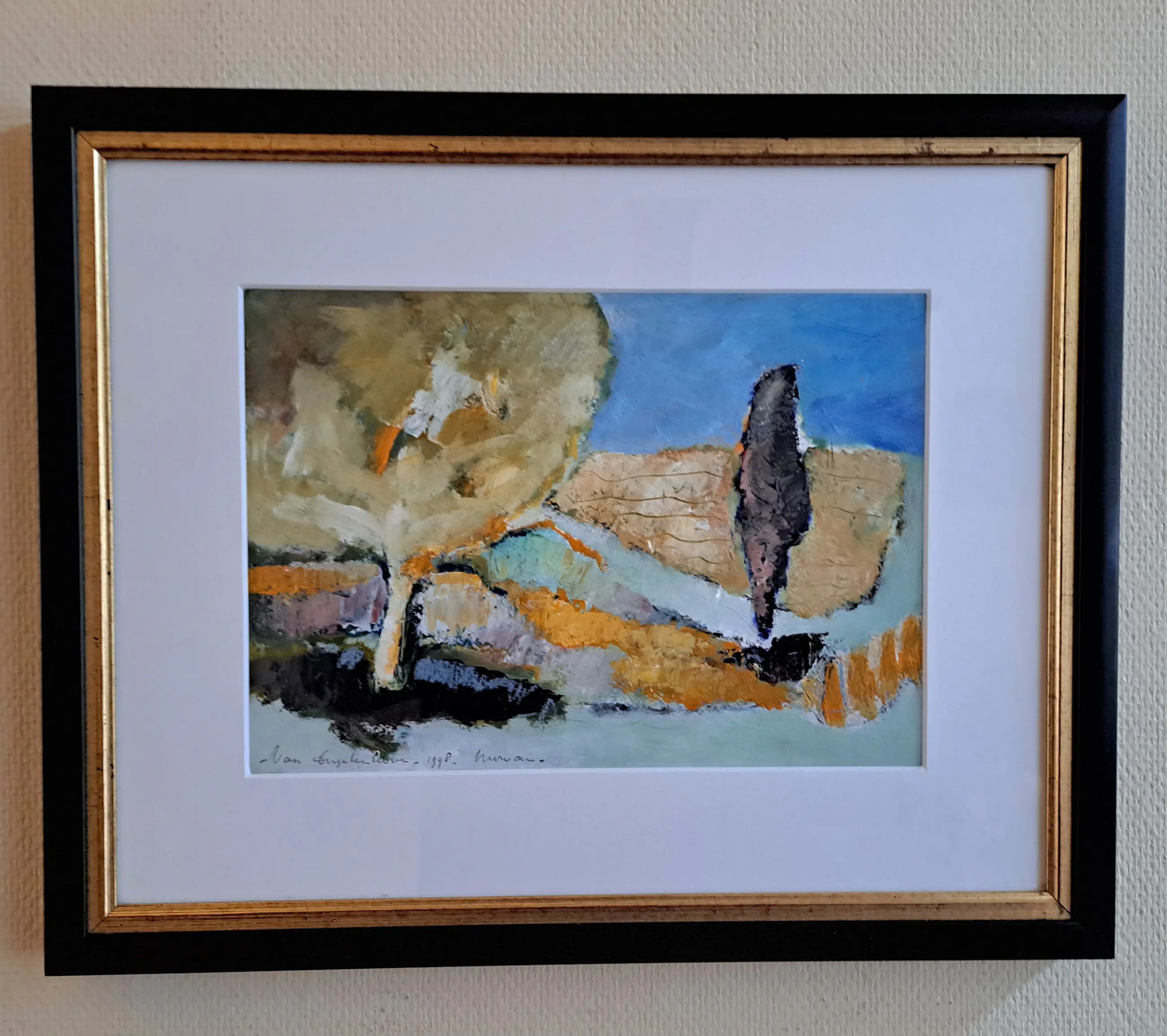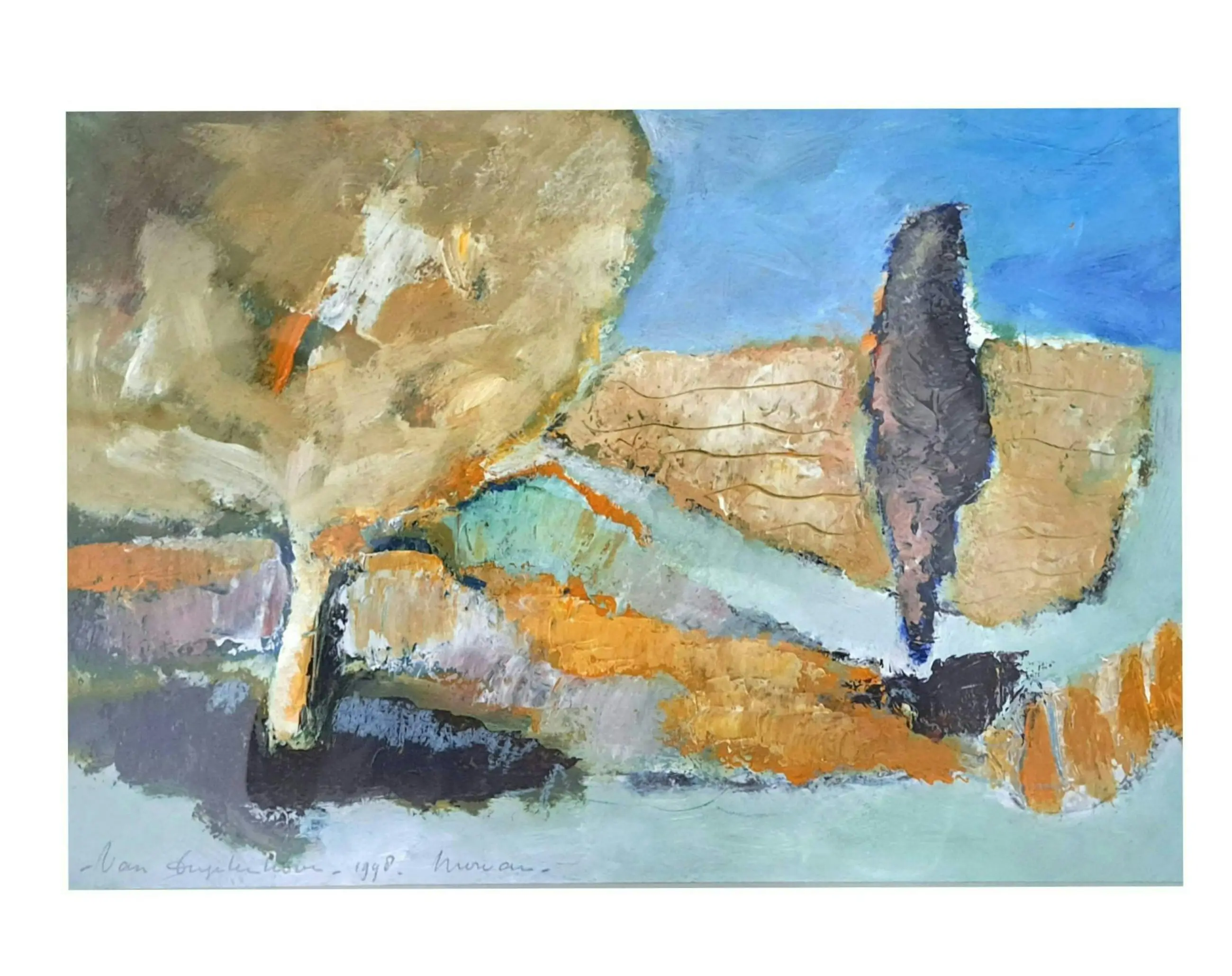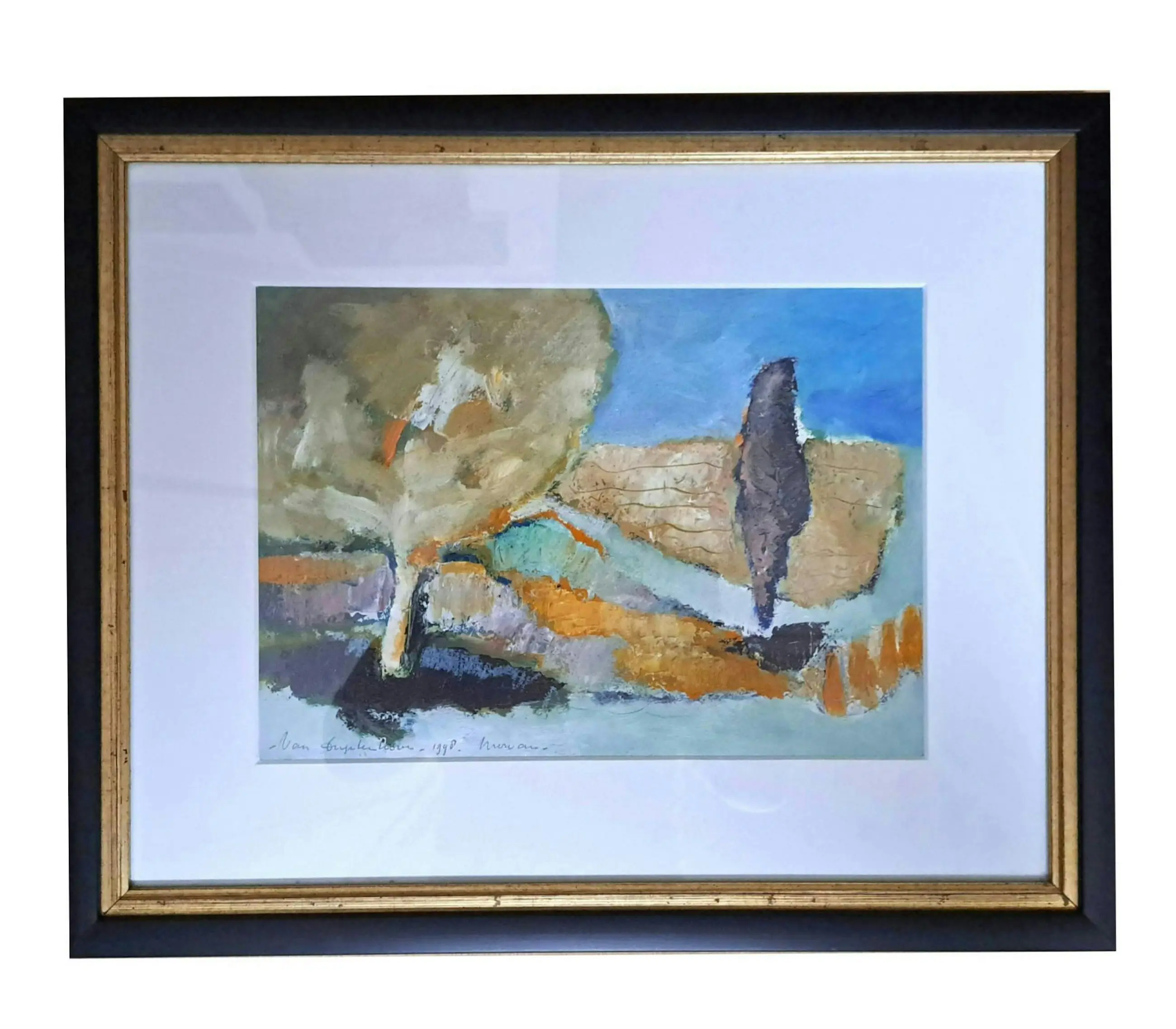 "Morvan", gemengde techniek: acryl, oliepastel op dik papier. Het werk is opgebouwd met paletmes en is monumentaal van opvatting. Het schilderij is een herinnering van de kunstenaar aan haar reizen naar Frankrijk. Geschilderd op locatie in 1998. Het werk is perfect ingelijst in een zuurvrij passe-partout en zwart houten lijst met gouden inlegje.
