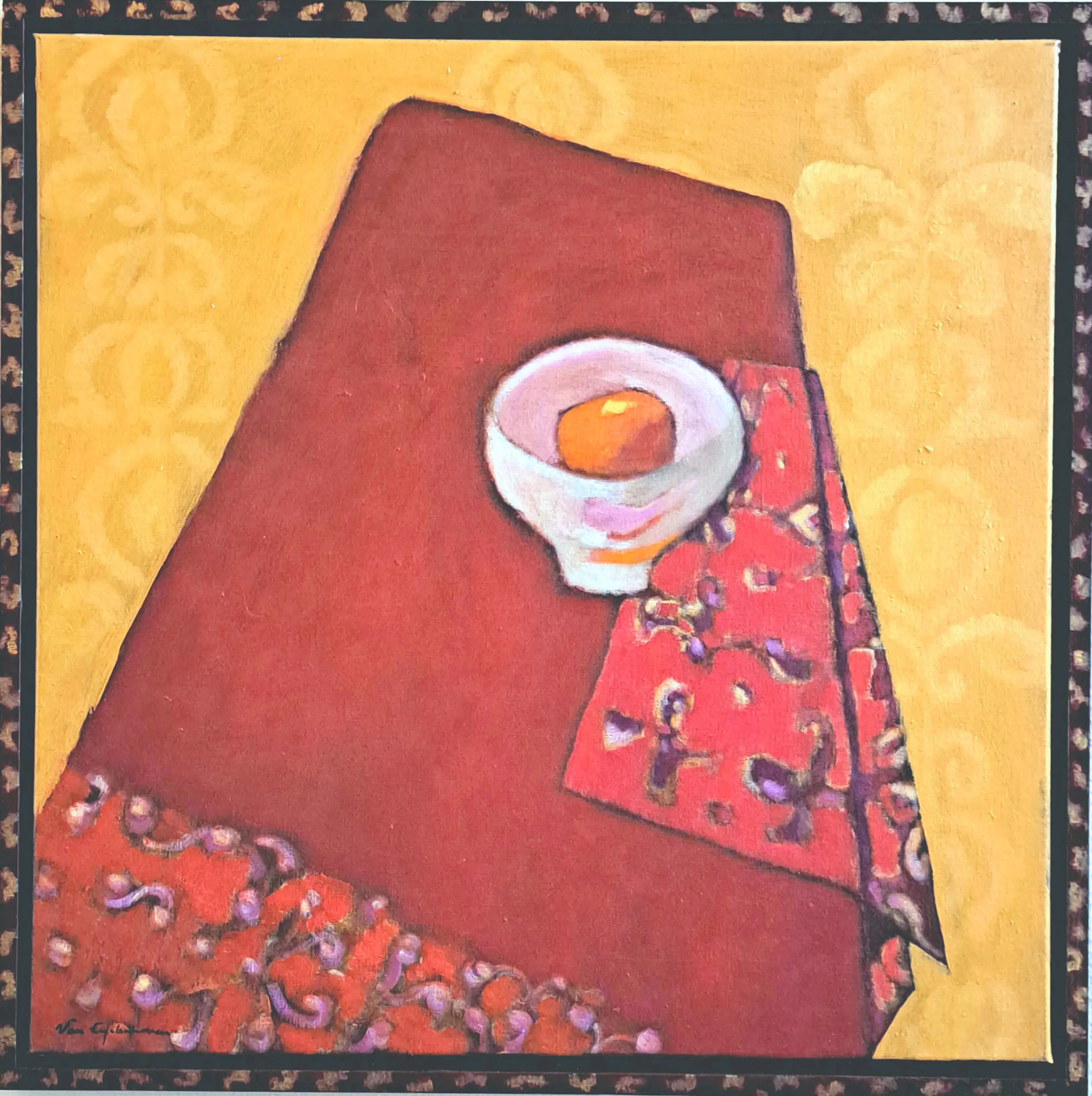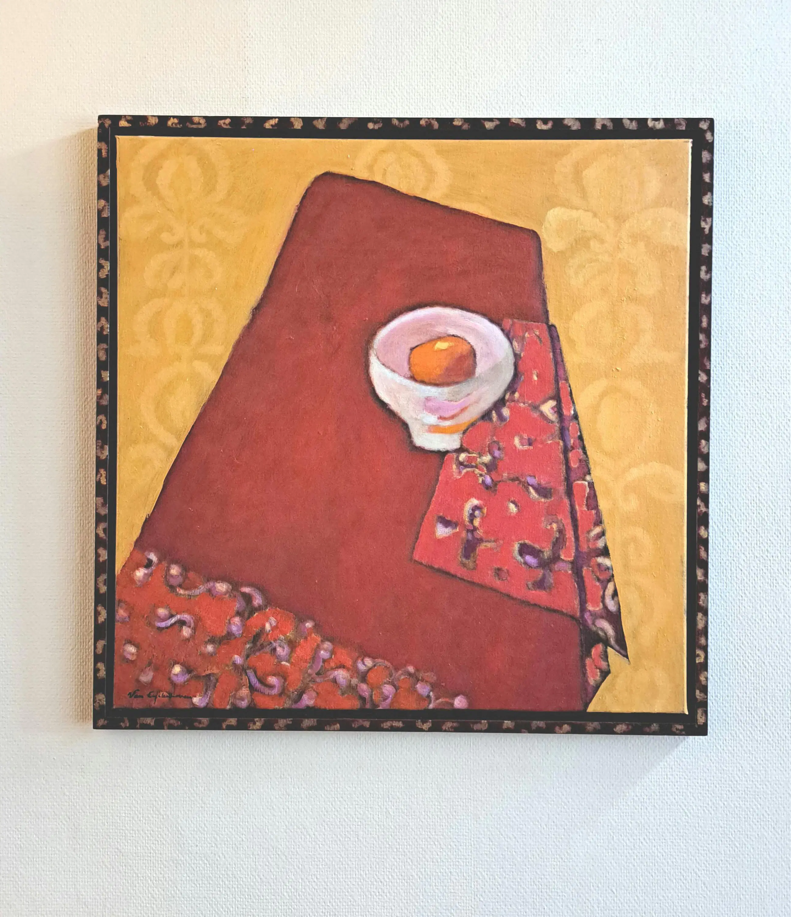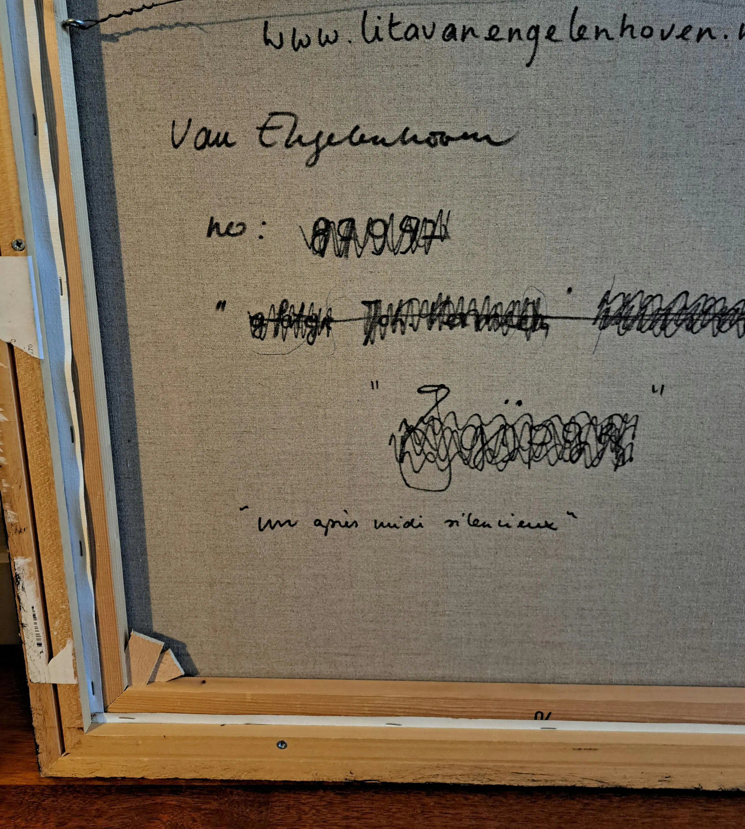 "Un après midi silencieux", kleurrijk schilderij, acryl op canvas. Ingelijst in houten baklijst. Gesigneerd links onder en aan de achterzijde. Schilderij en lijst in perfecte staat.