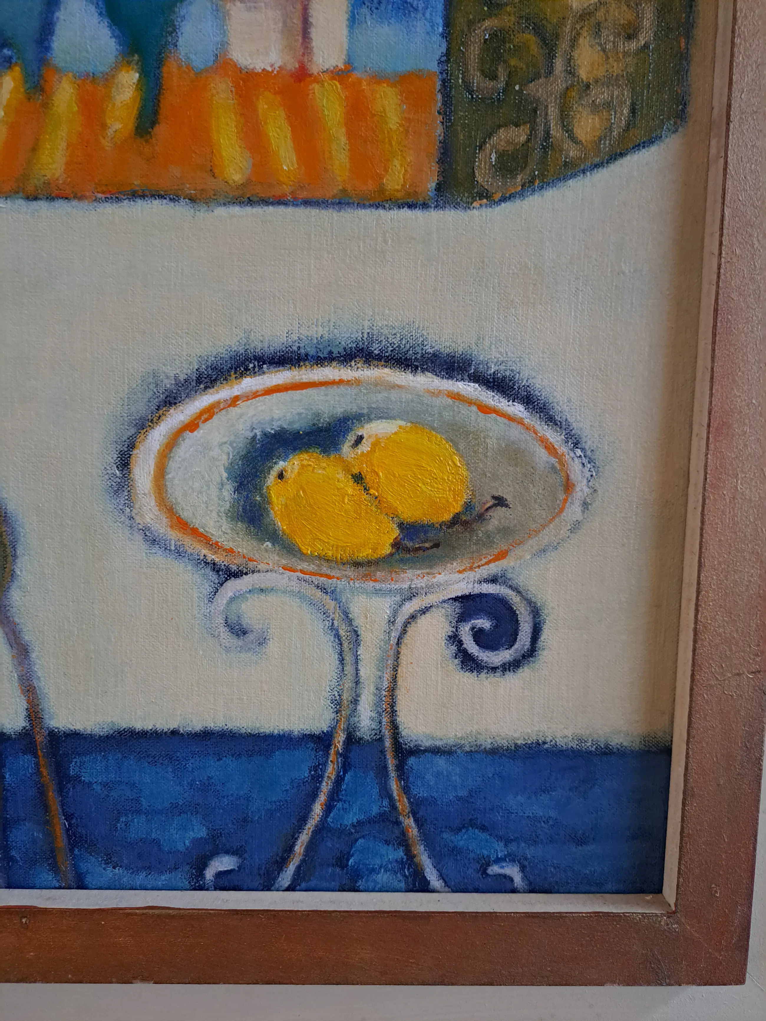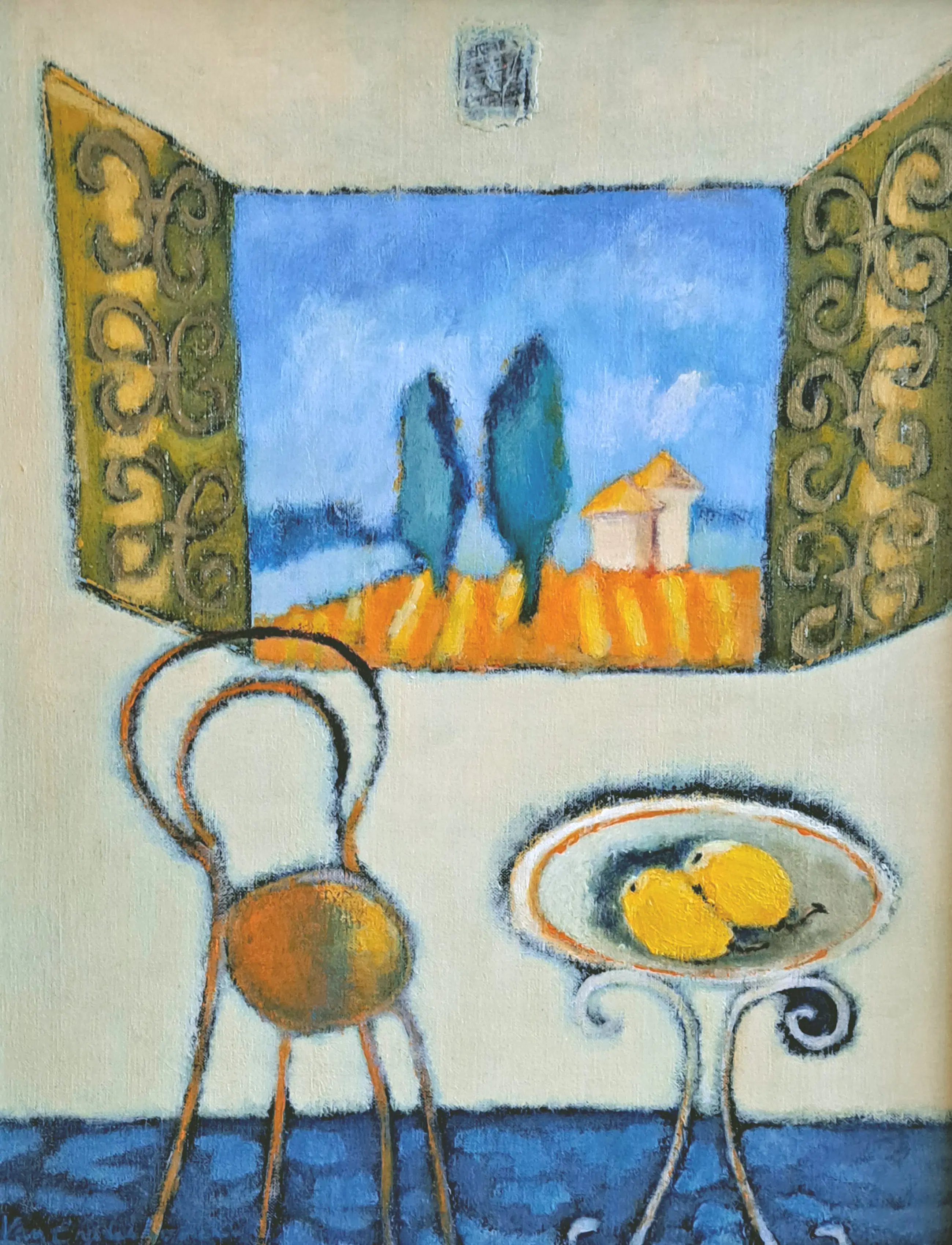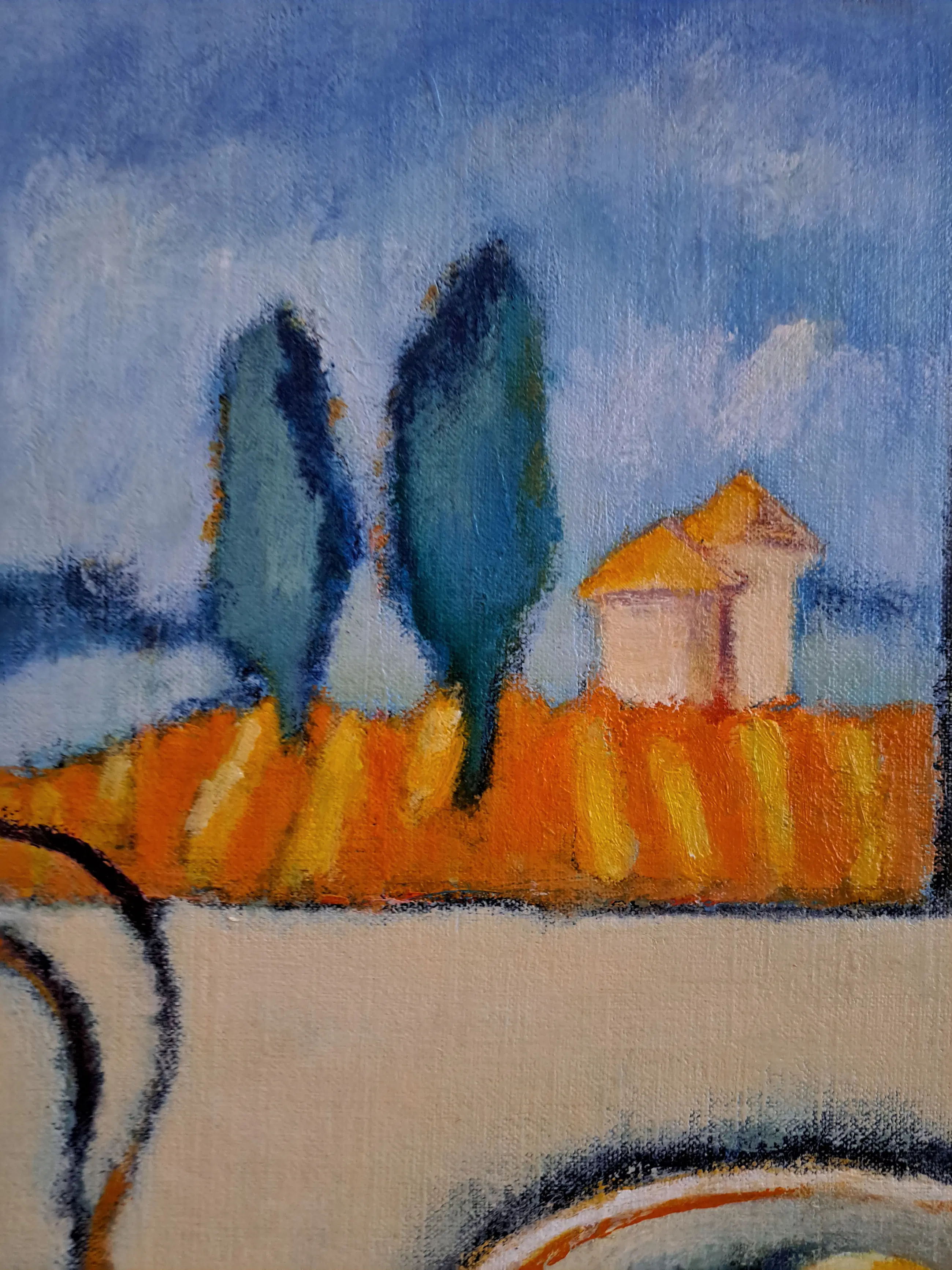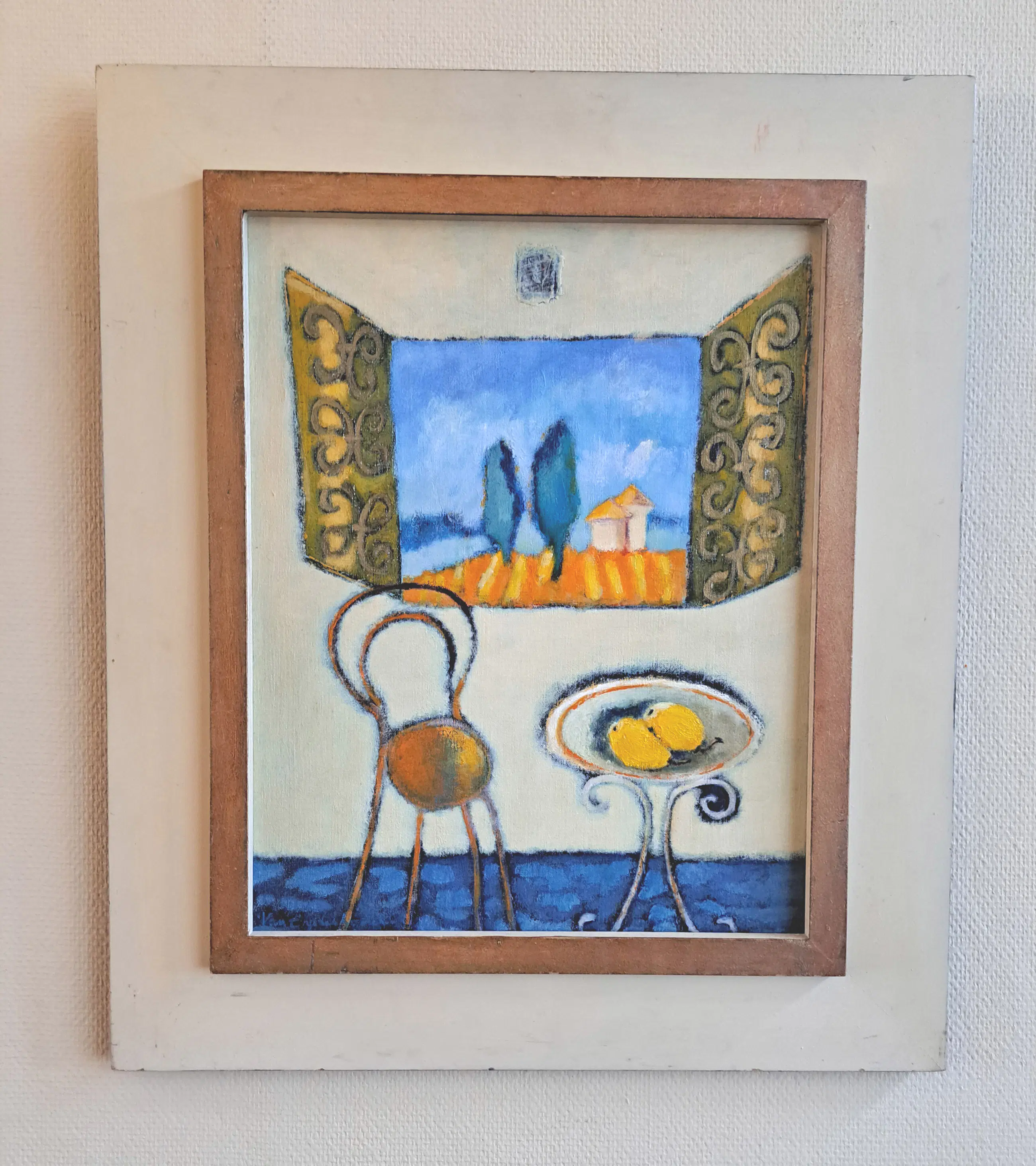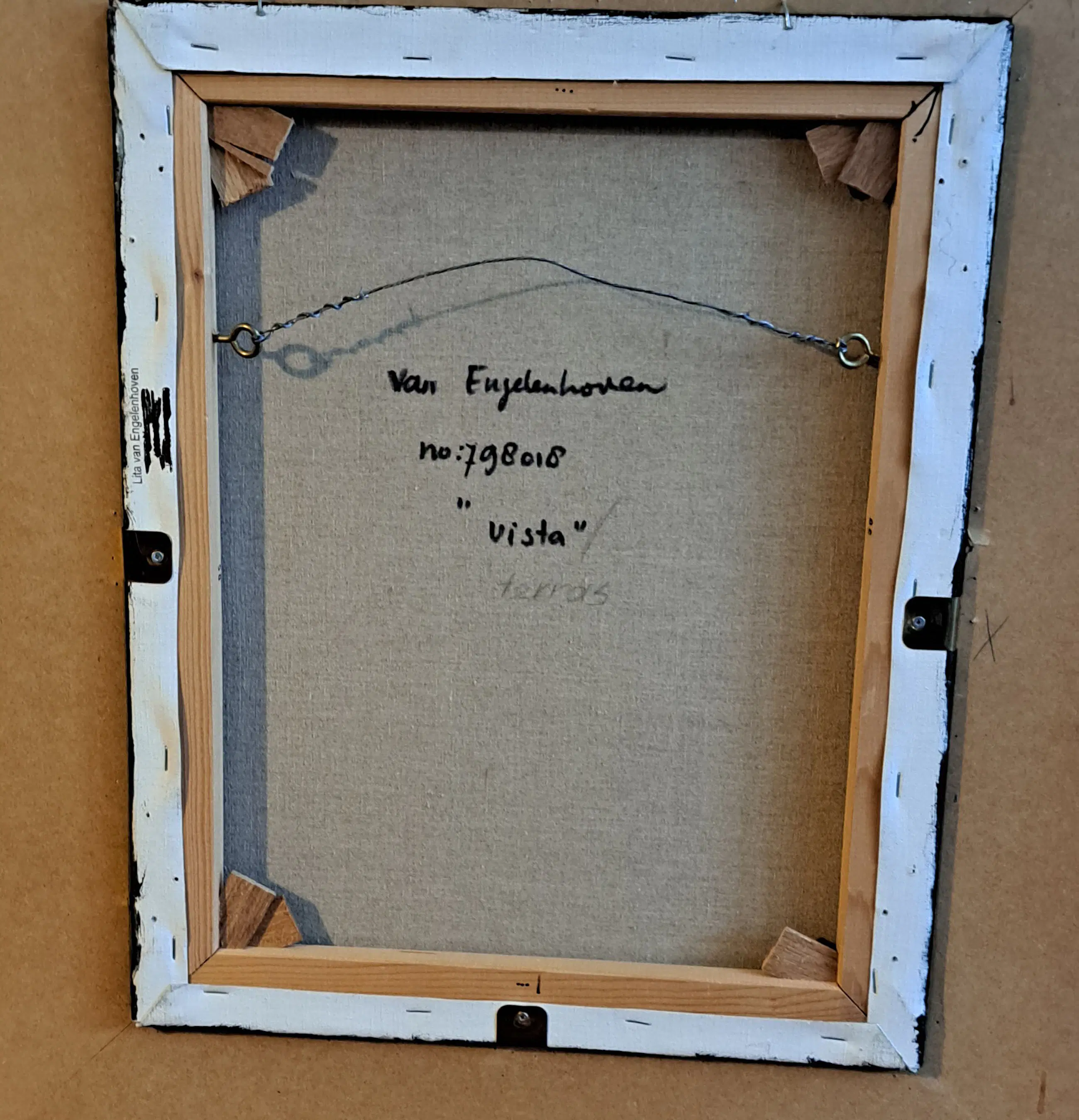 "Vista", acryl - collage - canvas. Terras met doorkijkje op de Italiaanse heuvels. Het schilderij is in goede conditie.