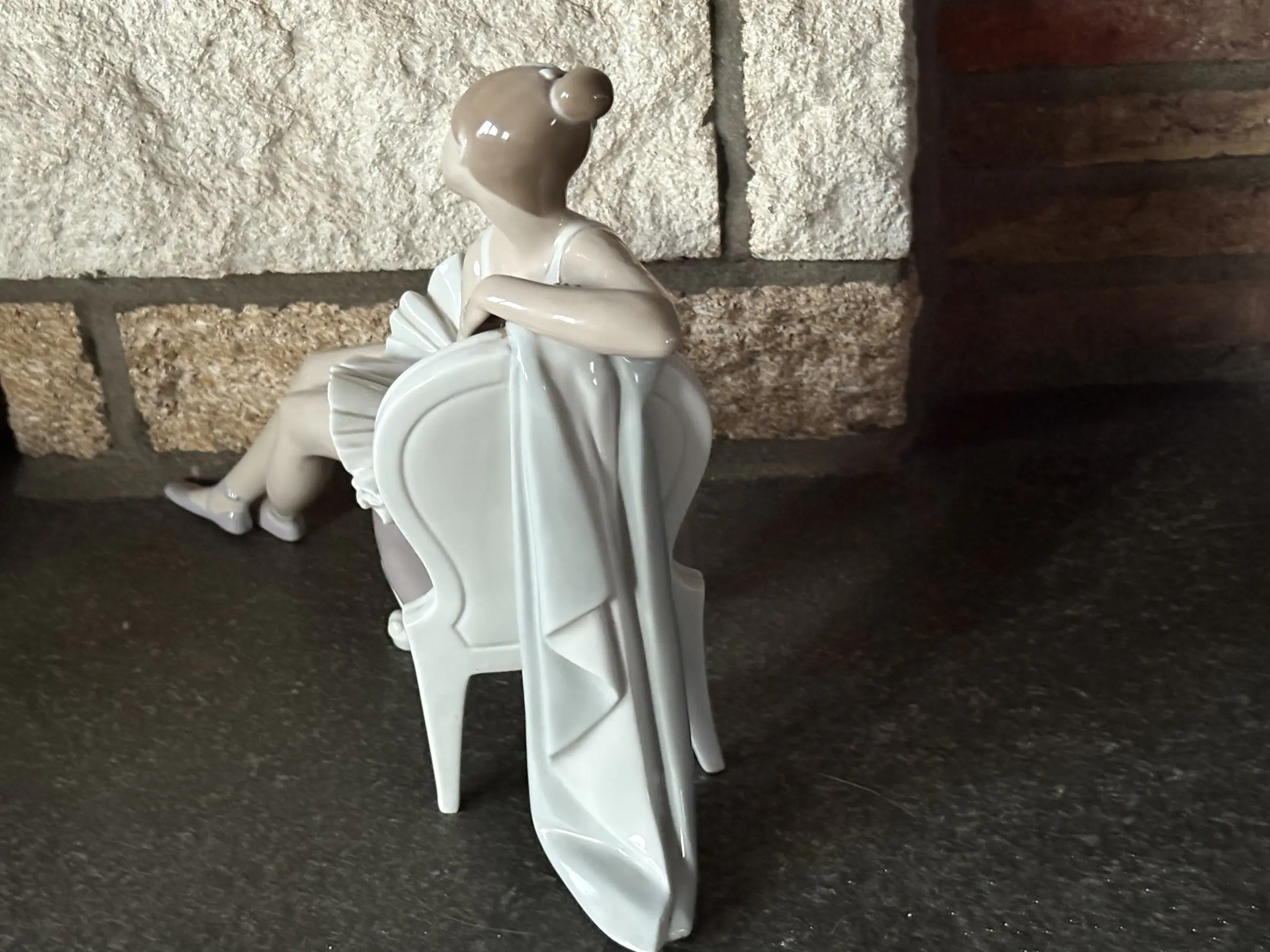 Uitrustende ballerina op stoel. Vlekkeloze staat, blinkt, geen stofje op te zien. Prachtig en heel gedetailleerde handwerk van kunstenaar bewonderen.