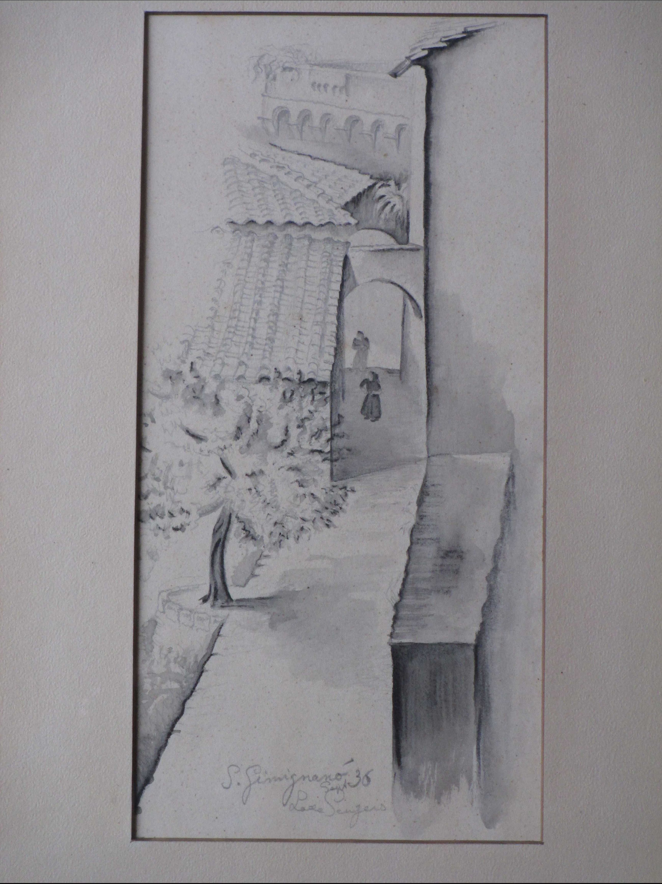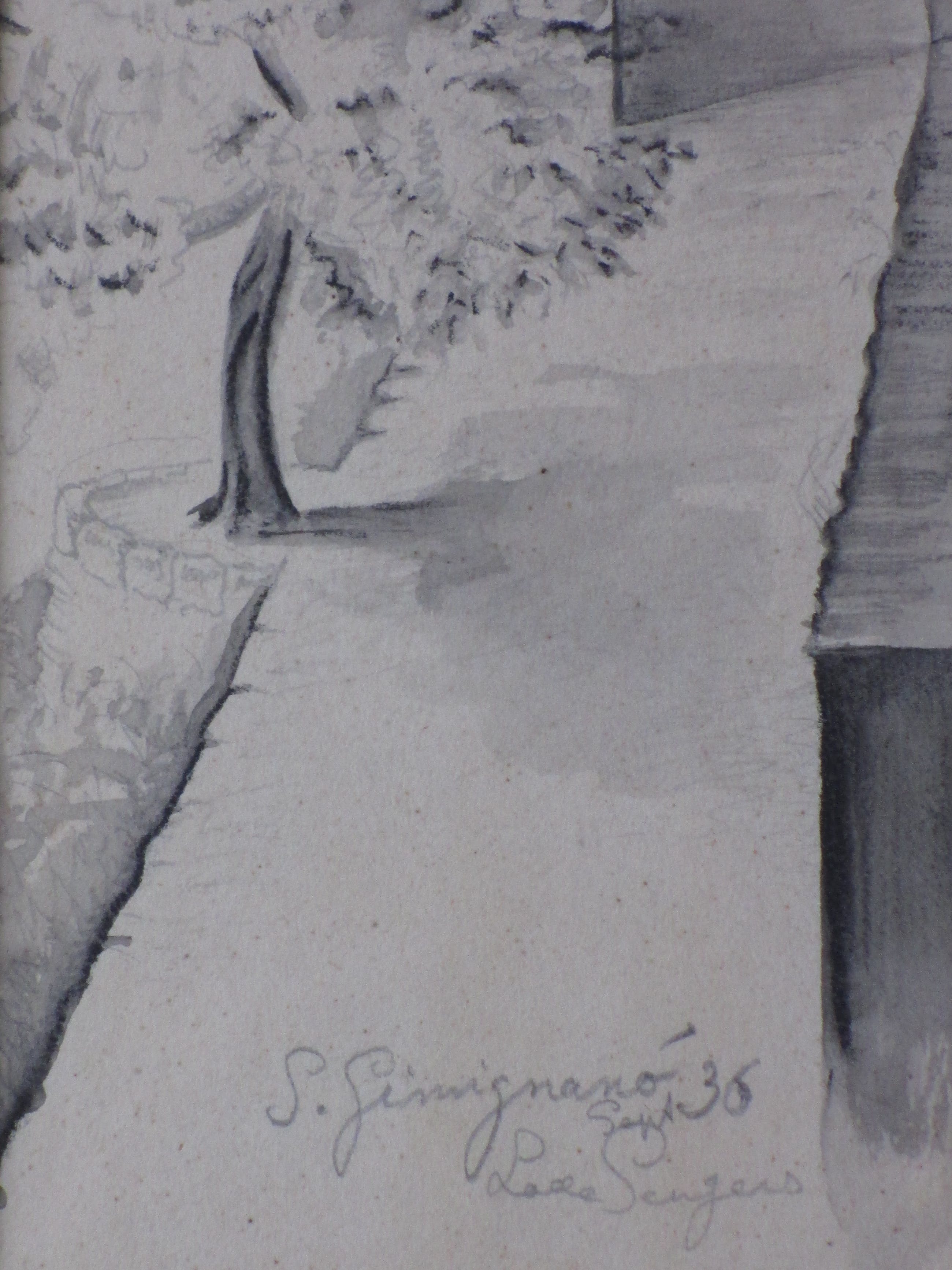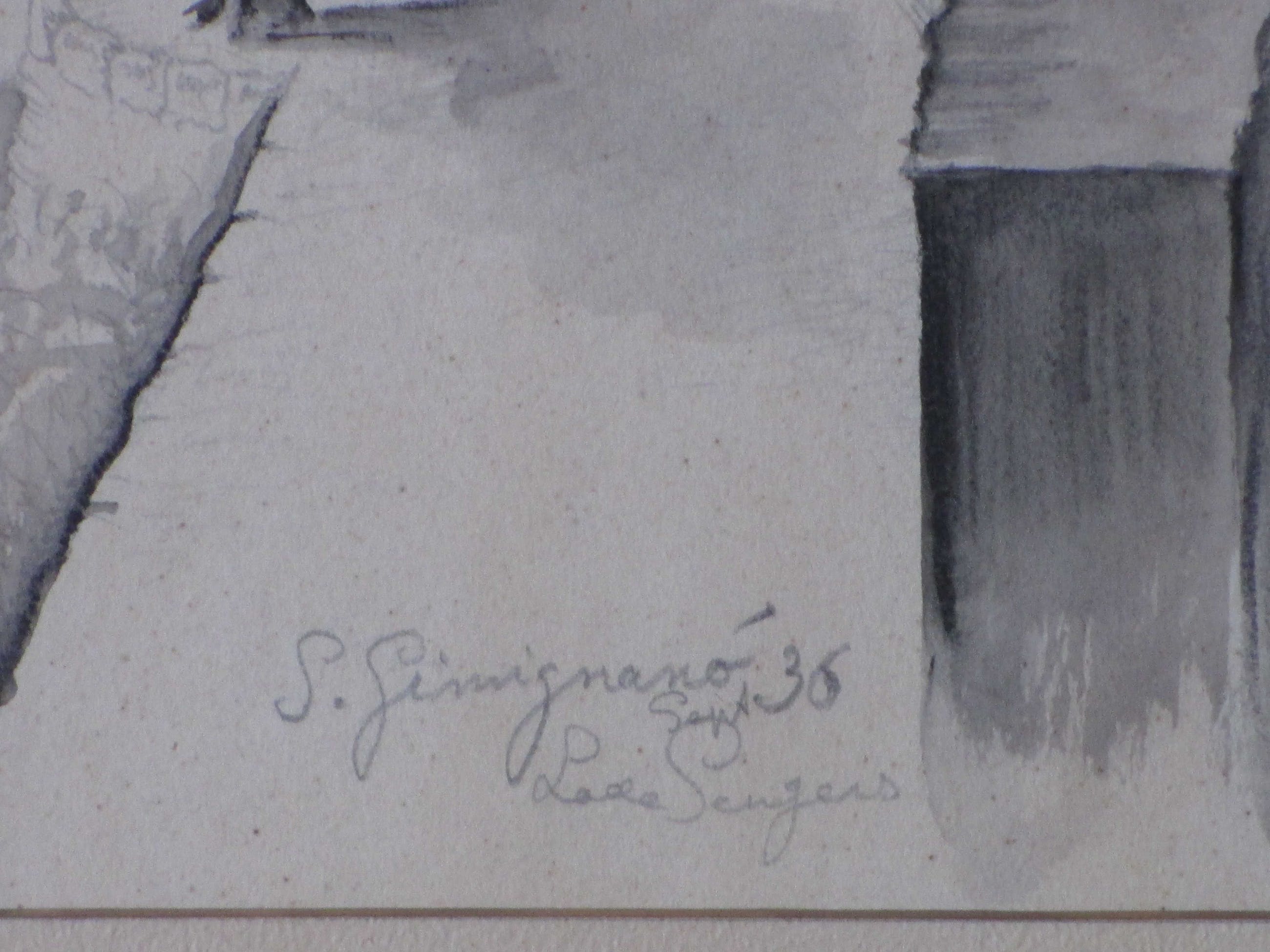 Voorstelling van een straatbeeld in San Gimignano. Gelijst, beeldmaat 30x15, lijstmaat 53x35 Gesigneerd, getiteld en gedateerd m.o.: 'Lode Sengers, San Gimignano Sept '36' Authenticiteit volledig gegarandeerd.