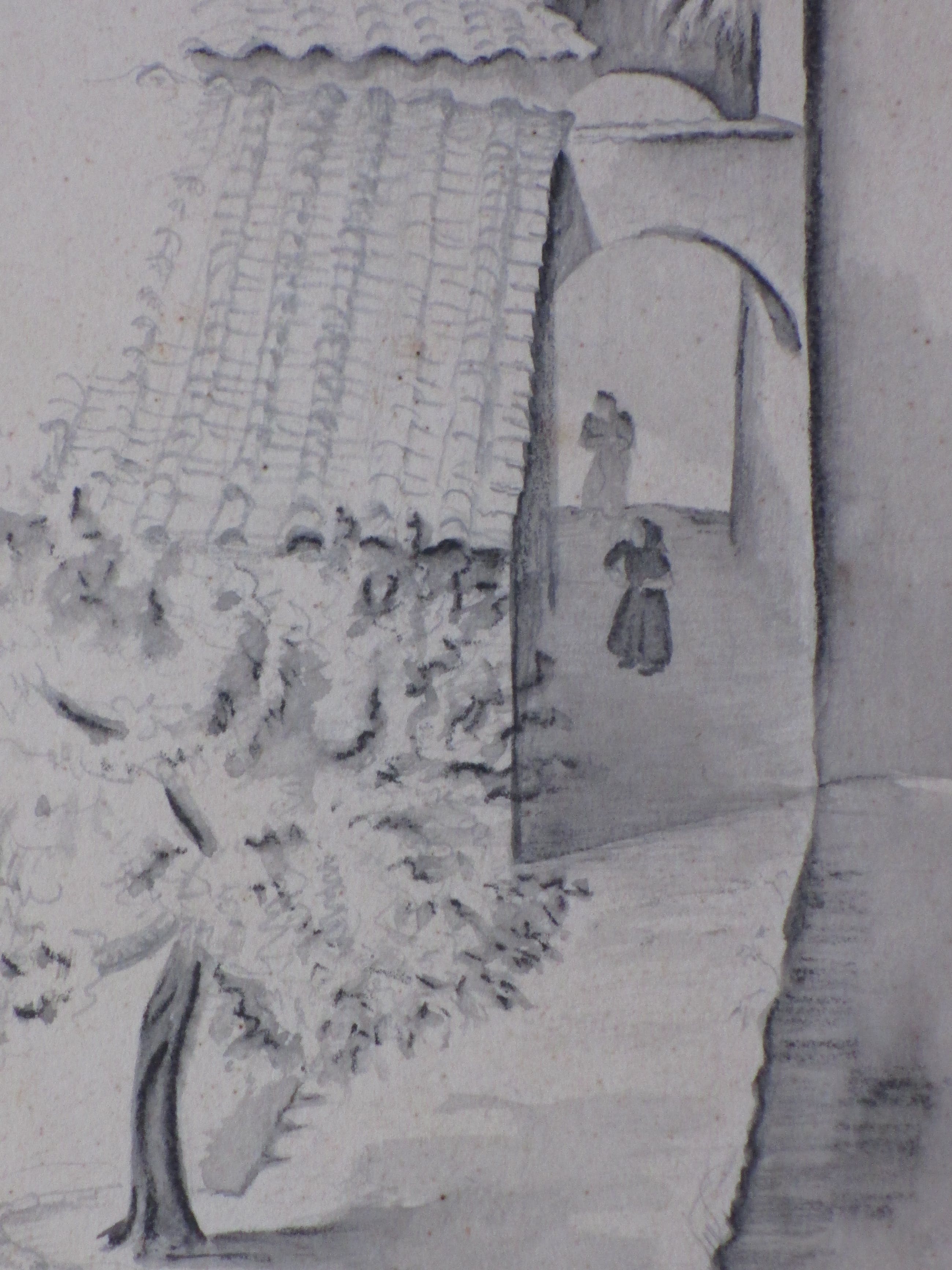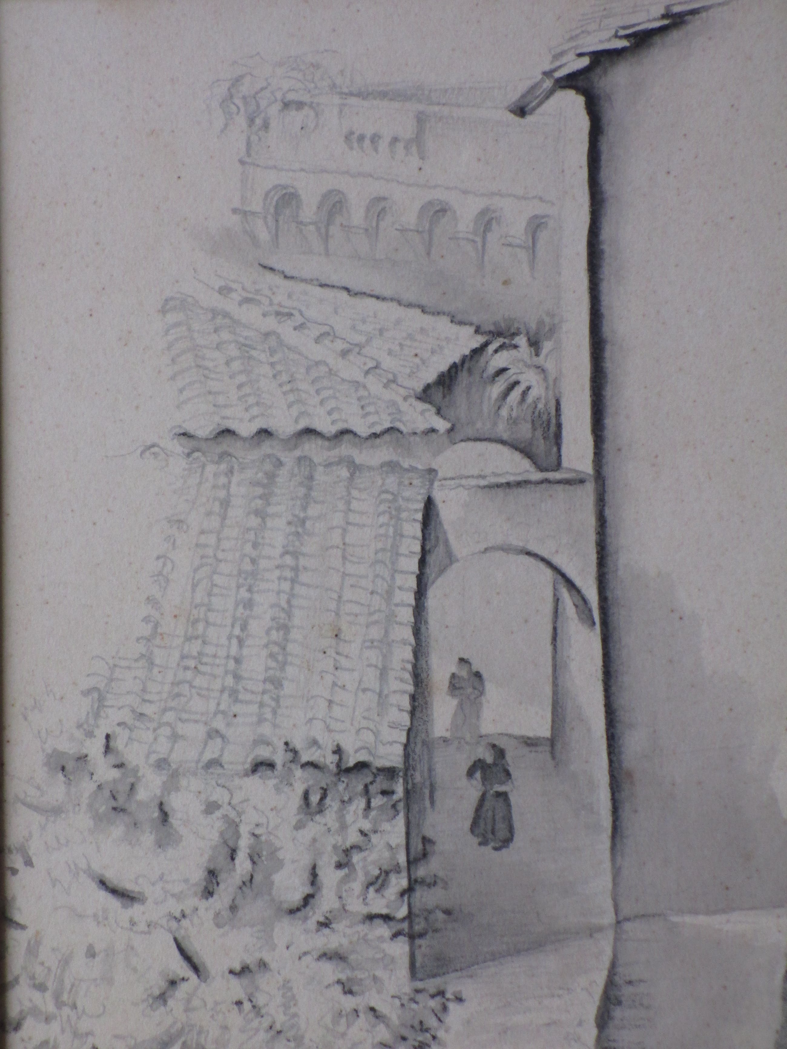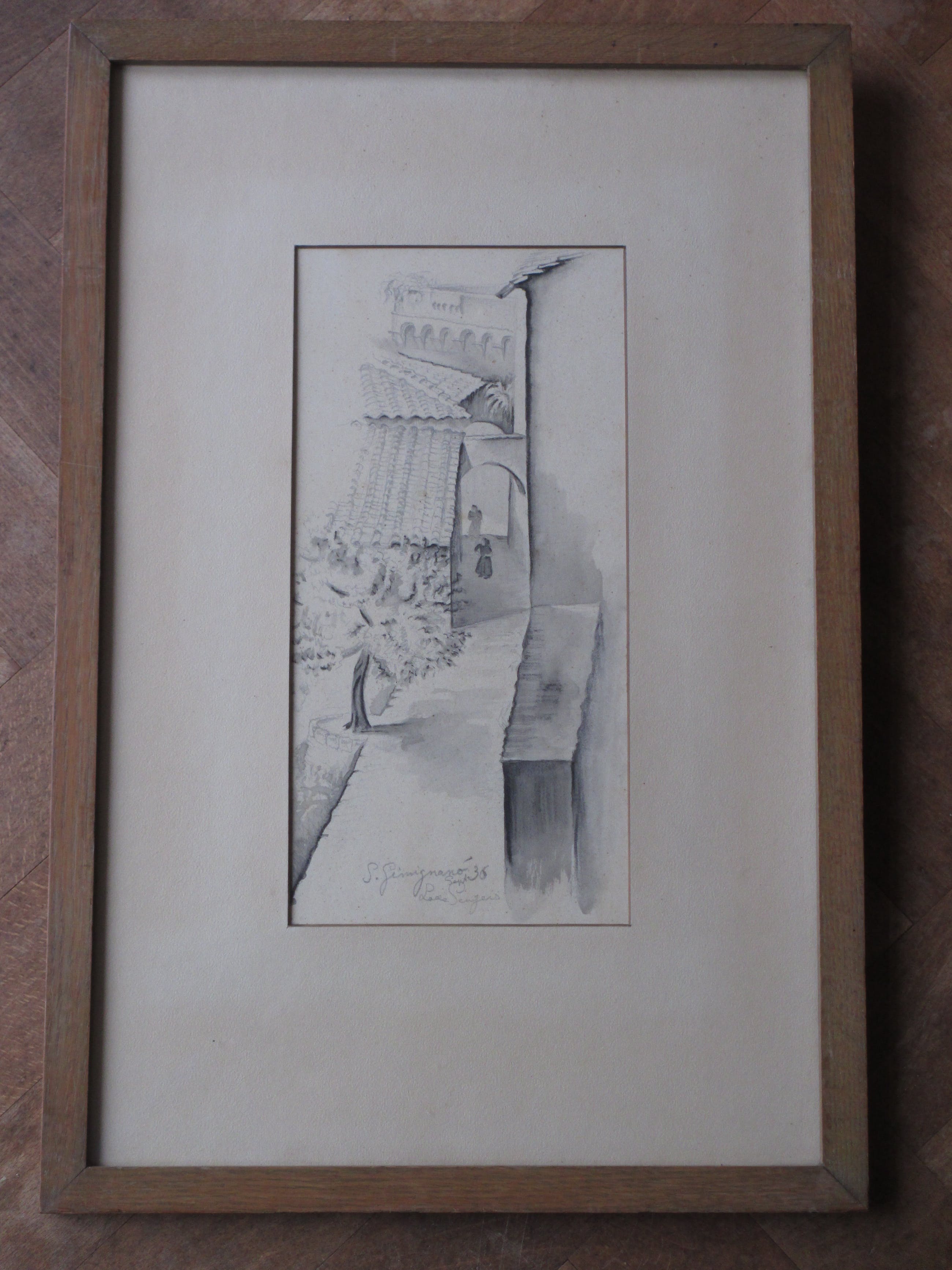 Voorstelling van een straatbeeld in San Gimignano. Gelijst, beeldmaat 30x15, lijstmaat 53x35 Gesigneerd, getiteld en gedateerd m.o.: 'Lode Sengers, San Gimignano Sept '36' Authenticiteit volledig gegarandeerd.