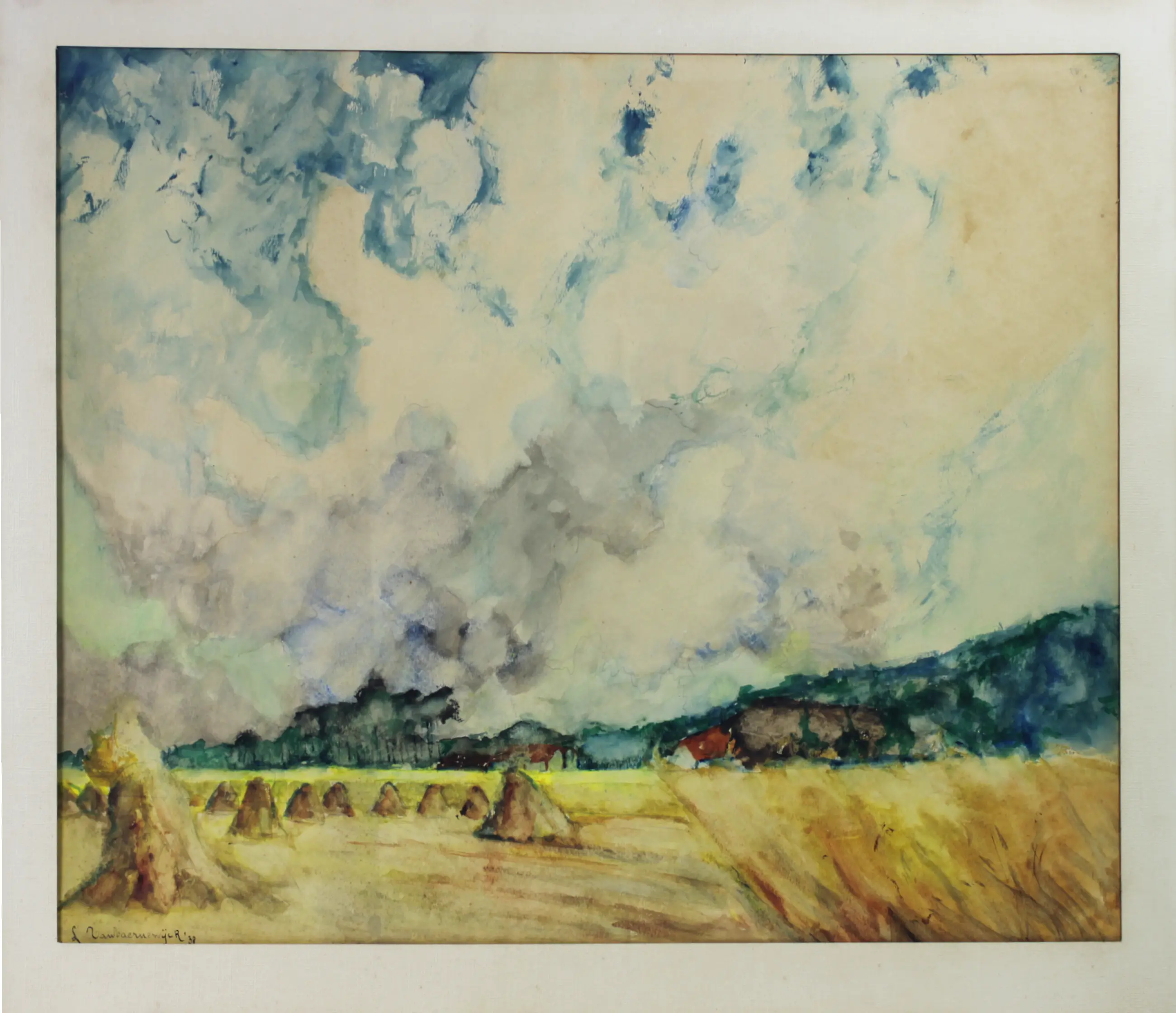 Lode van Vaernewijck, autodidact, dichterlijk schilder van lucht en wolken boven de schelde en boten in de mist. Hier zie je een landschap, gloeiende akkers met korenschoven in impressionistische stijl,