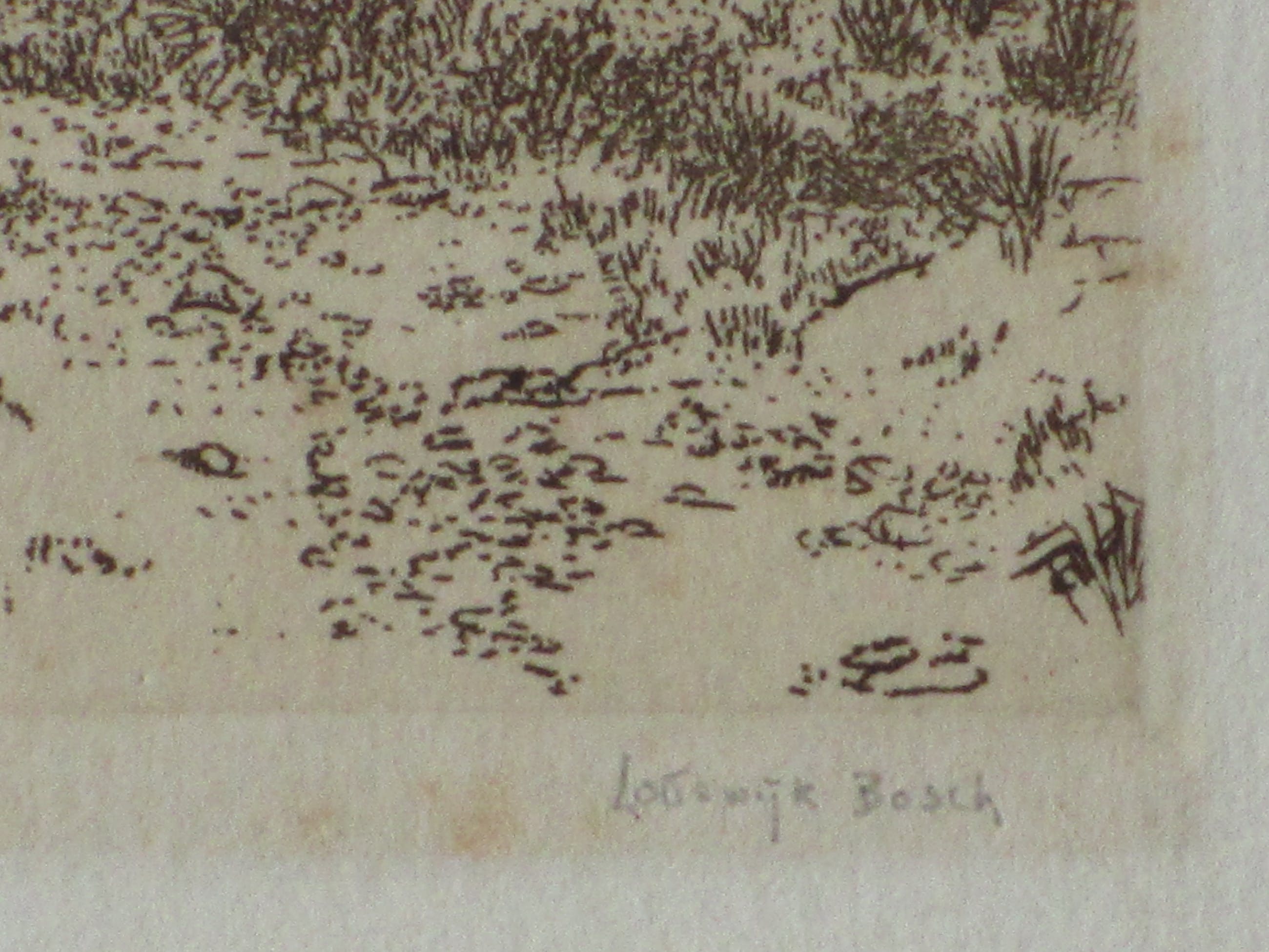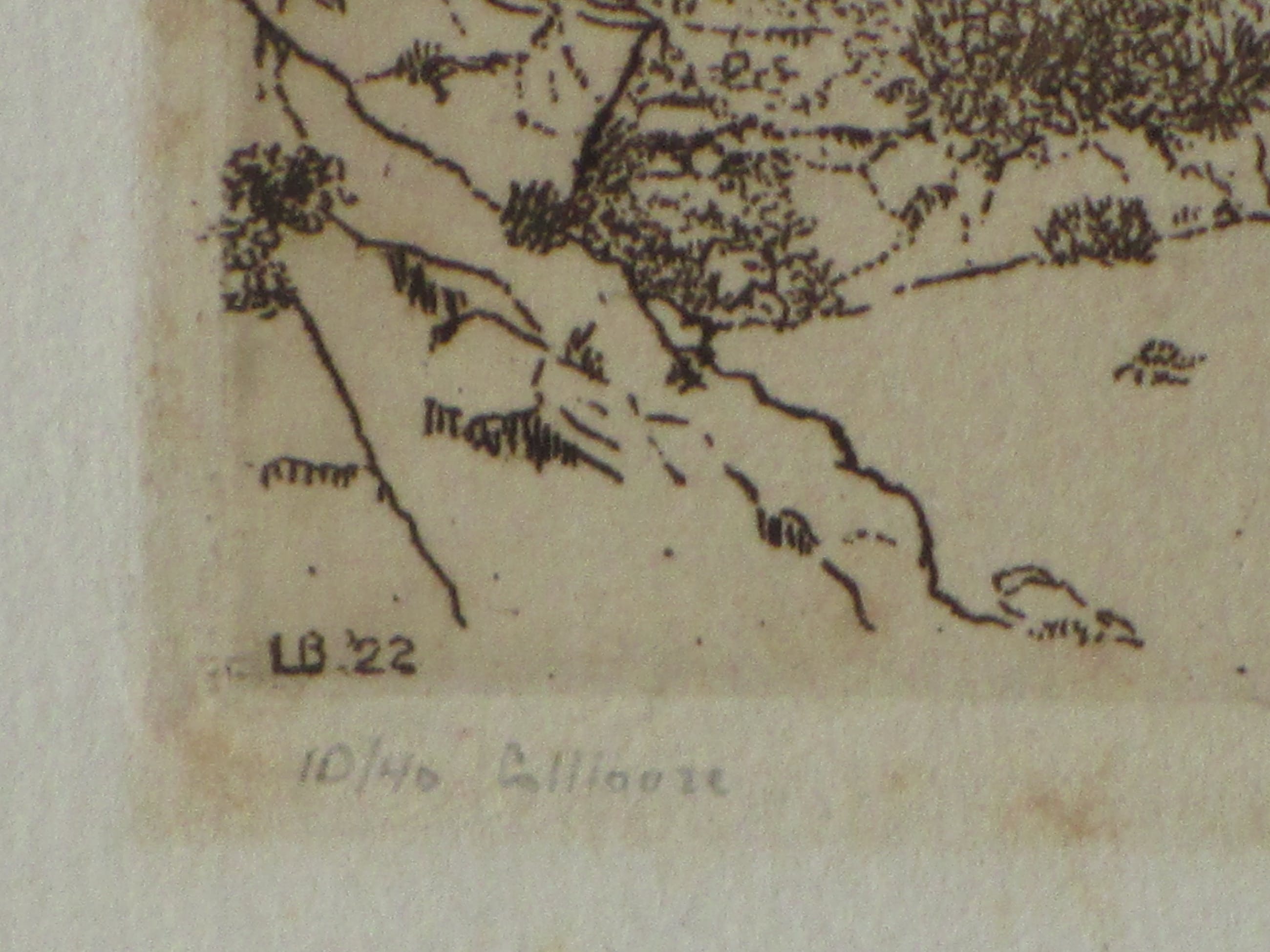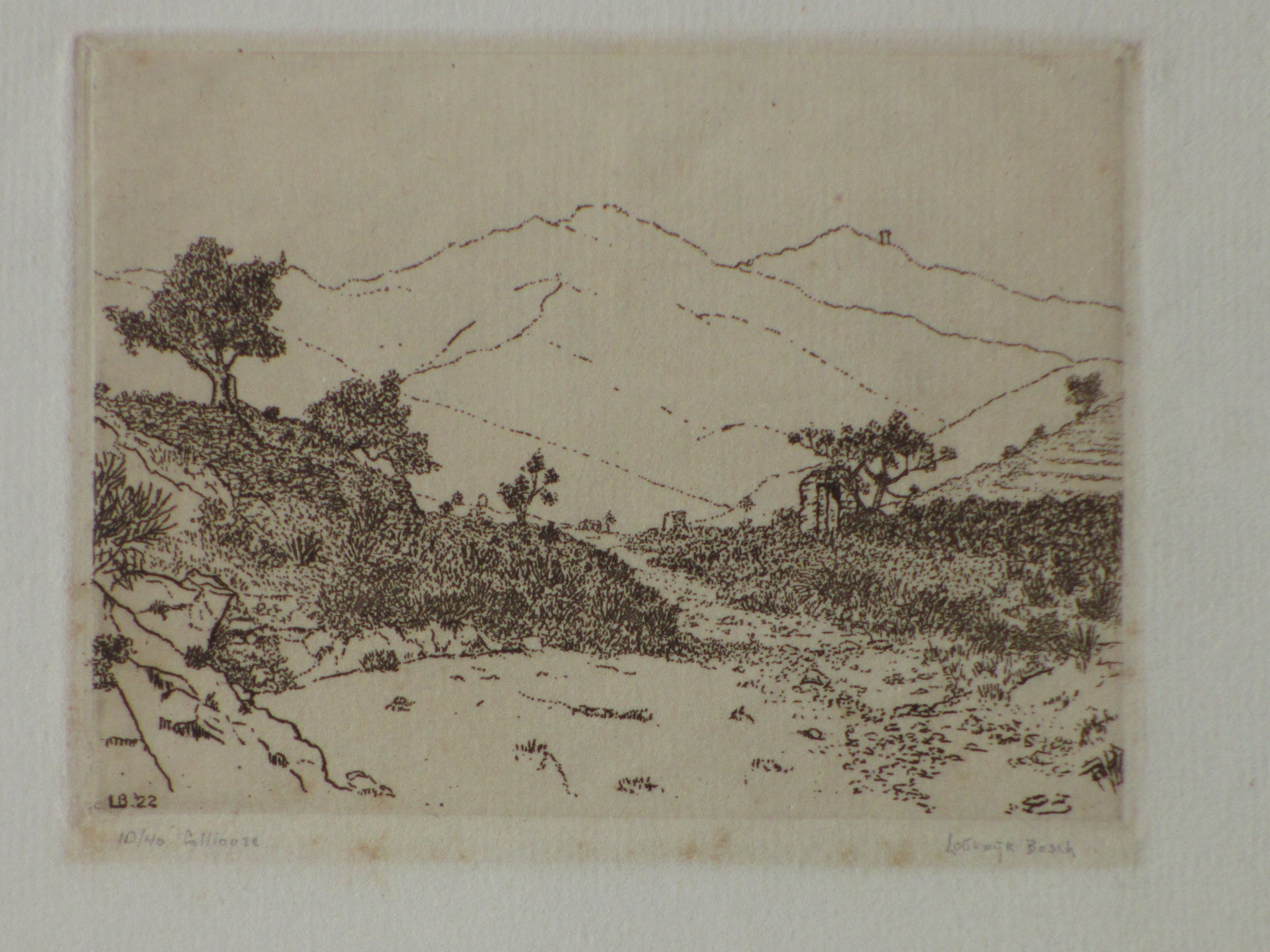 Droge naald ets door Lodewijk Bosch Voorstelling van een landschap bij Collioure Losbladig, beeldmaat 9x11,5, bladmaat 14x19,5 Gesigneerd in potlood r.o. 'Lodewijk Bosch' Genummerd en getiteld in potlood l.o. '10/40' en 'Collioure' Gemonogrammeerd en gedateerd l.o. in de druk 'L.B.' en '22' Authenticiteit volledig gegarandeerd