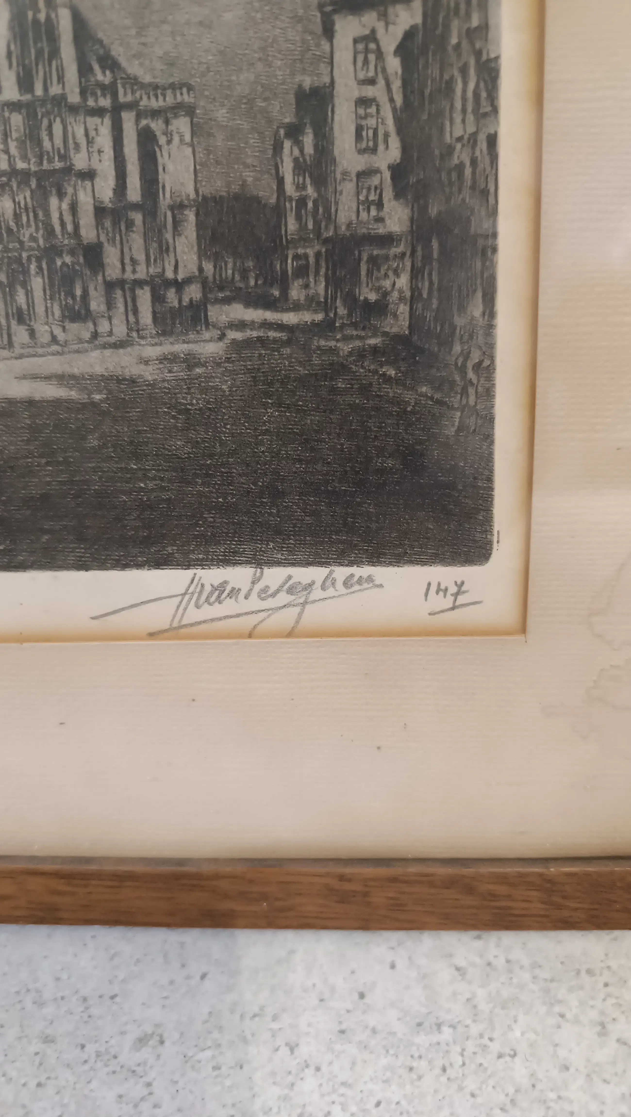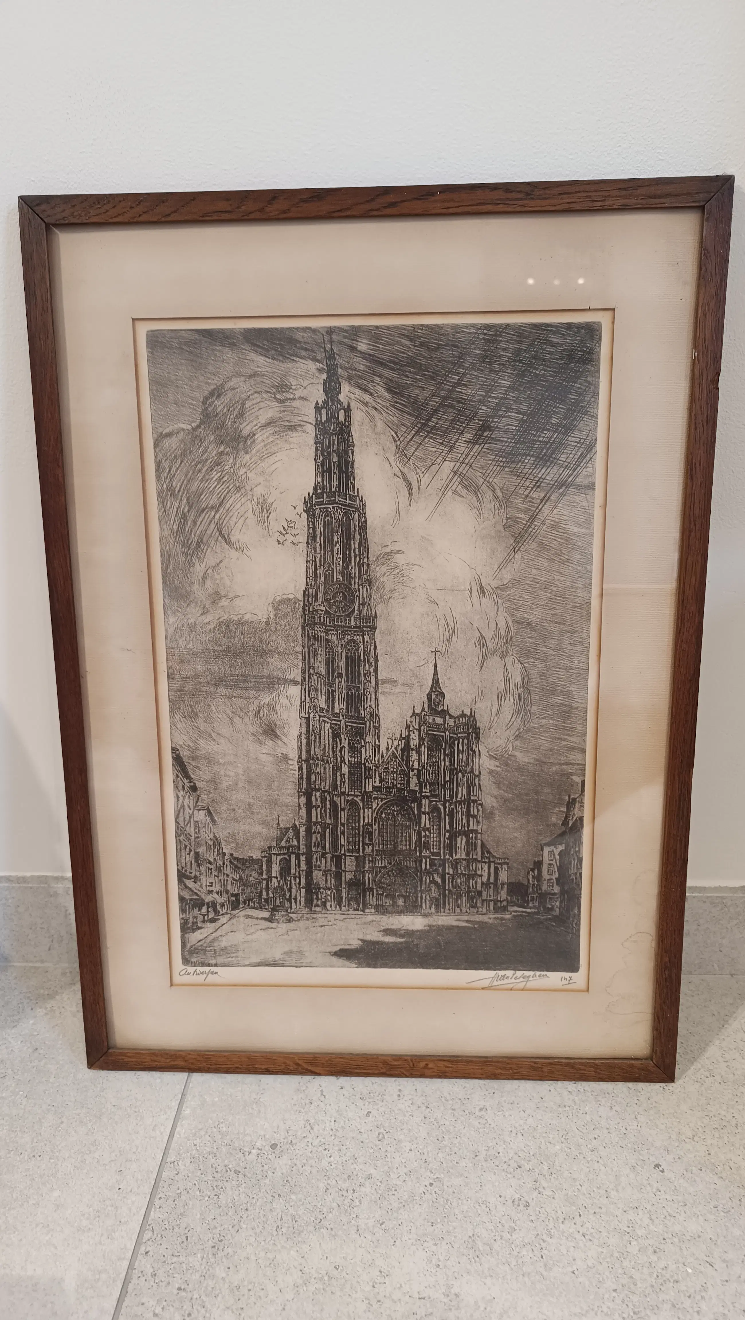 Dit ingelijste kunstwerk is een gedetailleerde ets van de Onze-Lieve-Vrouwekathedraal in Antwerpen. Het toont het imposante gotische kerkgebouw dat tussen 1352 en 1521 werd gebouwd. De kathedraal is beroemd om haar 123 meter hoge noordertoren, de hoogste kerktoren in de Benelux. Periode: De kunstenaar was actief gedurende de gehele tweede helft van de 19e eeuw. Specifieke versies van dit stadsgezicht op de kathedraal vanaf de Grote Markt worden vaak geplaatst in de late 19e eeuw. Techniek: Het betreft een ets, een grafische techniek die in die periode veelvuldig werd gebruikt voor gedetailleerde architecturale afbeeldingen. Onderwerp: De afbeelding toont de iconische toren van de Antwerpse kathedraal, gezien vanuit een historisch perspectief dat populair was bij etsers uit die tijd.